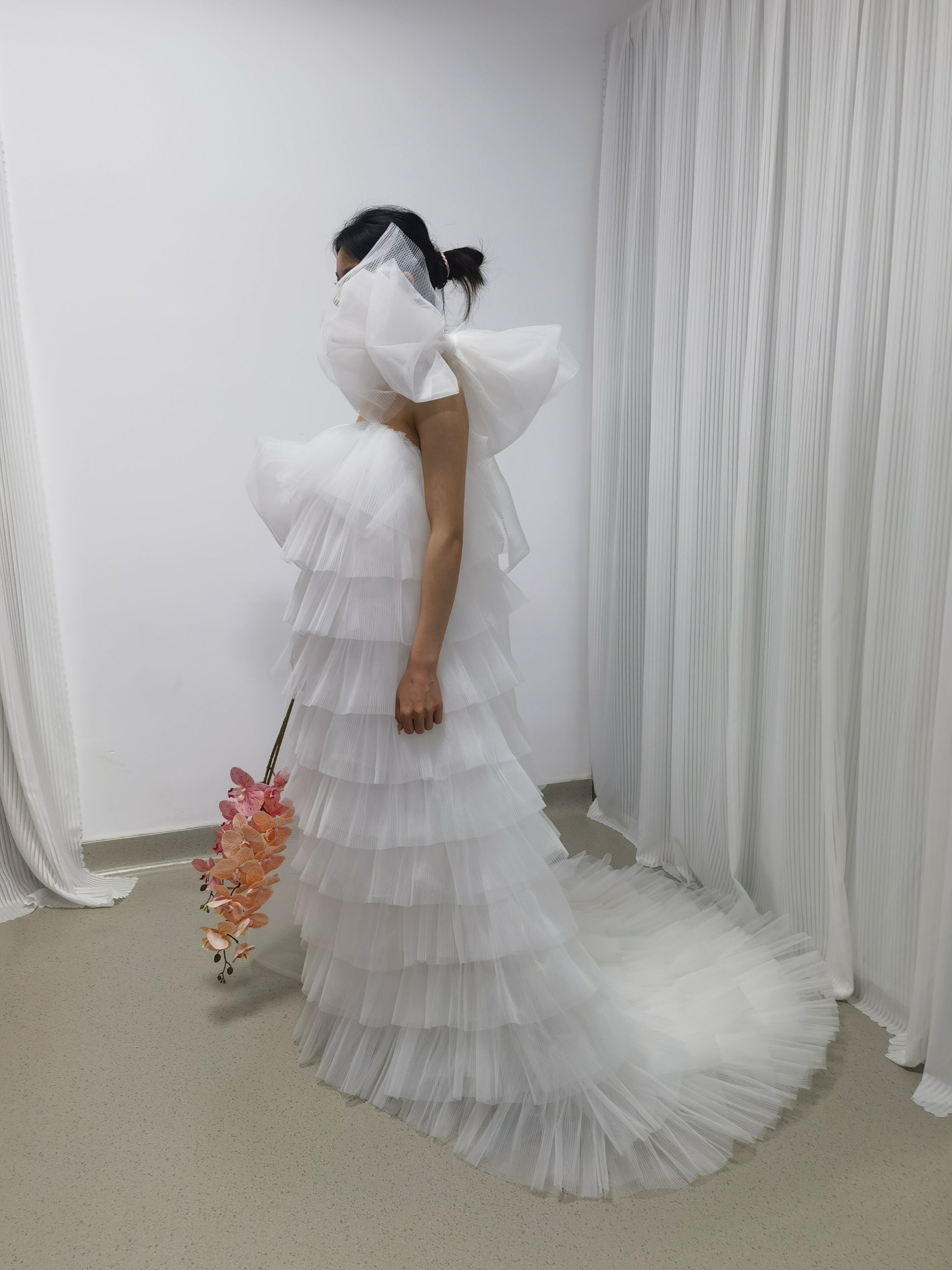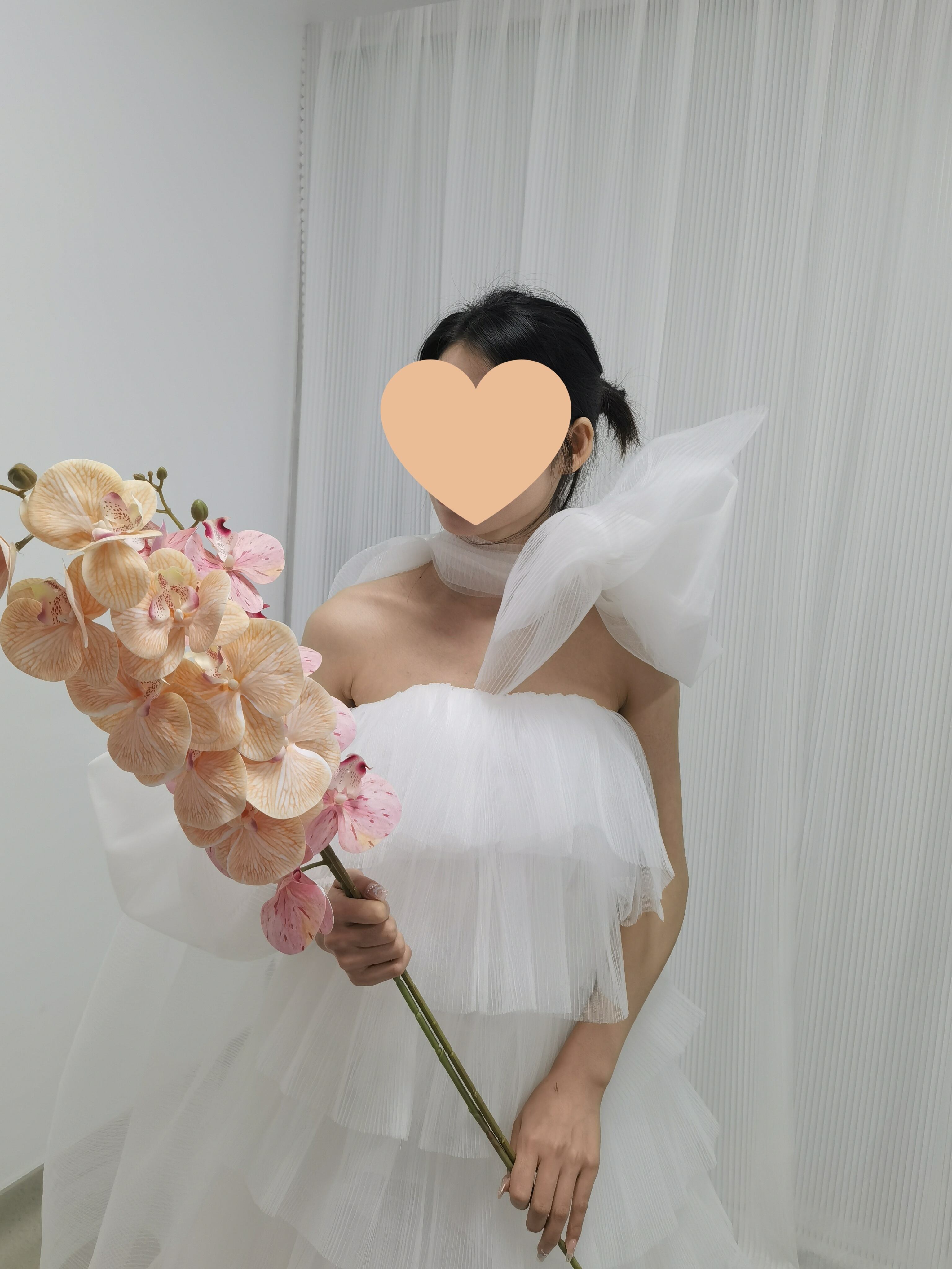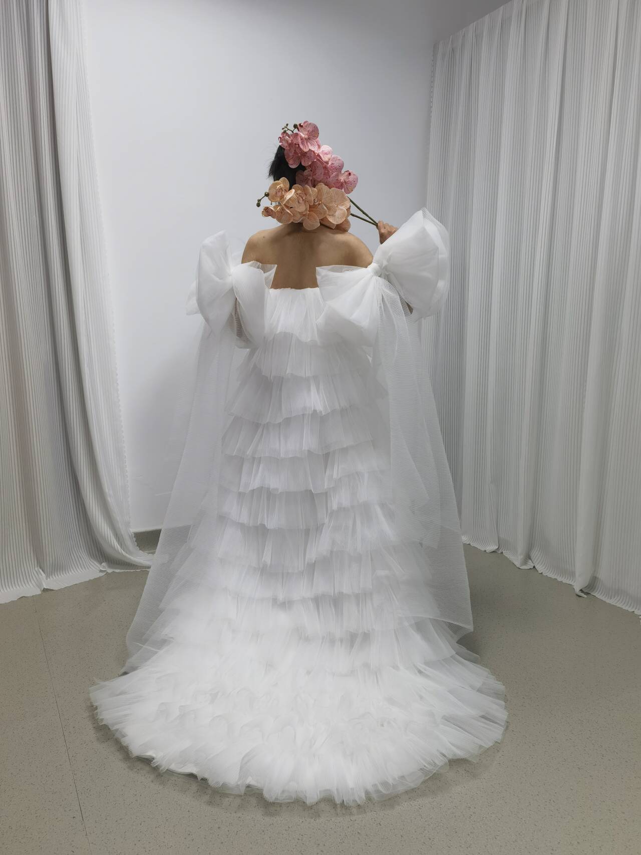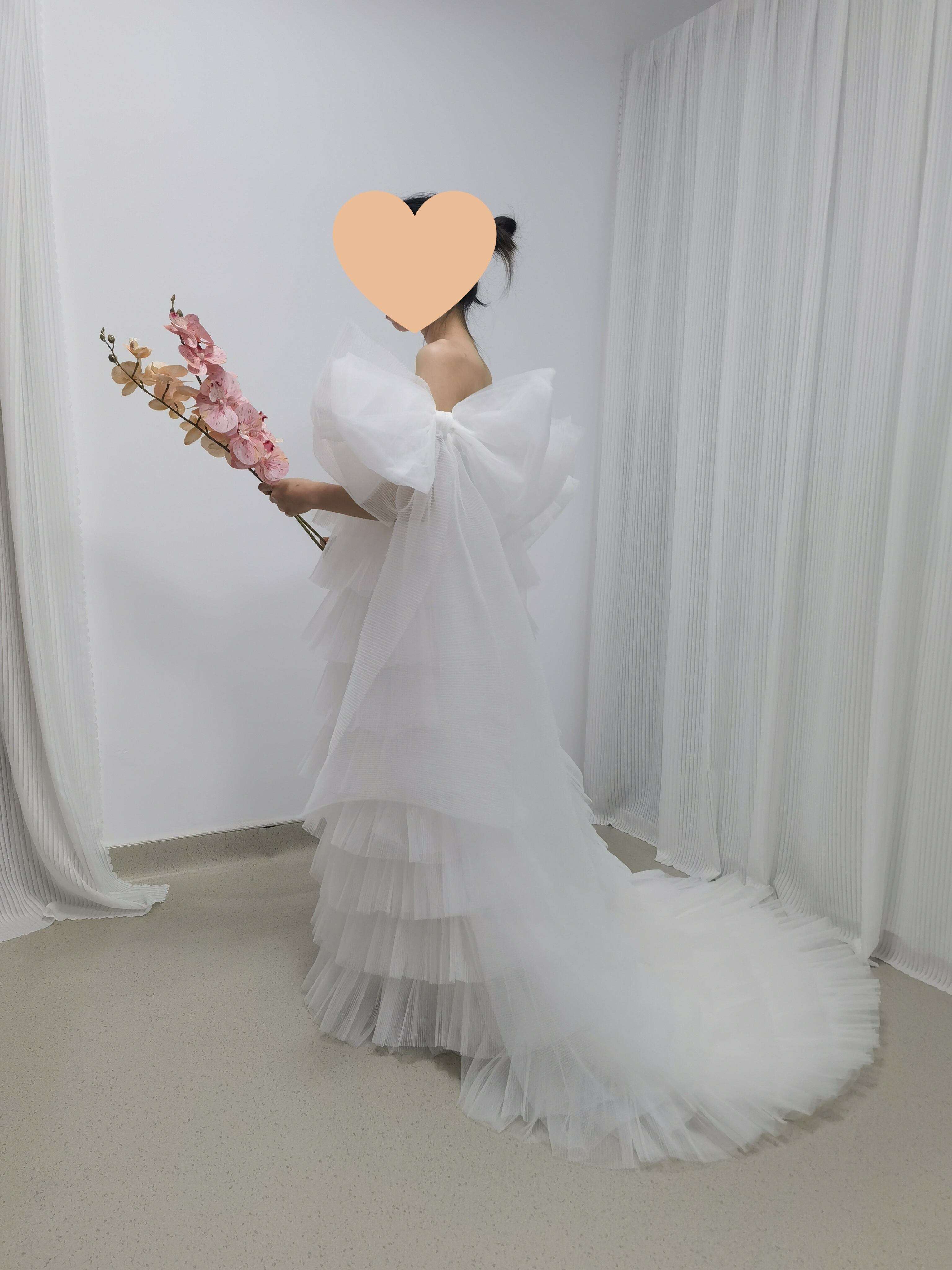 ウェディングドレス ベアトップ 姫袖 リボン 柔らかく重ねたチュールスカート 可愛い オフホワイト