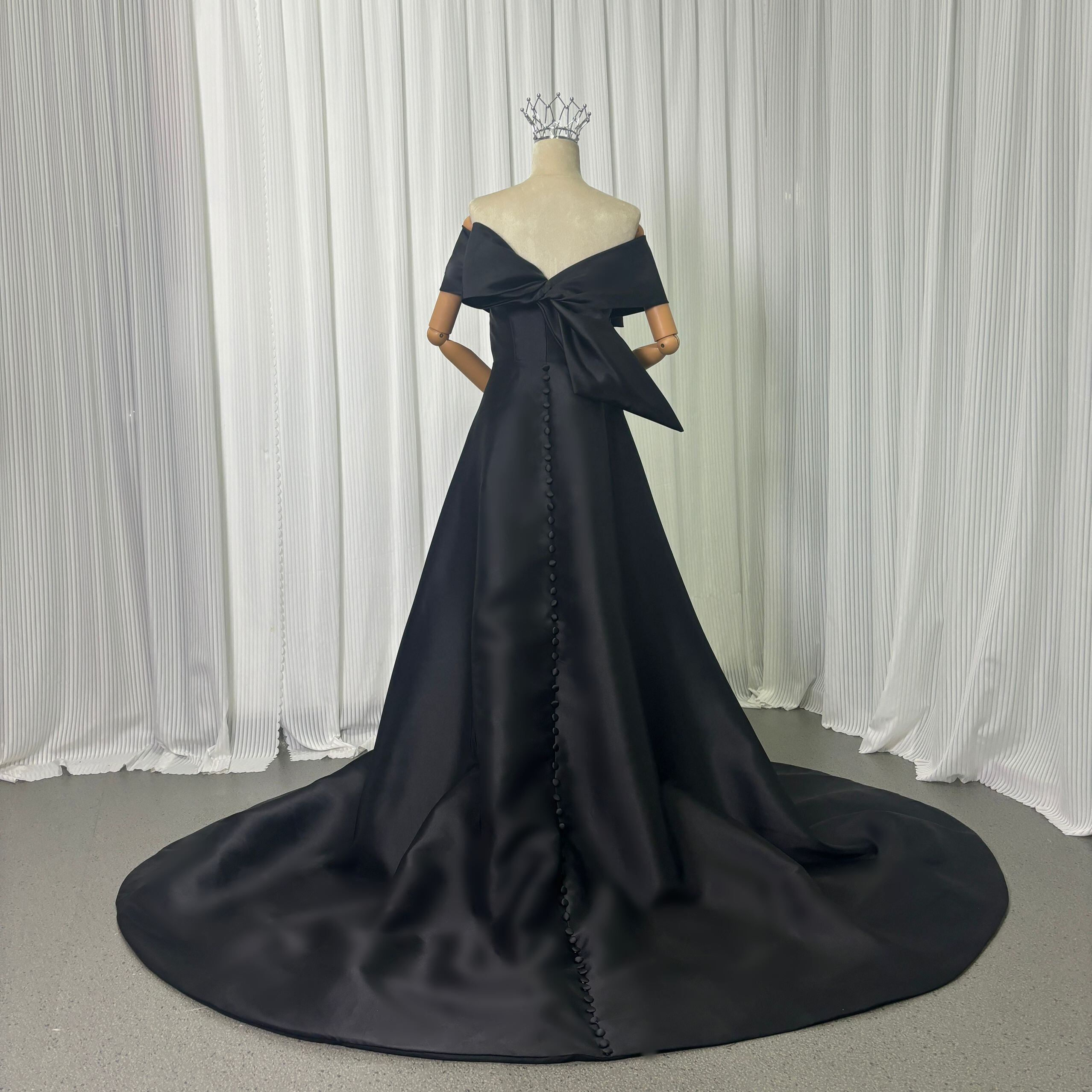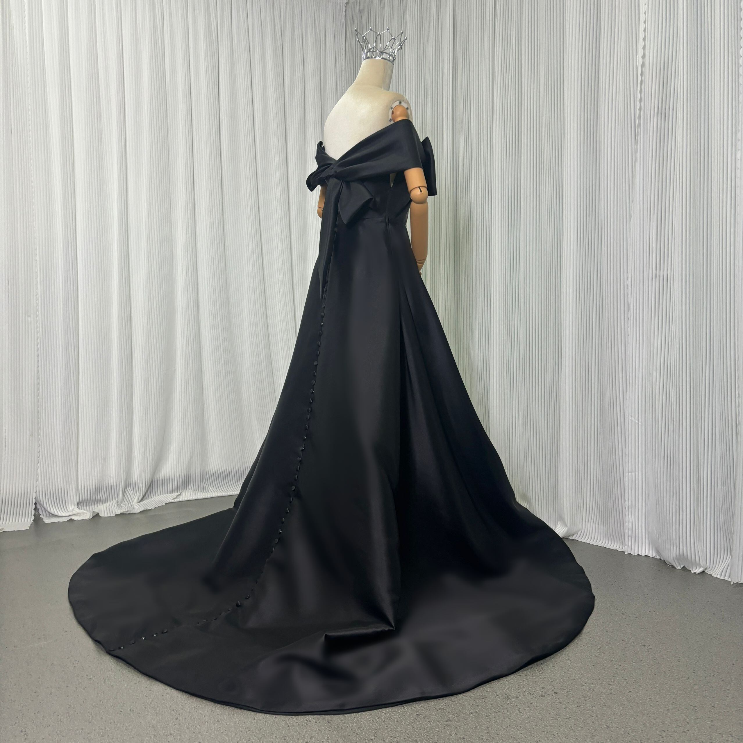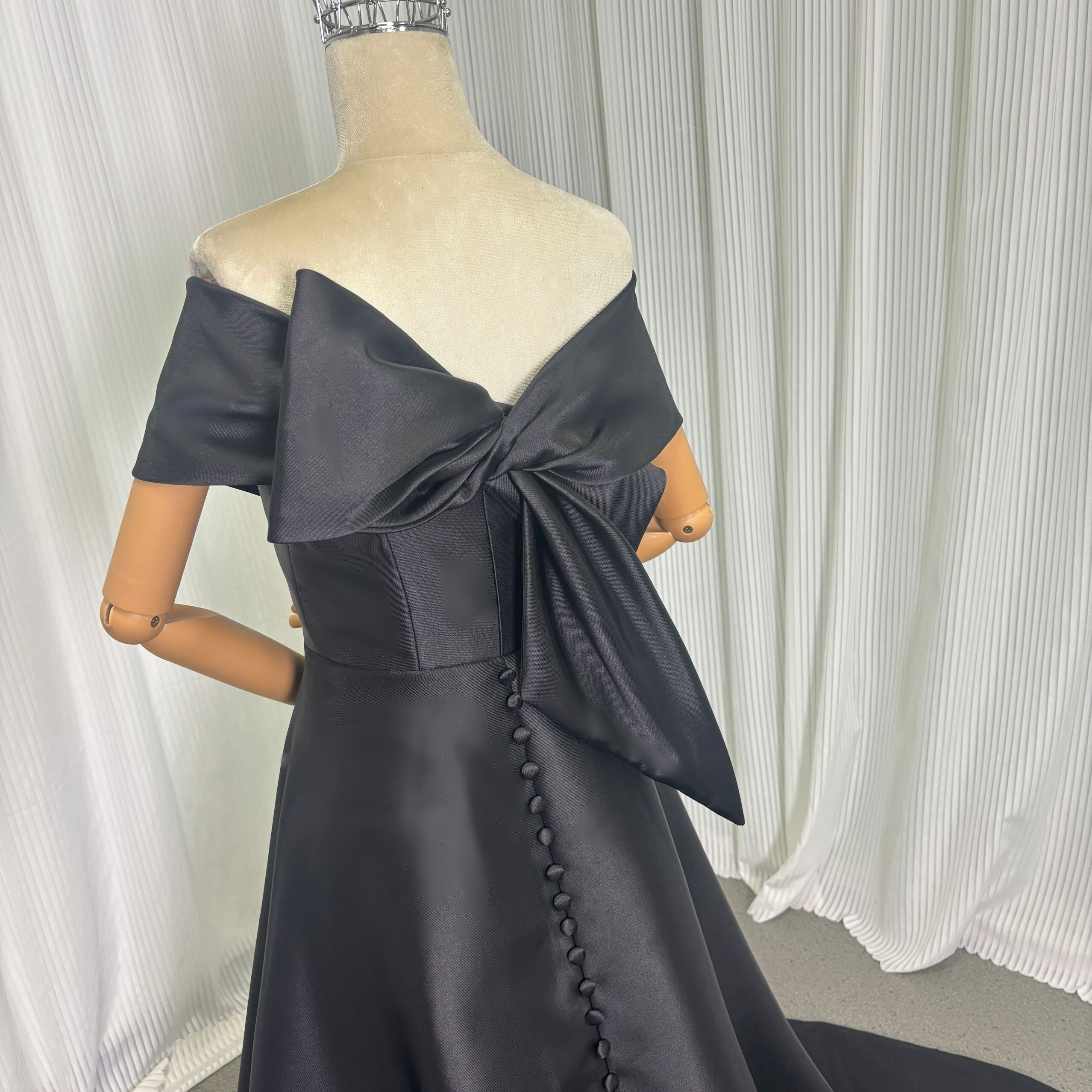 パーティードレス オフショルダー ミカドサテン ブラック 光沢サテン リボン 前撮り 披露宴