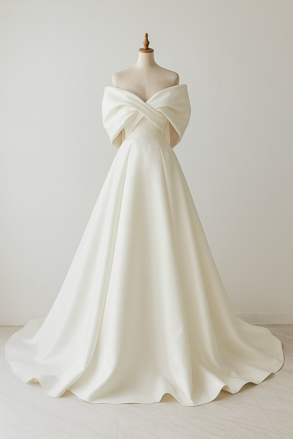 ウェディングドレス オフショルダー Aライン スレンダーライン ハンドドレープ オフホワイト 花嫁