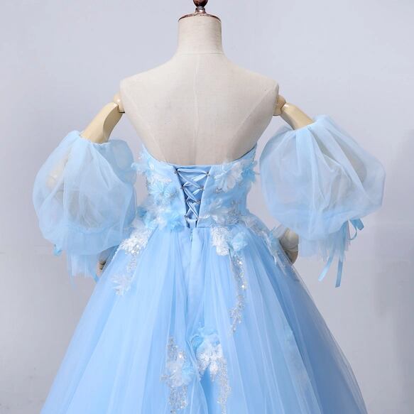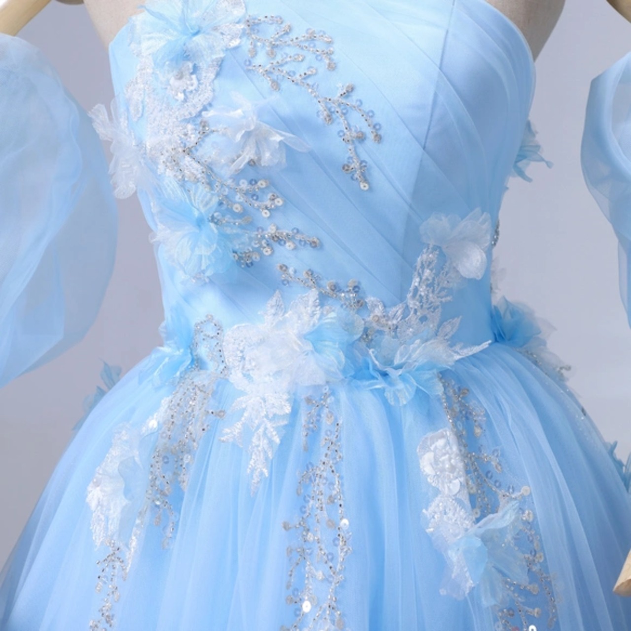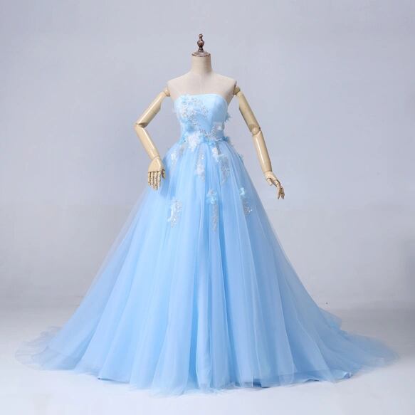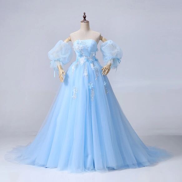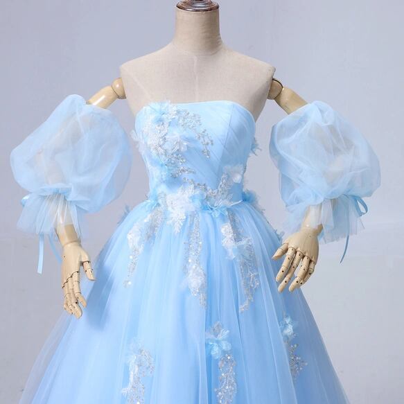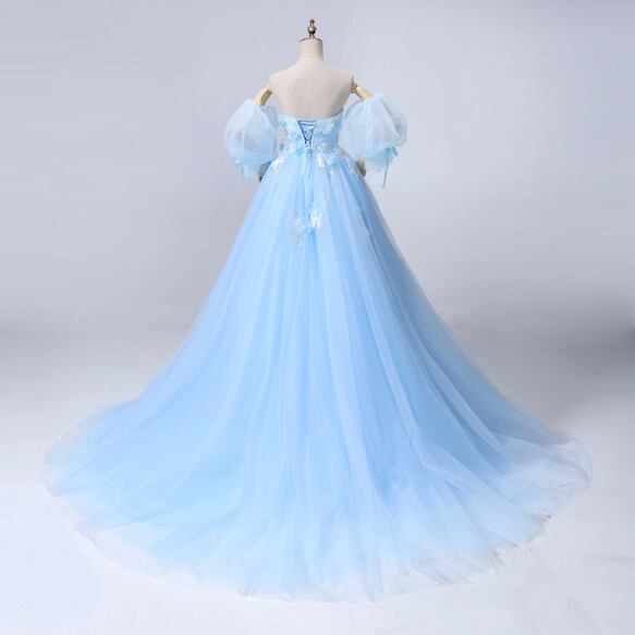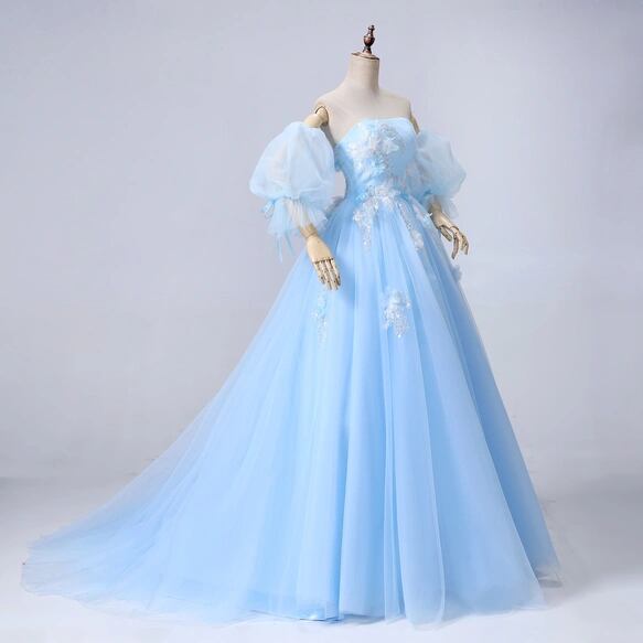 カラードレス ライトブルー パフスリーブ キラキラ光る刺繍 ソフトチュール 編み上げ ブライダル