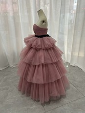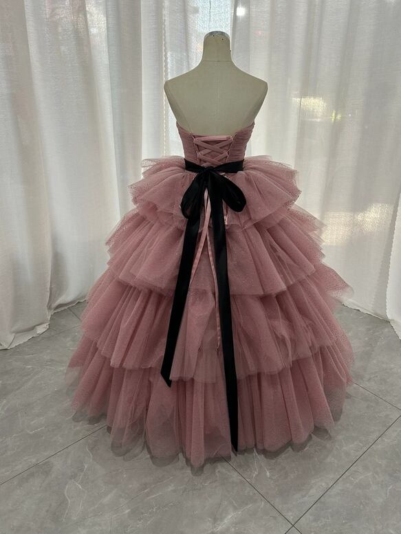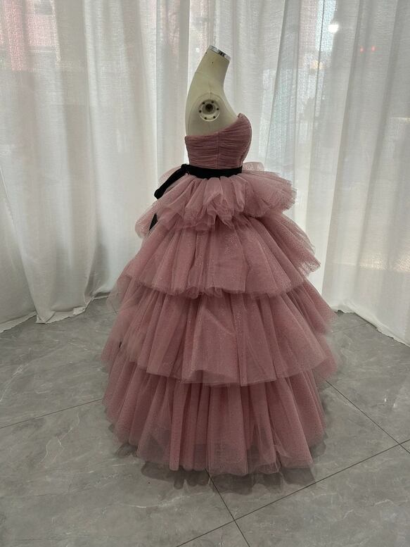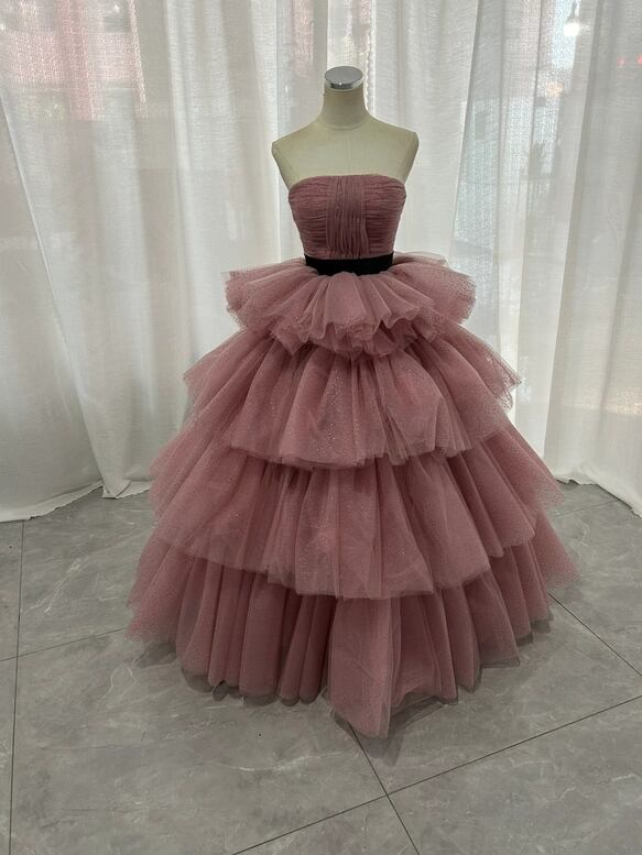 カラードレス ピンク ベアトップ キラキラチュール サッシュベルト ボリュームドレス ロング 花嫁