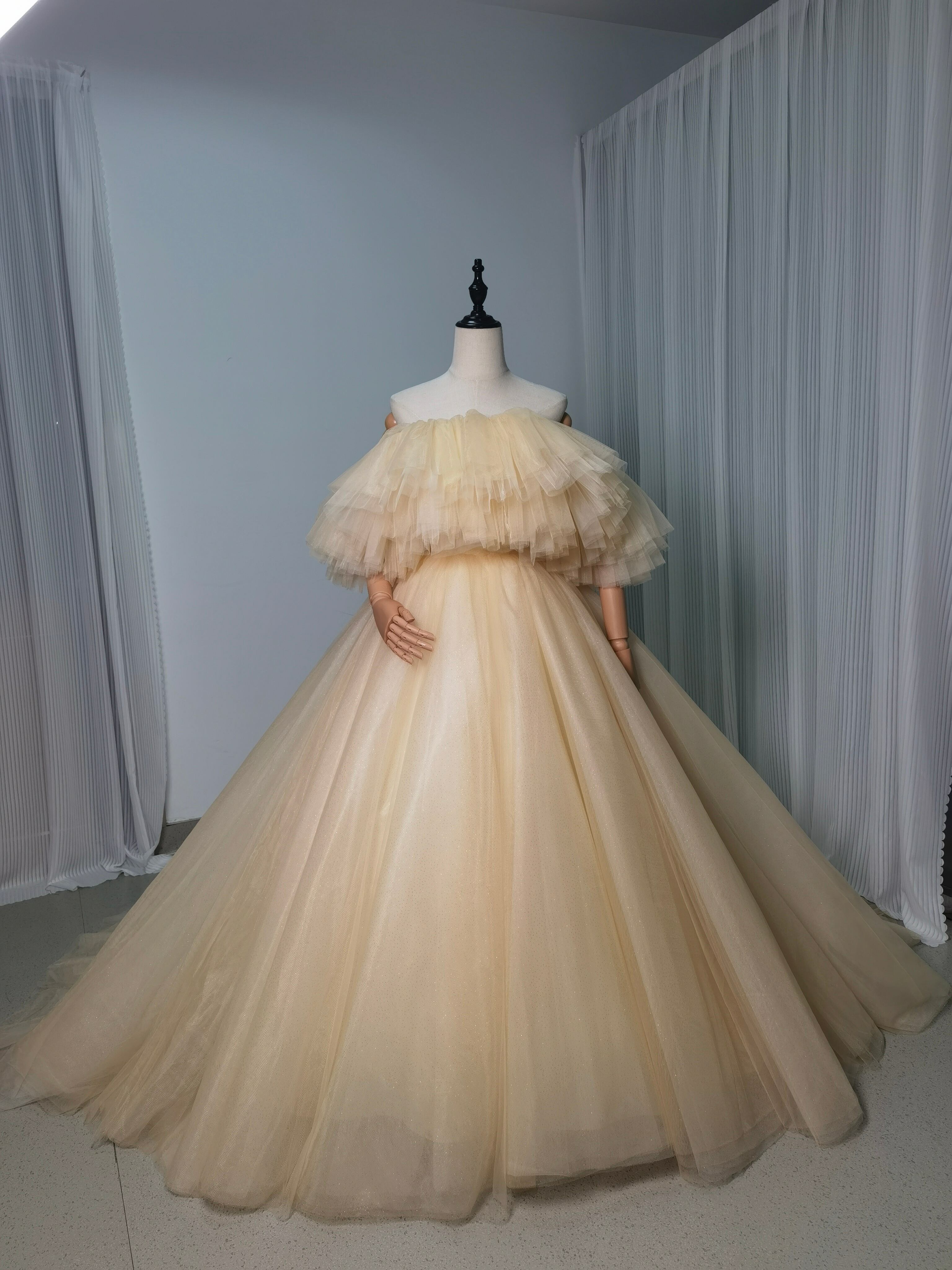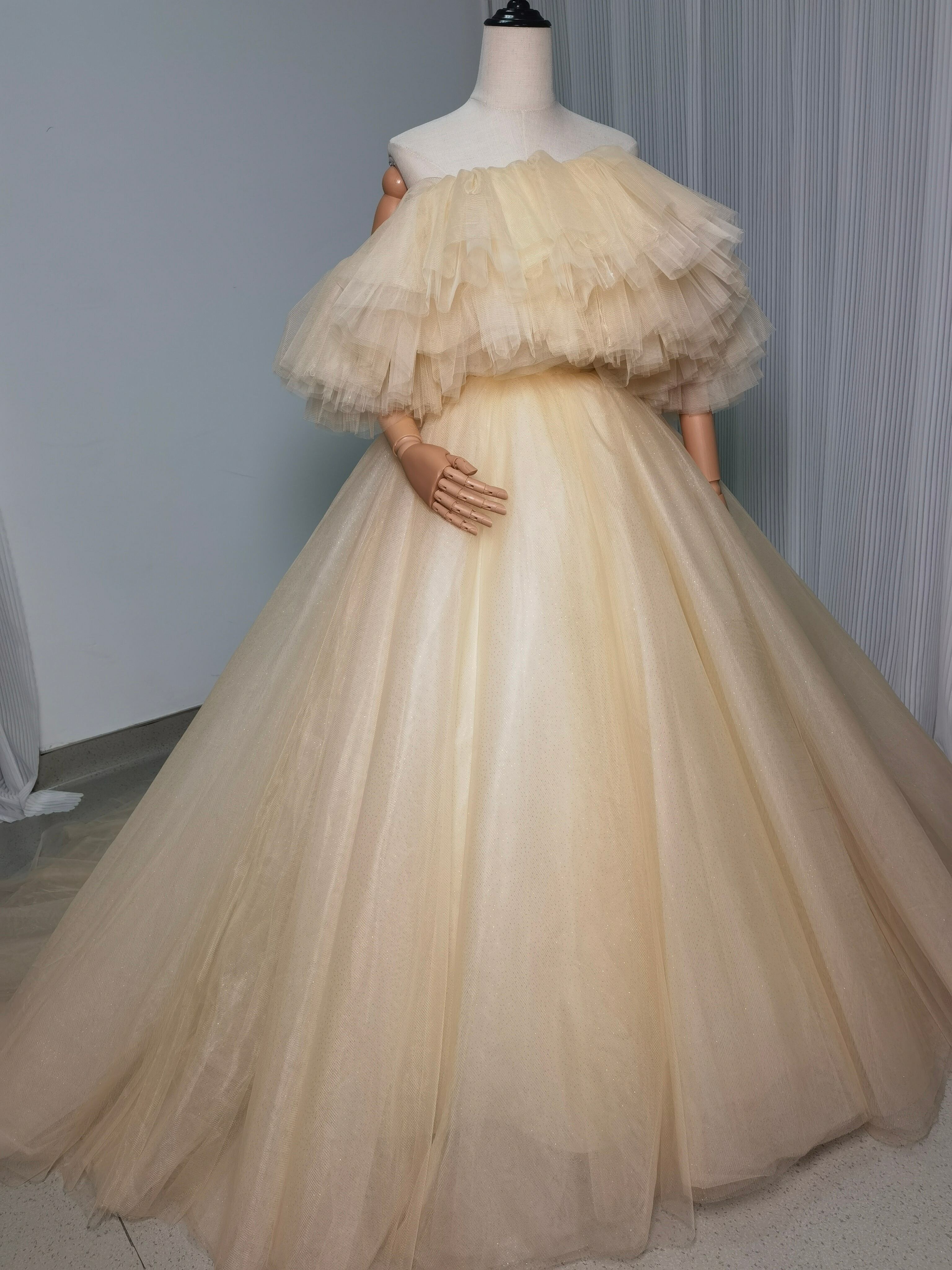 ラッフルケープのオフショルダーシャンパンベージュカラードレス