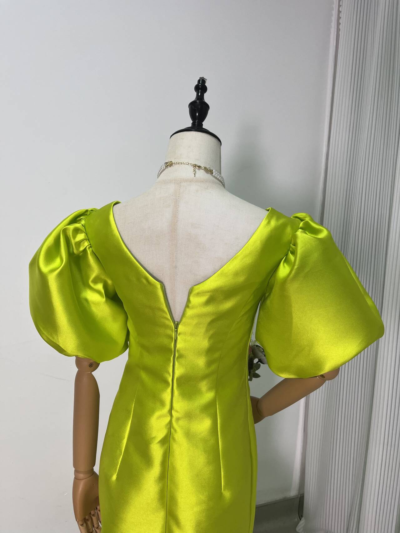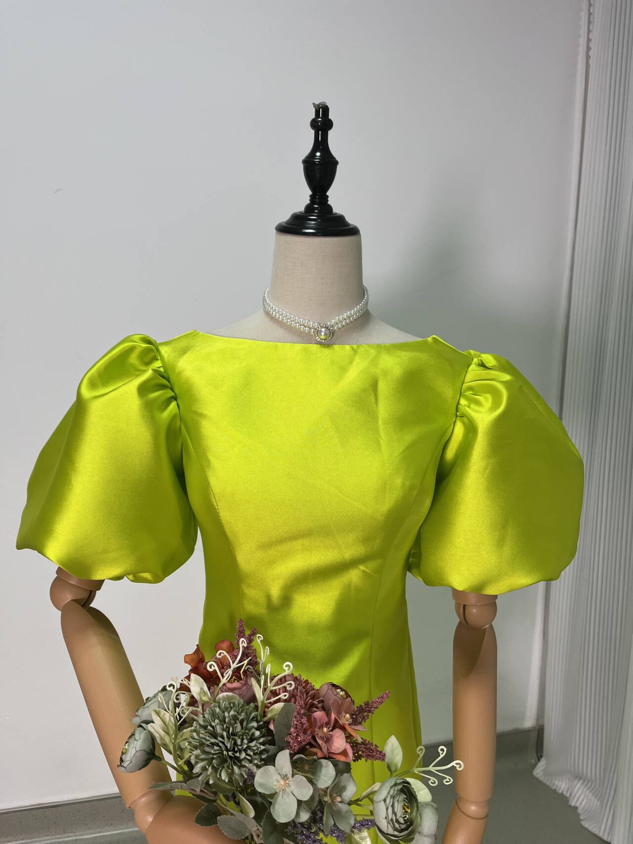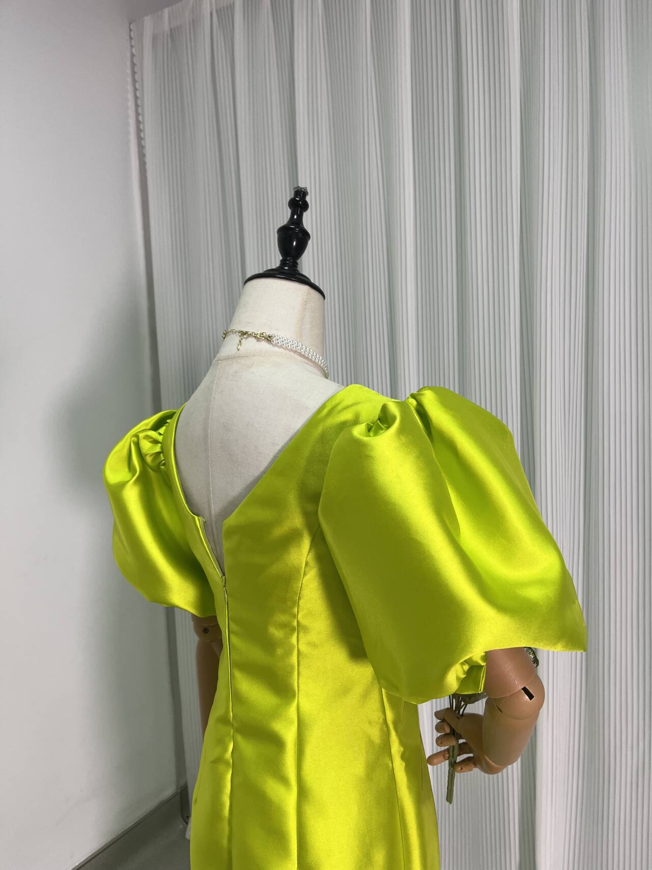 フレンチスリーブ パーティードレス ライムグリーン トレーン 抜群のおしゃれ見え 二次会/合コン/デート