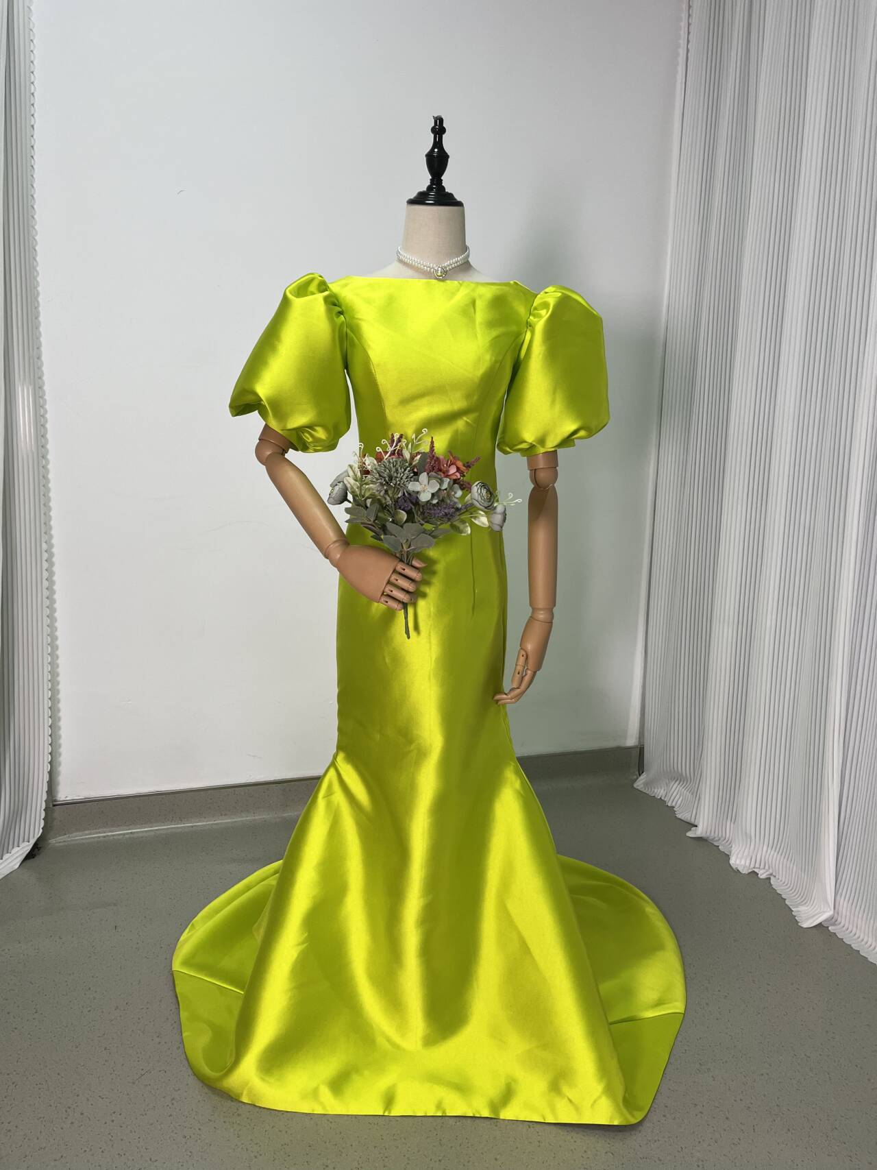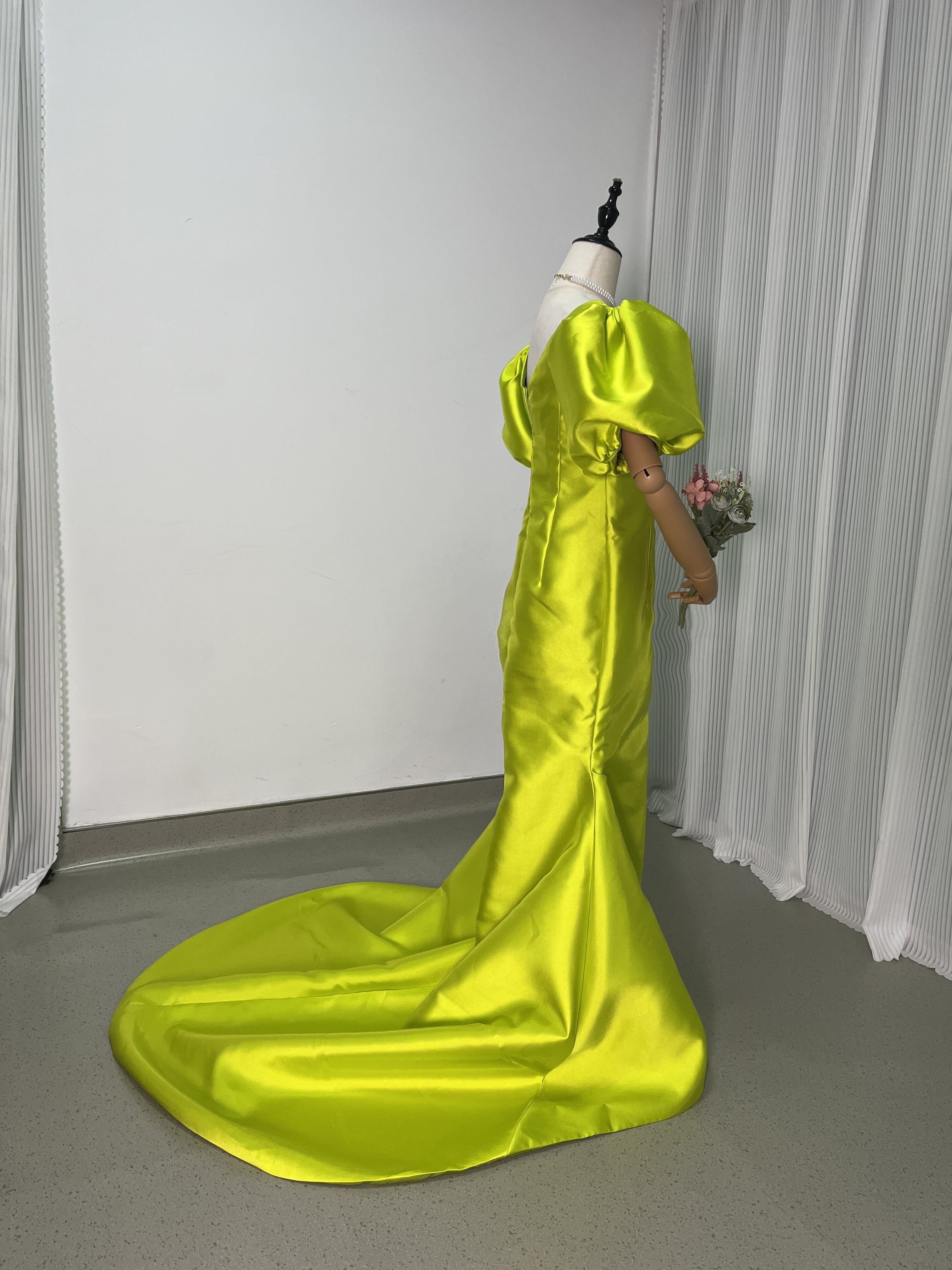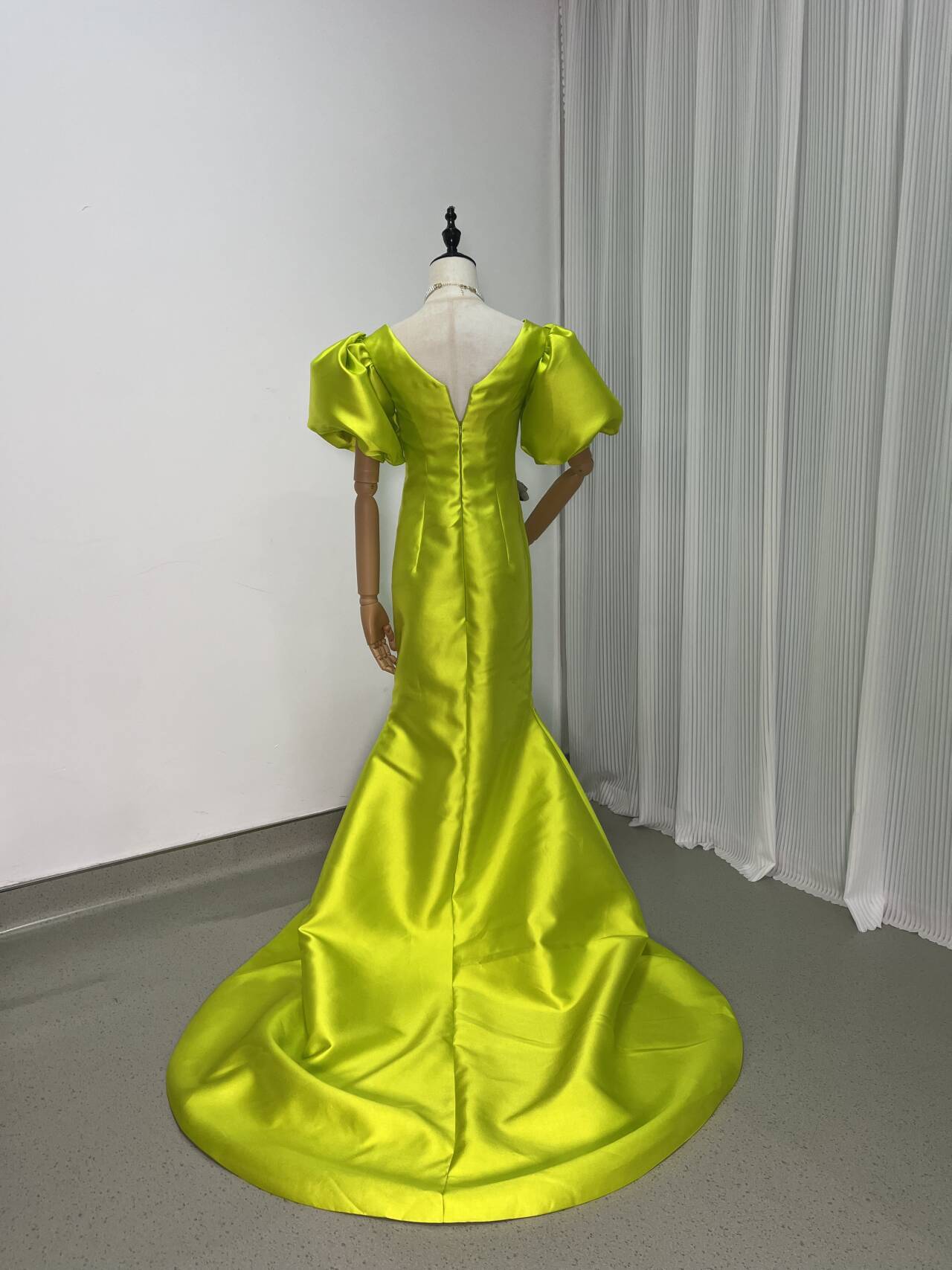 フレンチスリーブ パーティードレス ライムグリーン トレーン 抜群のおしゃれ見え 二次会/合コン/デート