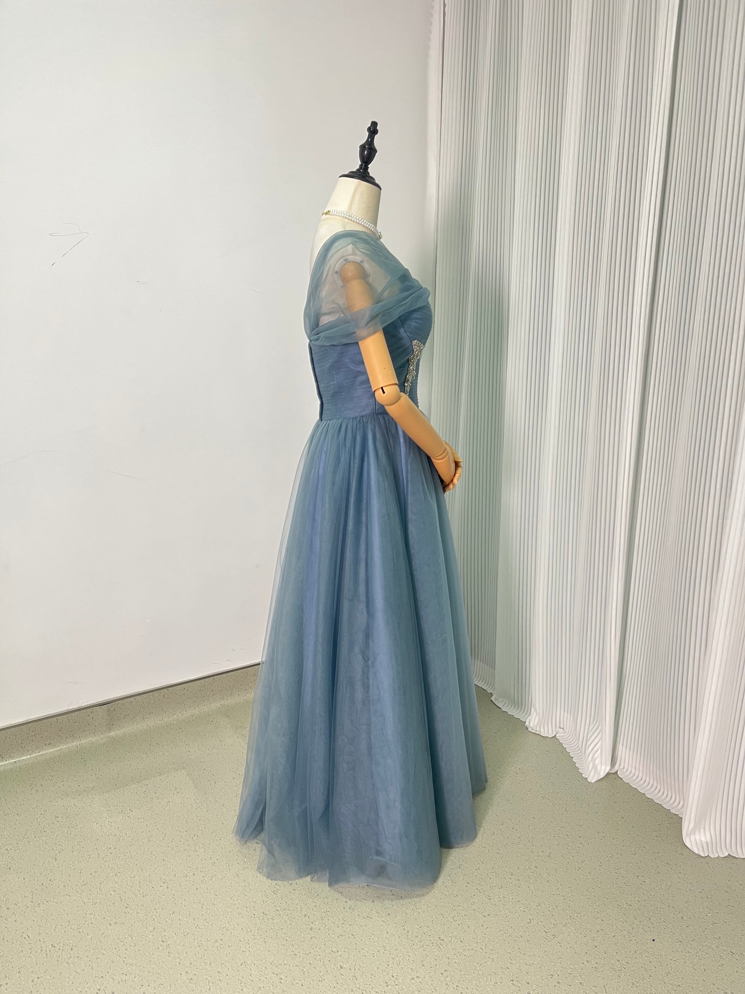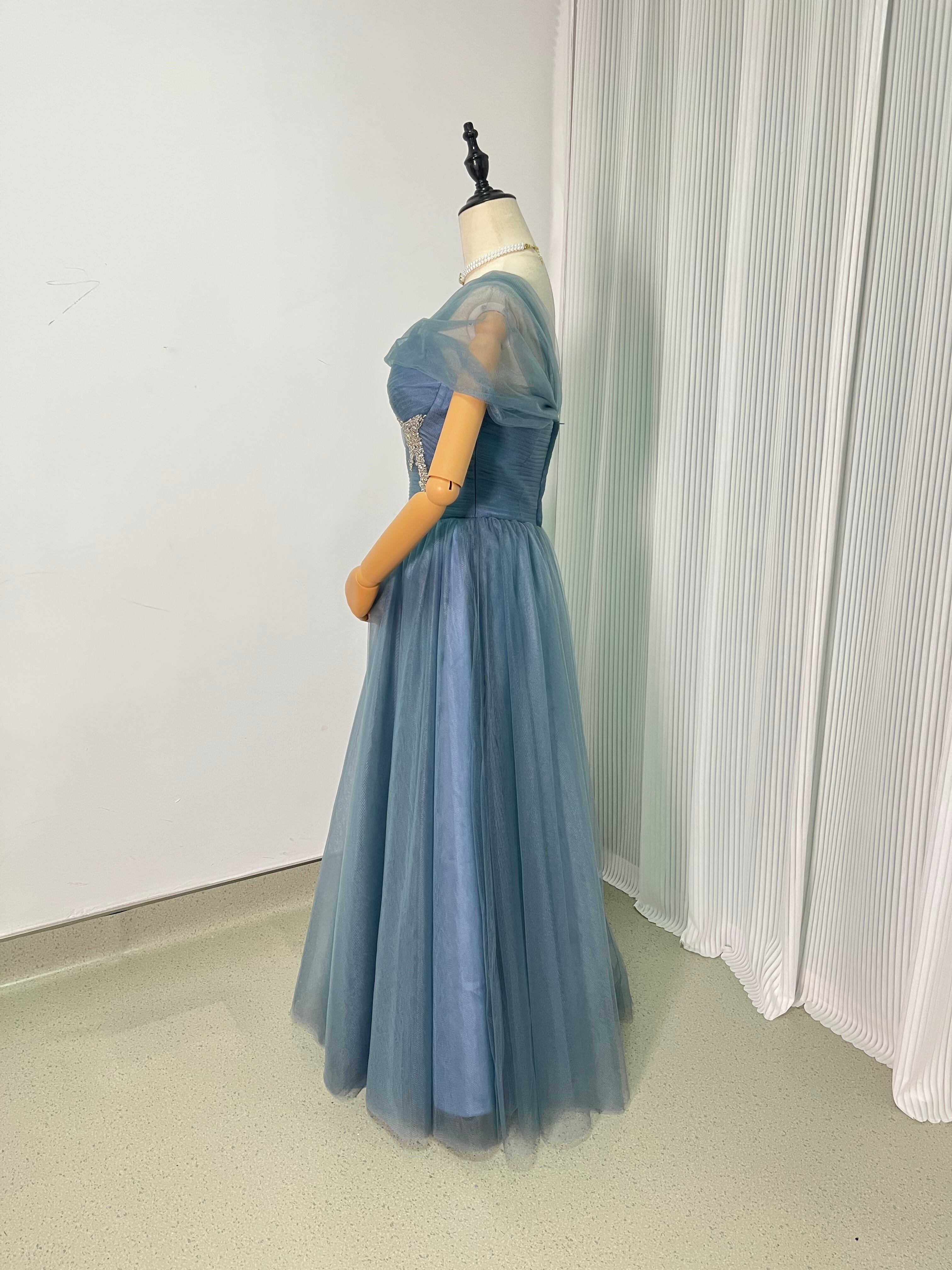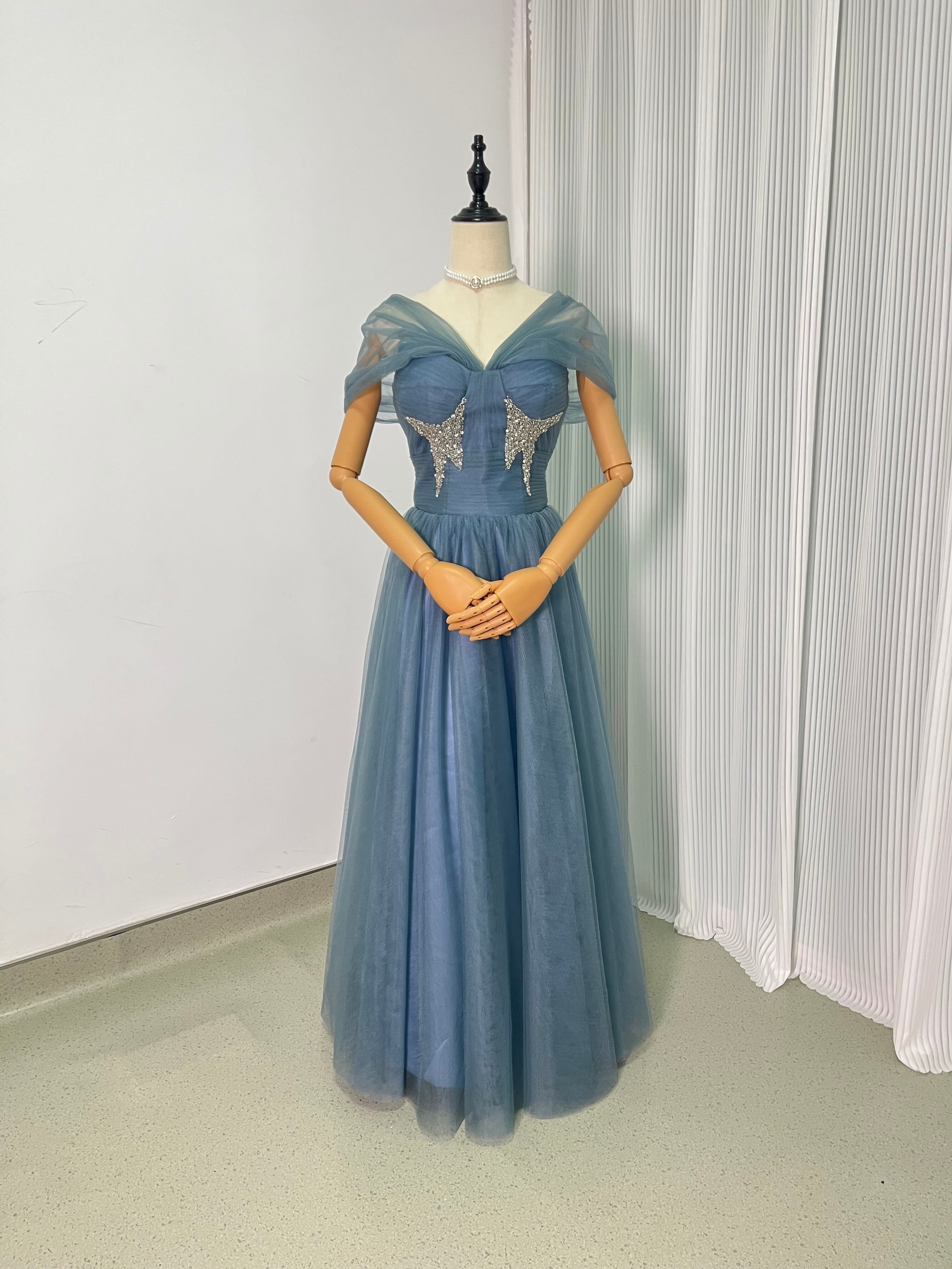 カラードレス グレー青 オフショルダー イブニングドレス 結婚式/披露宴 パーティドレス ロングドレス