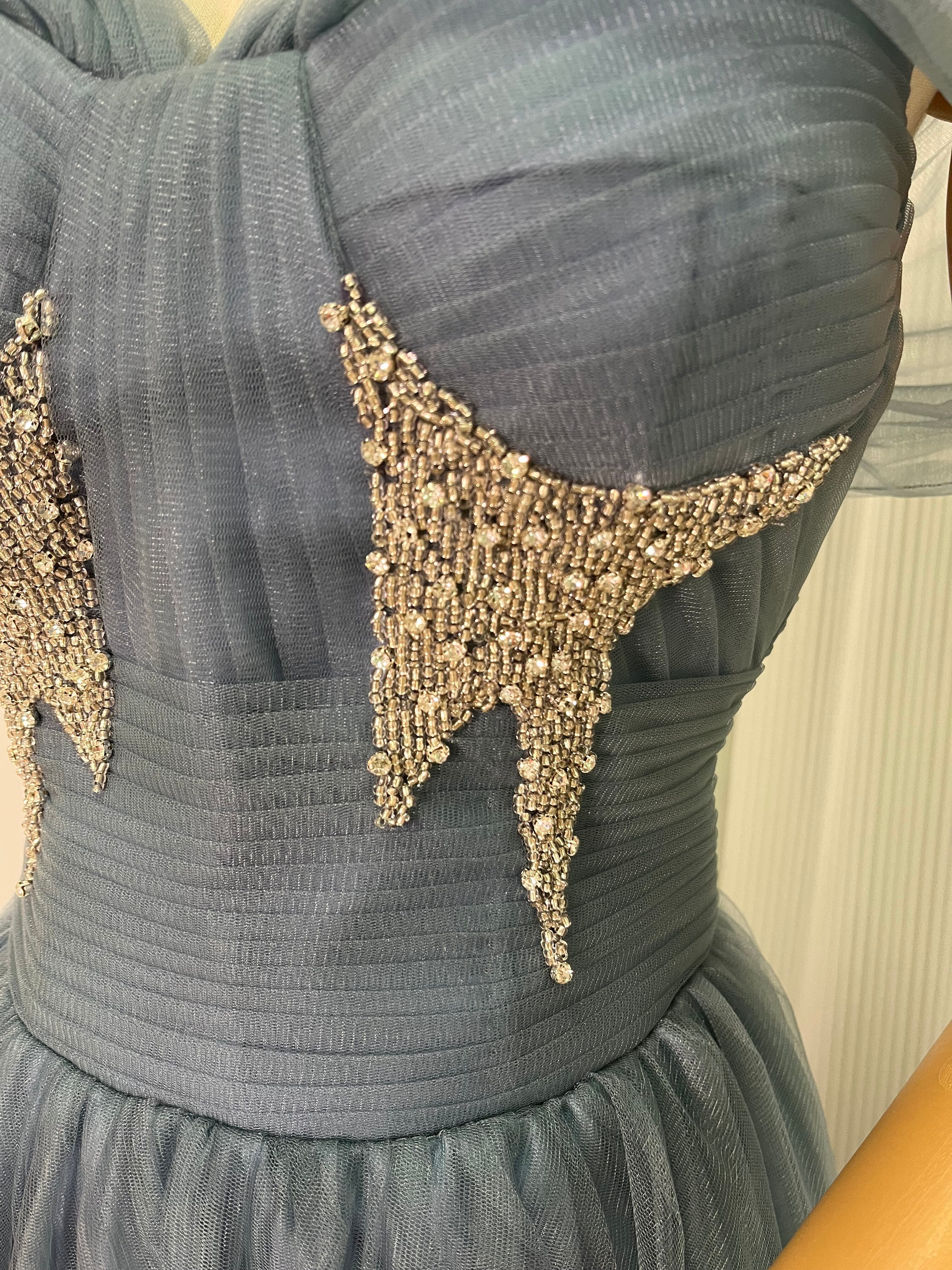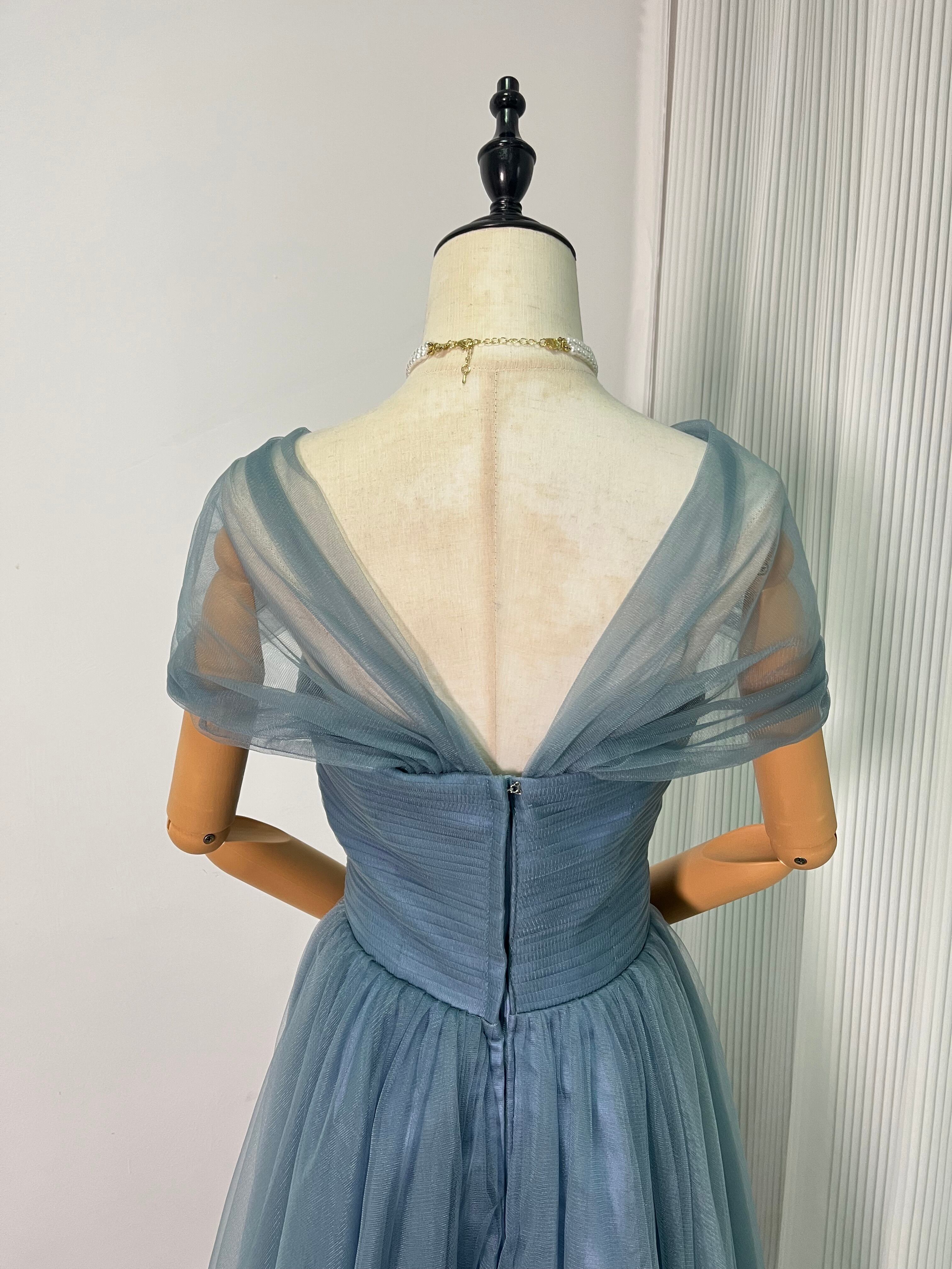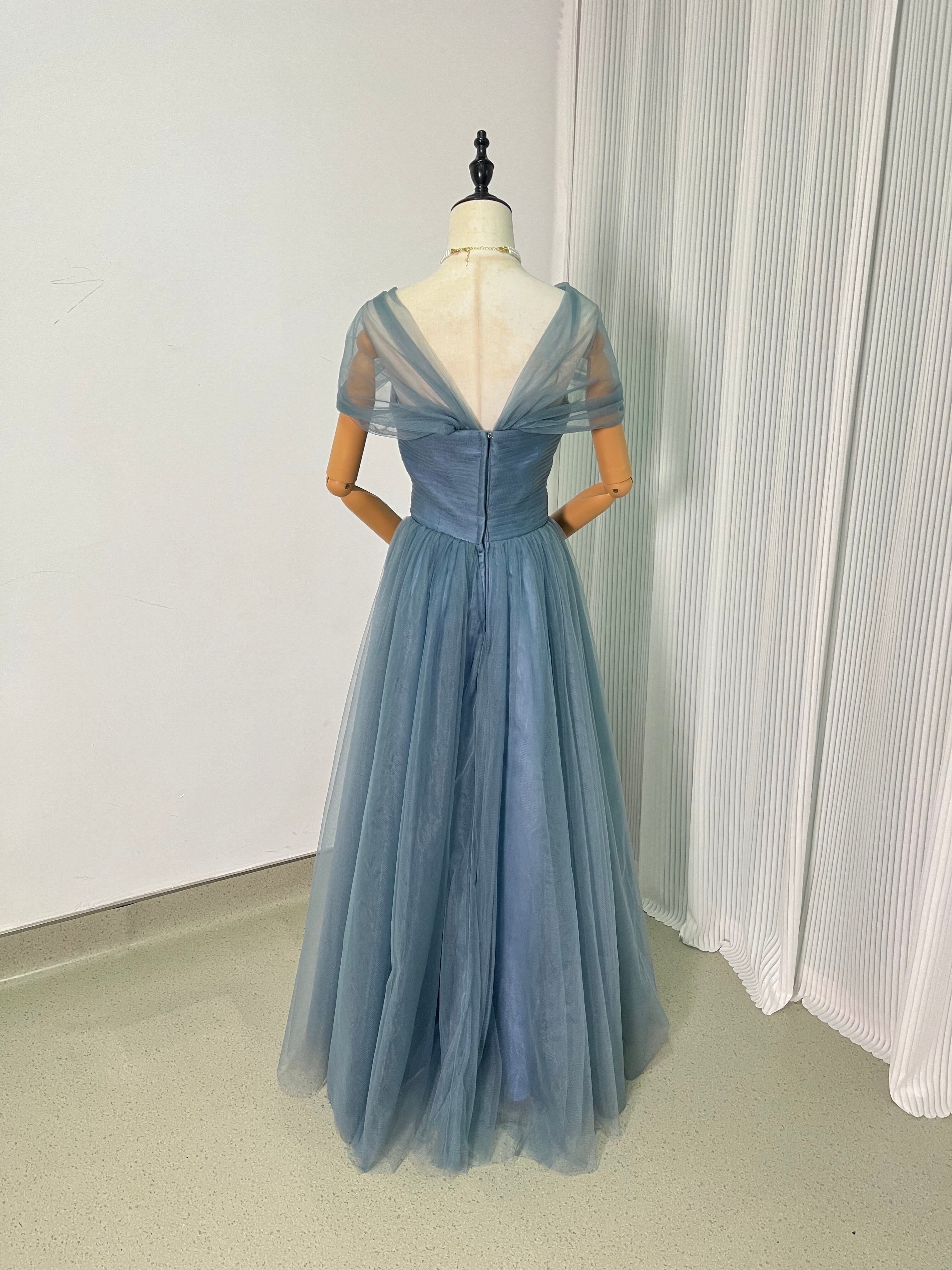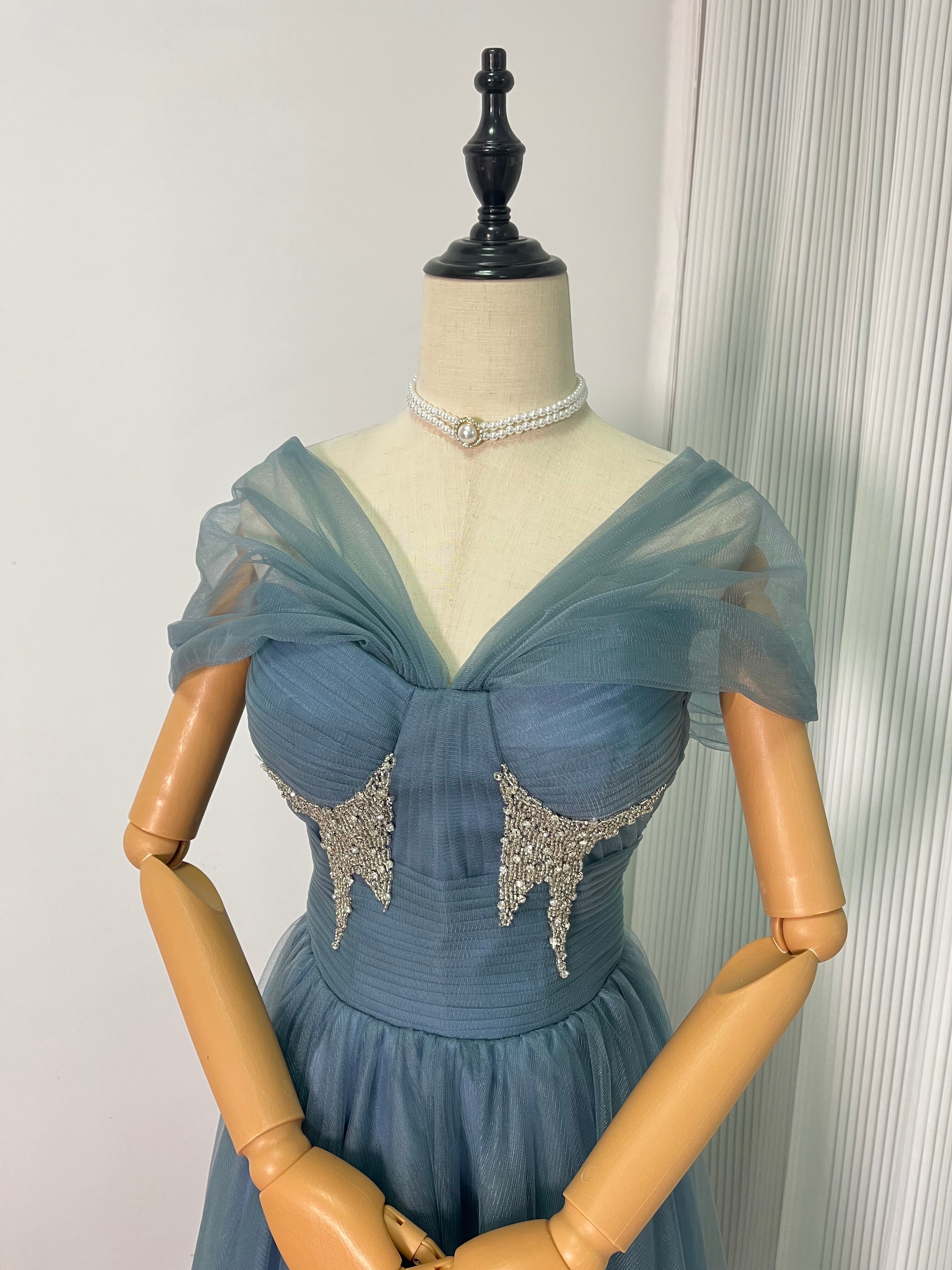 カラードレス グレー青 オフショルダー イブニングドレス 結婚式/披露宴 パーティドレス ロングドレス