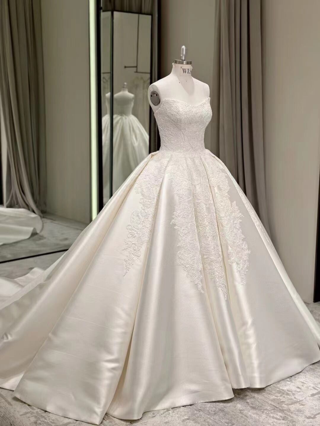 ウエディングドレス 美しい花レース 光沢感 ベアトップ Aライン 高みせ 優しい ブライダル