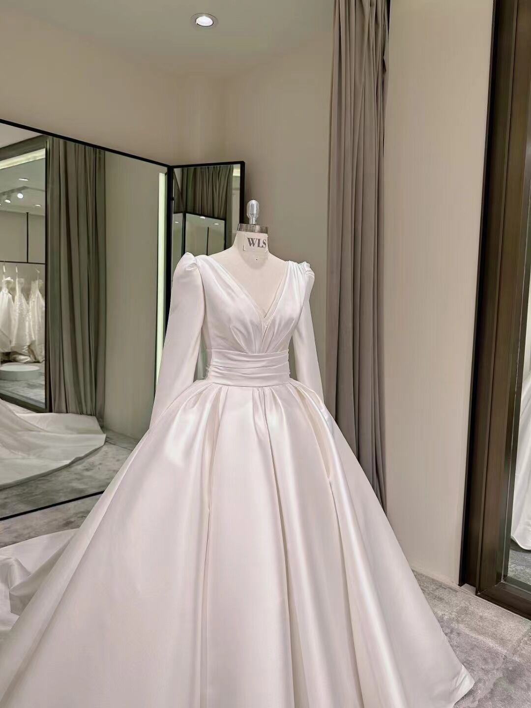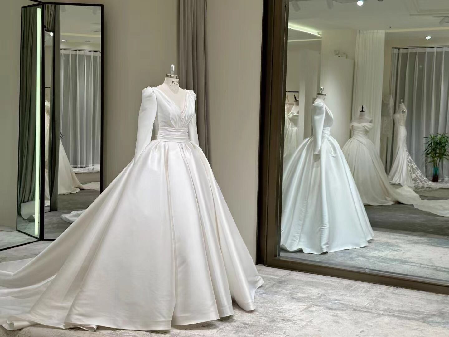 ウエディングドレス Vネックドレス ロングスリーブ 光沢サテン オフホワイト Aライン