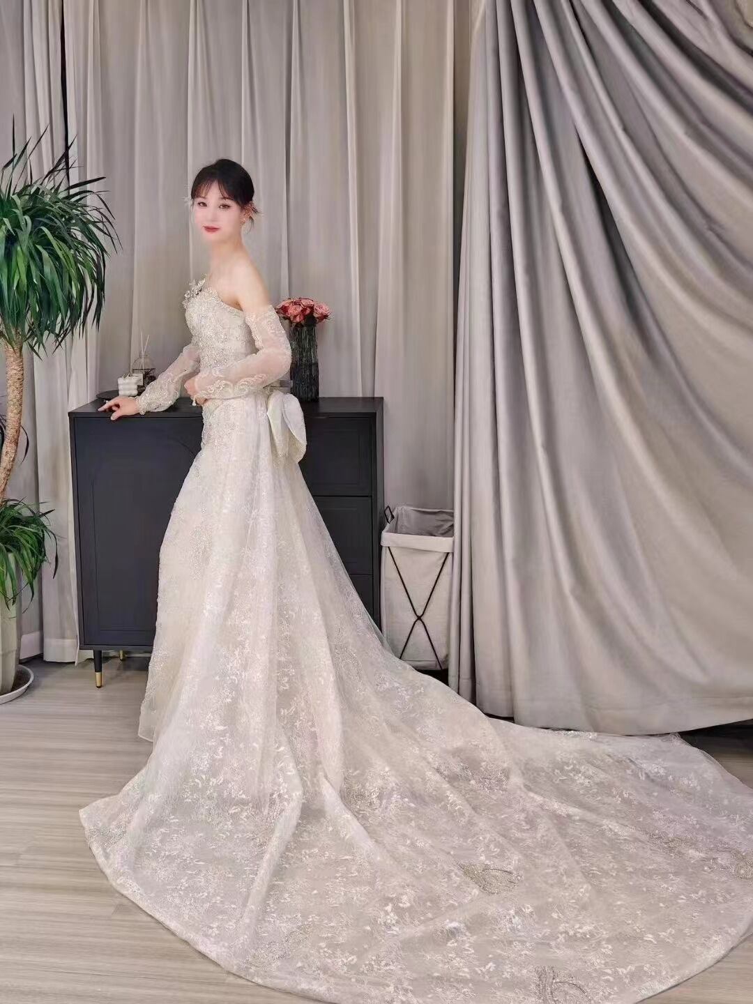 送料無料!ウェディングドレス ベアトップ キラキラ光る刺繍 華やか ロングドレス 韓国風ドレス