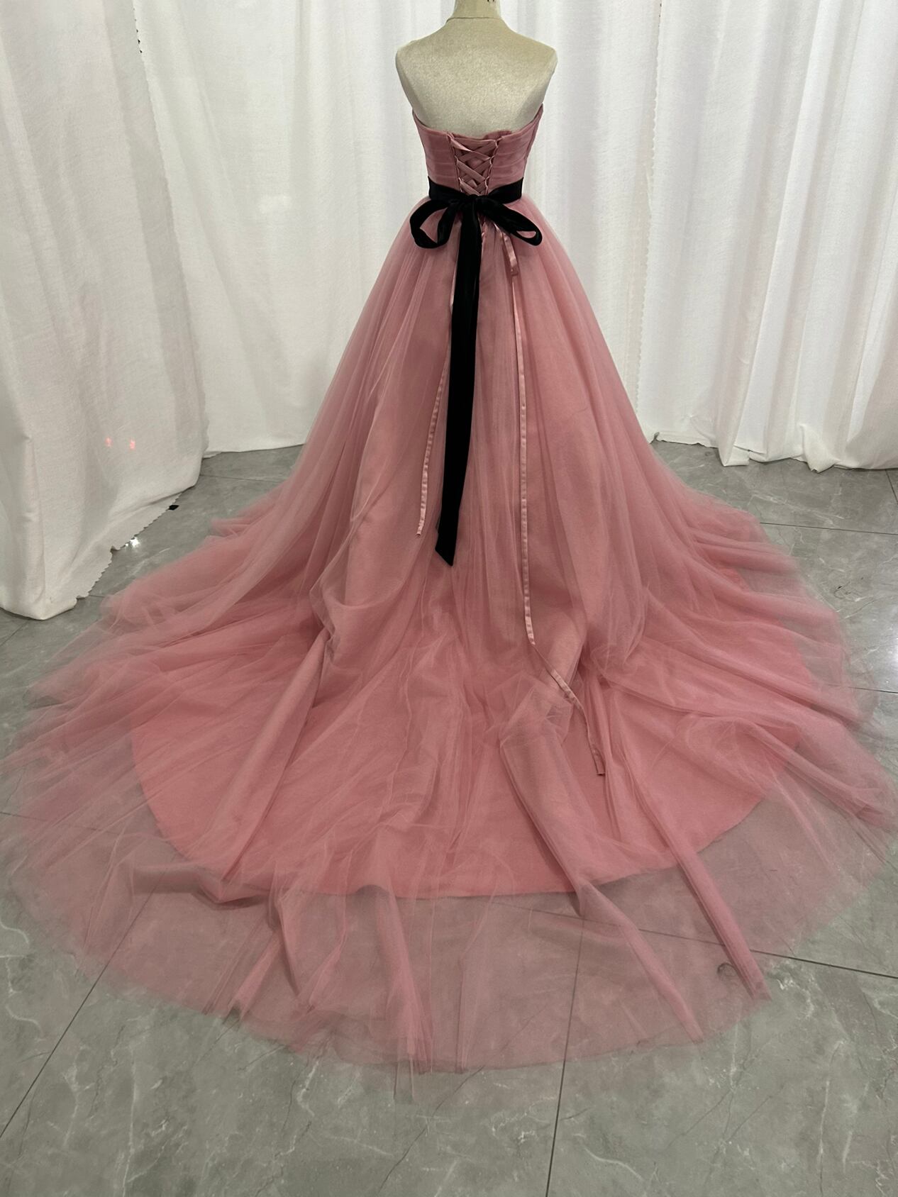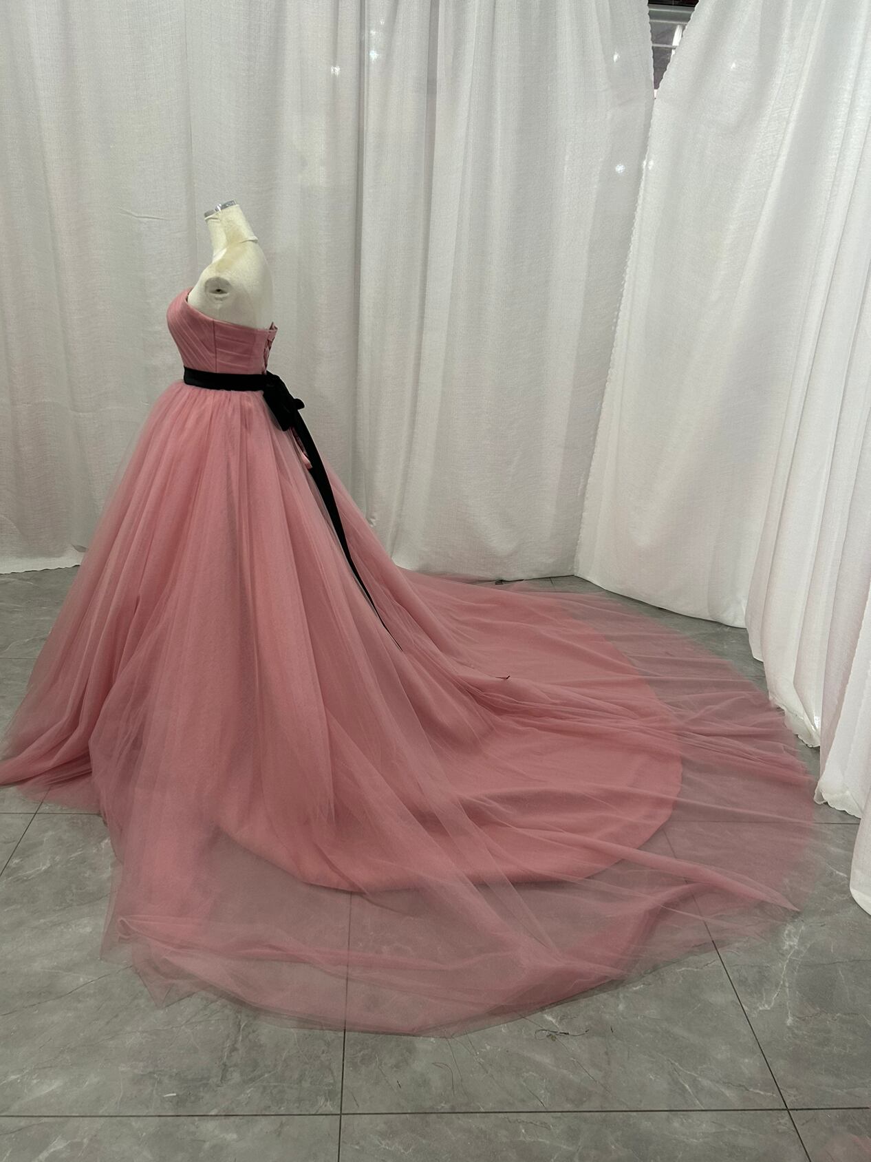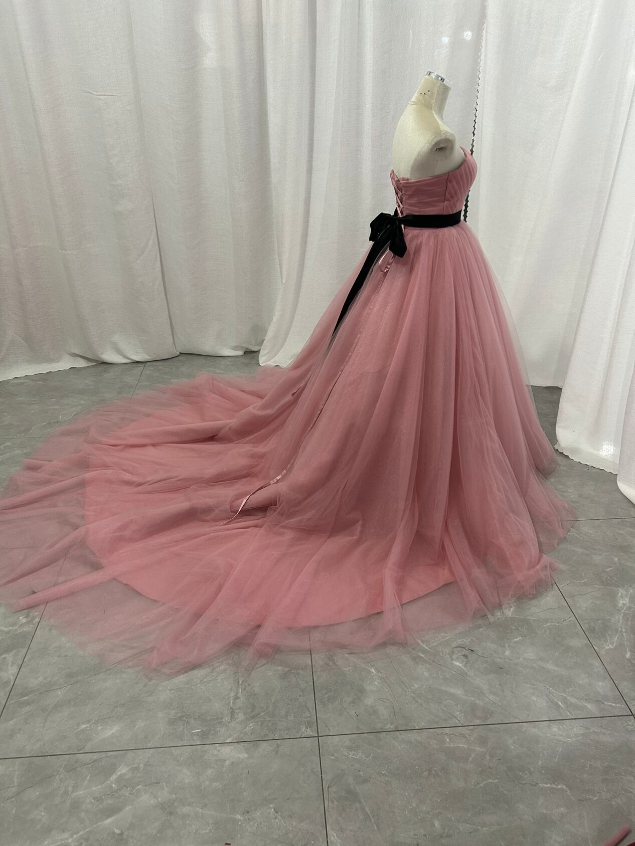 カラードレス スレンダーライン ピンク ベアトップ サッシュベルト ソフトチュール Aライン 前撮り 花嫁