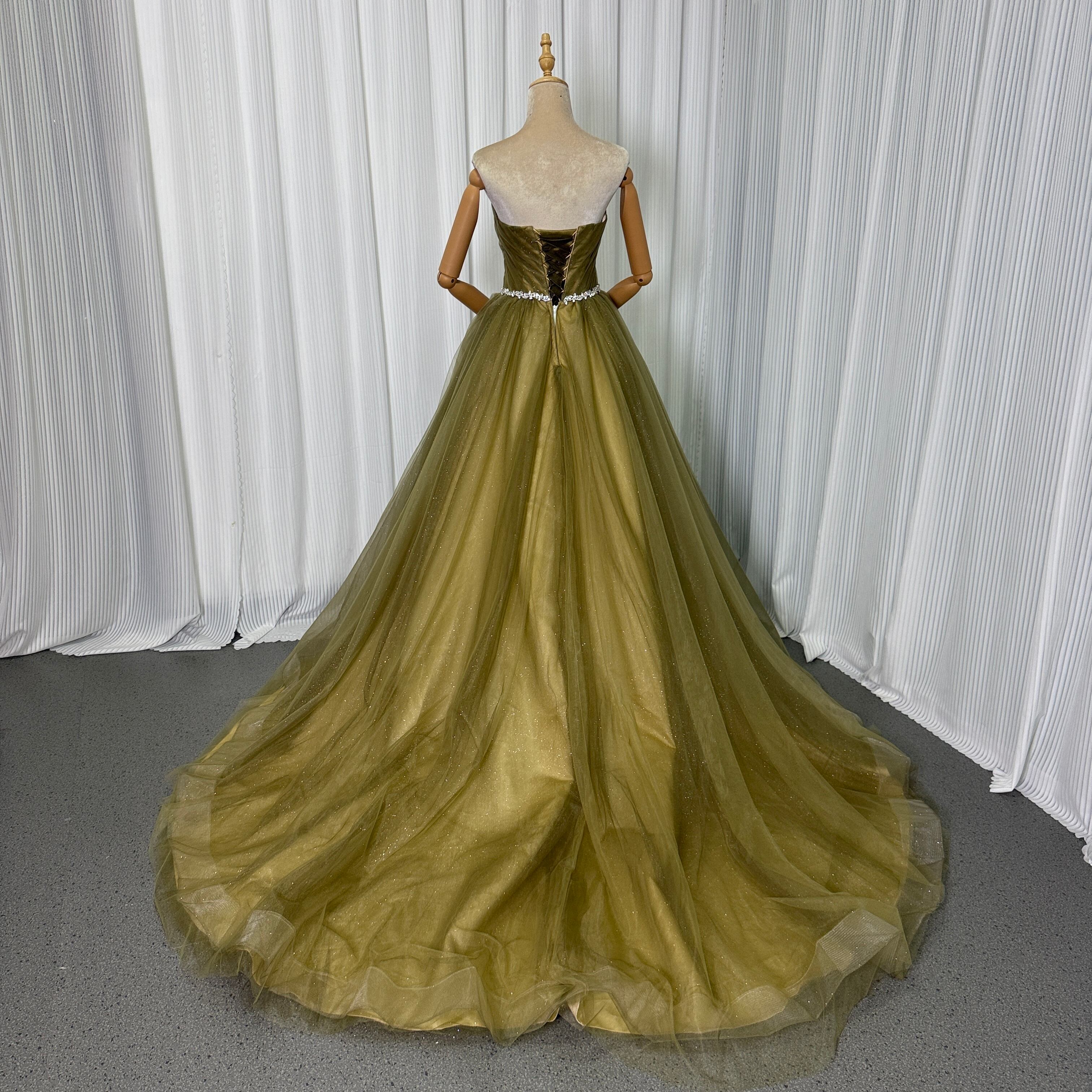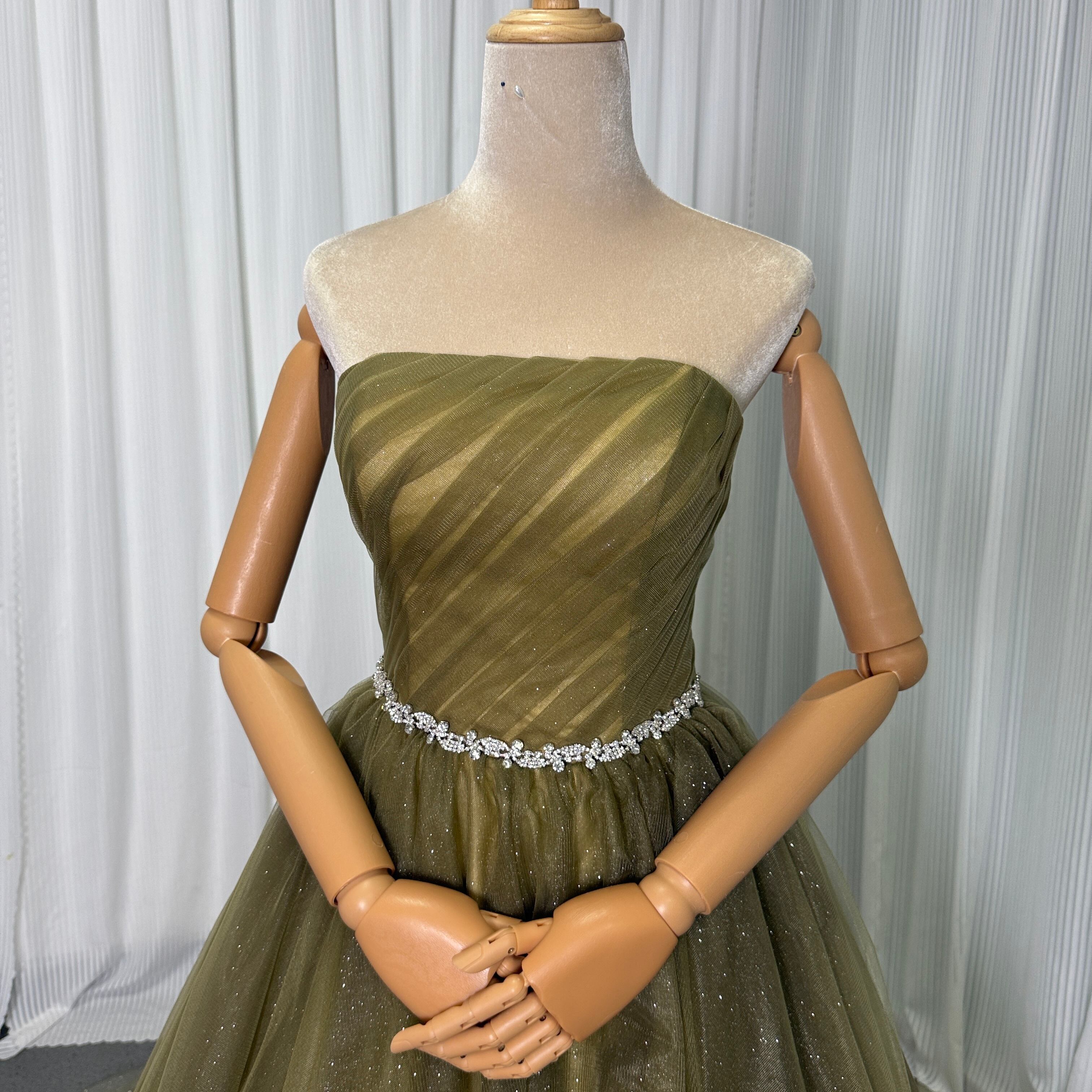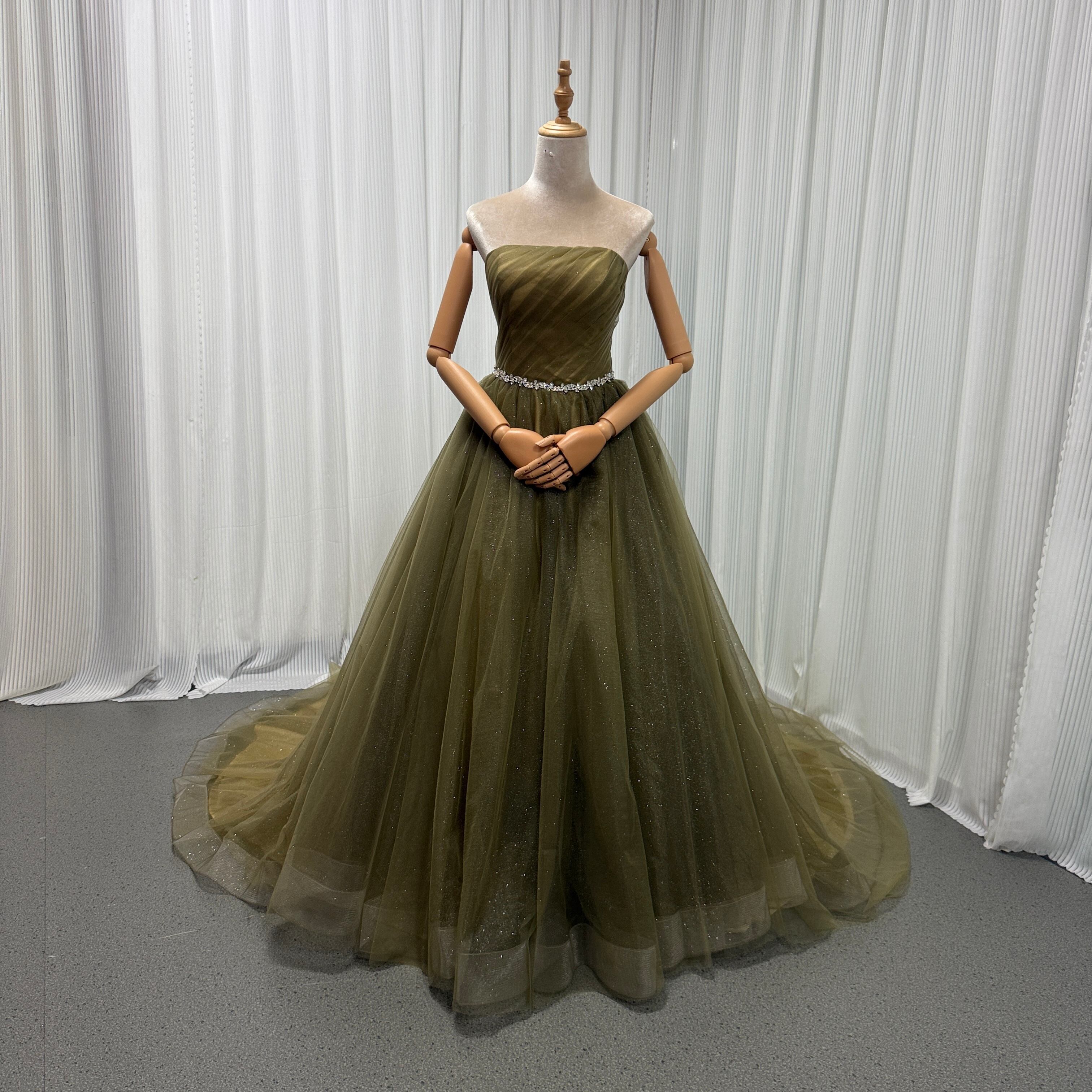 カラードレス ベアトップ Aライン カーキ色 キラキラグリッターチュール 編み上げ 結婚式/披露宴