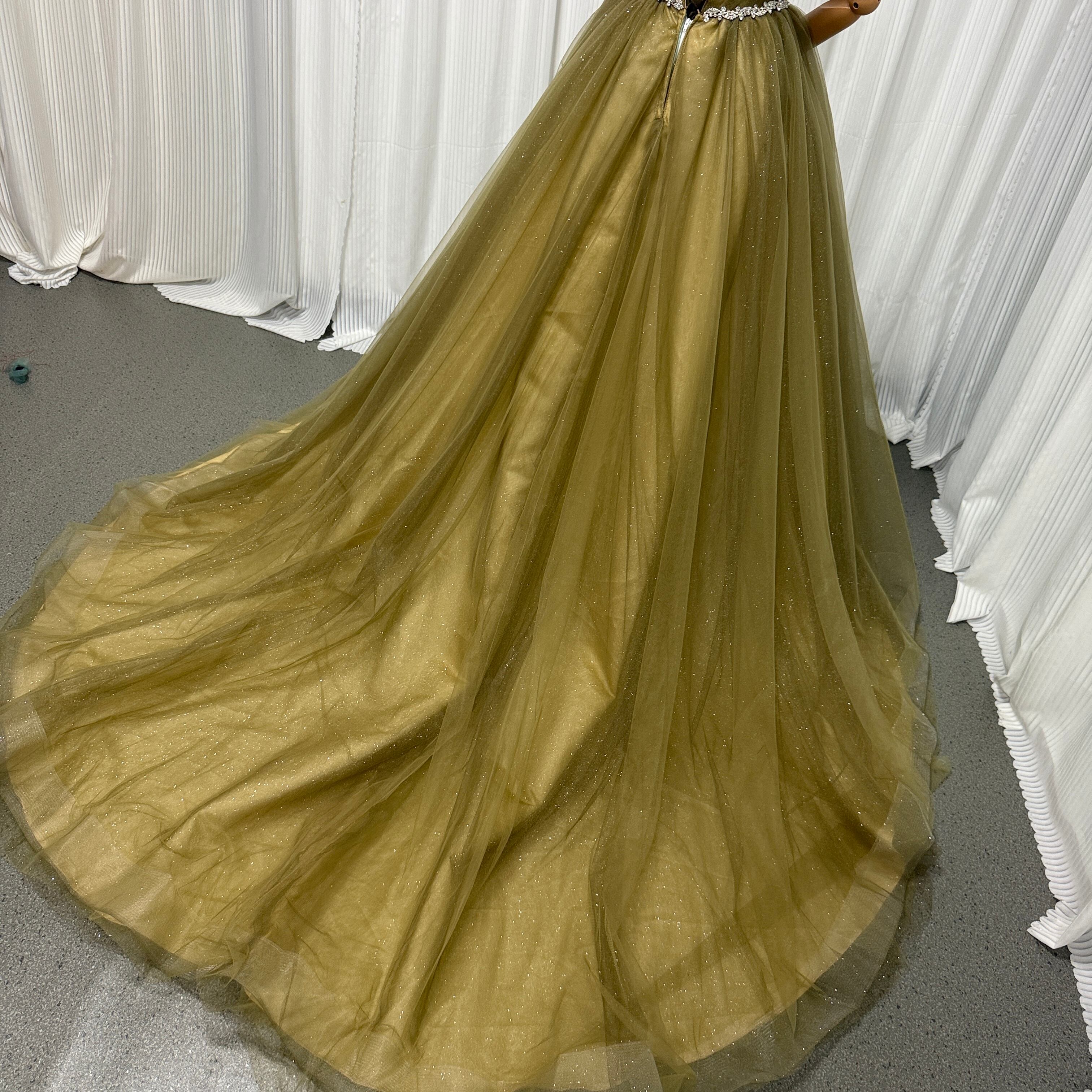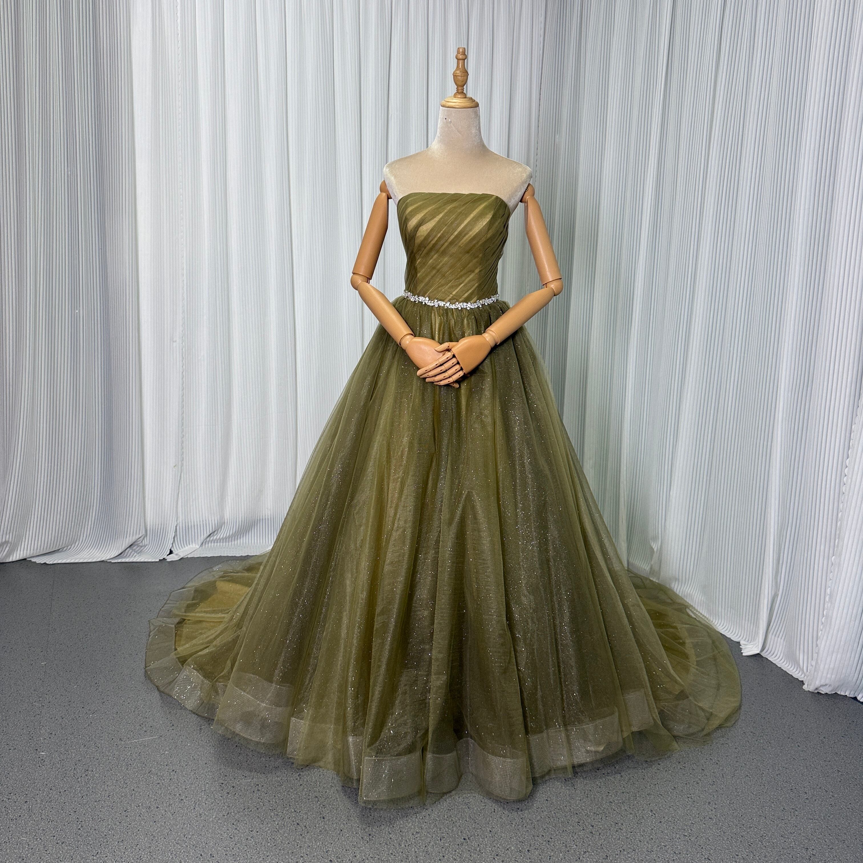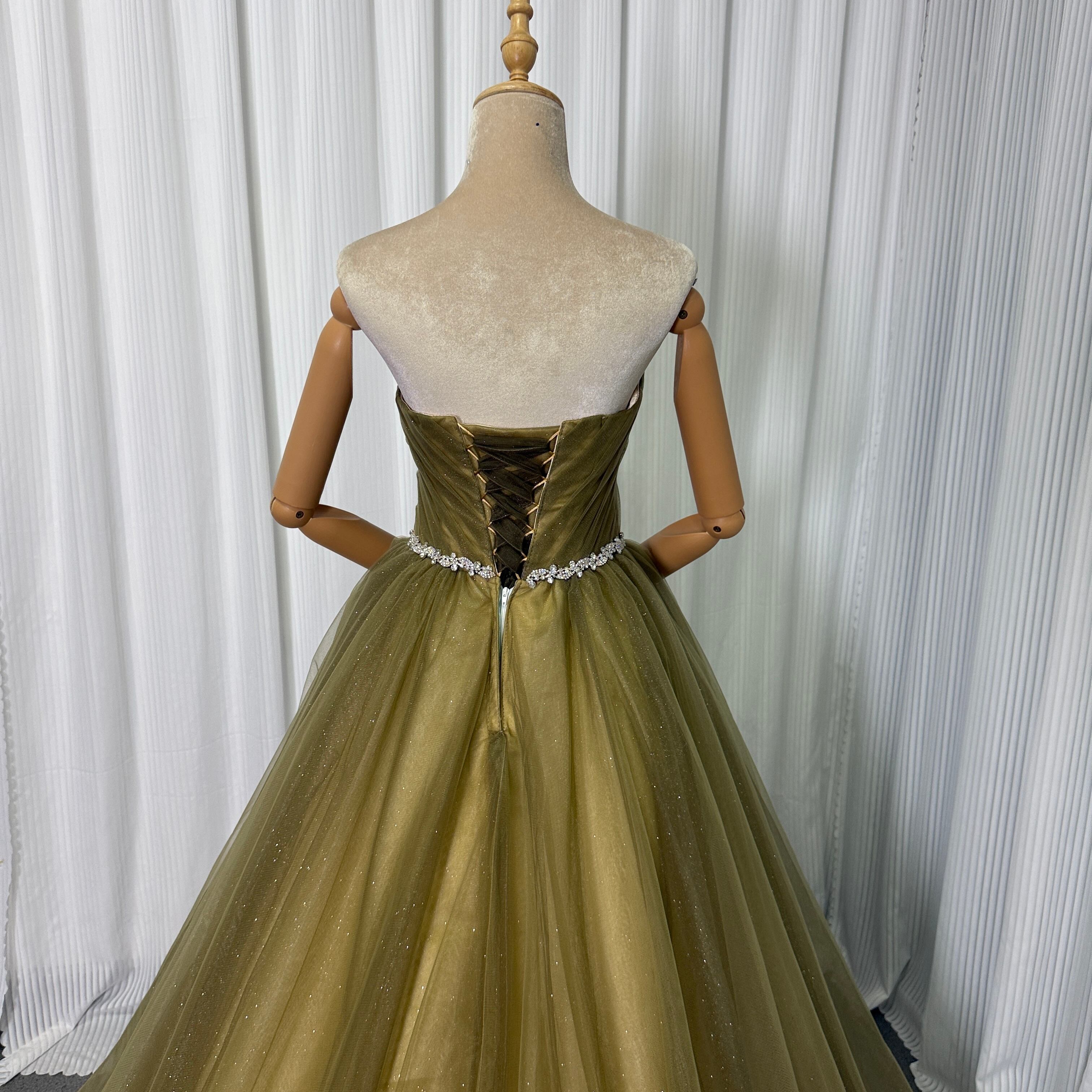 カラードレス ベアトップ Aライン カーキ色 キラキラグリッターチュール 編み上げ 結婚式/披露宴