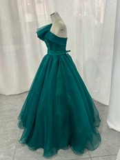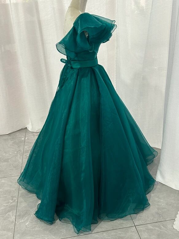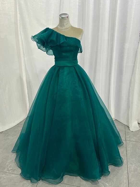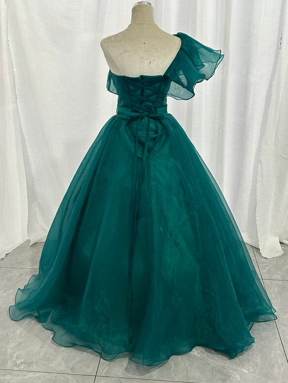 カラードレス ブルー 上質オーガンジー ワンショルダー 編み上げ ロング 揺らめく裾 披露宴