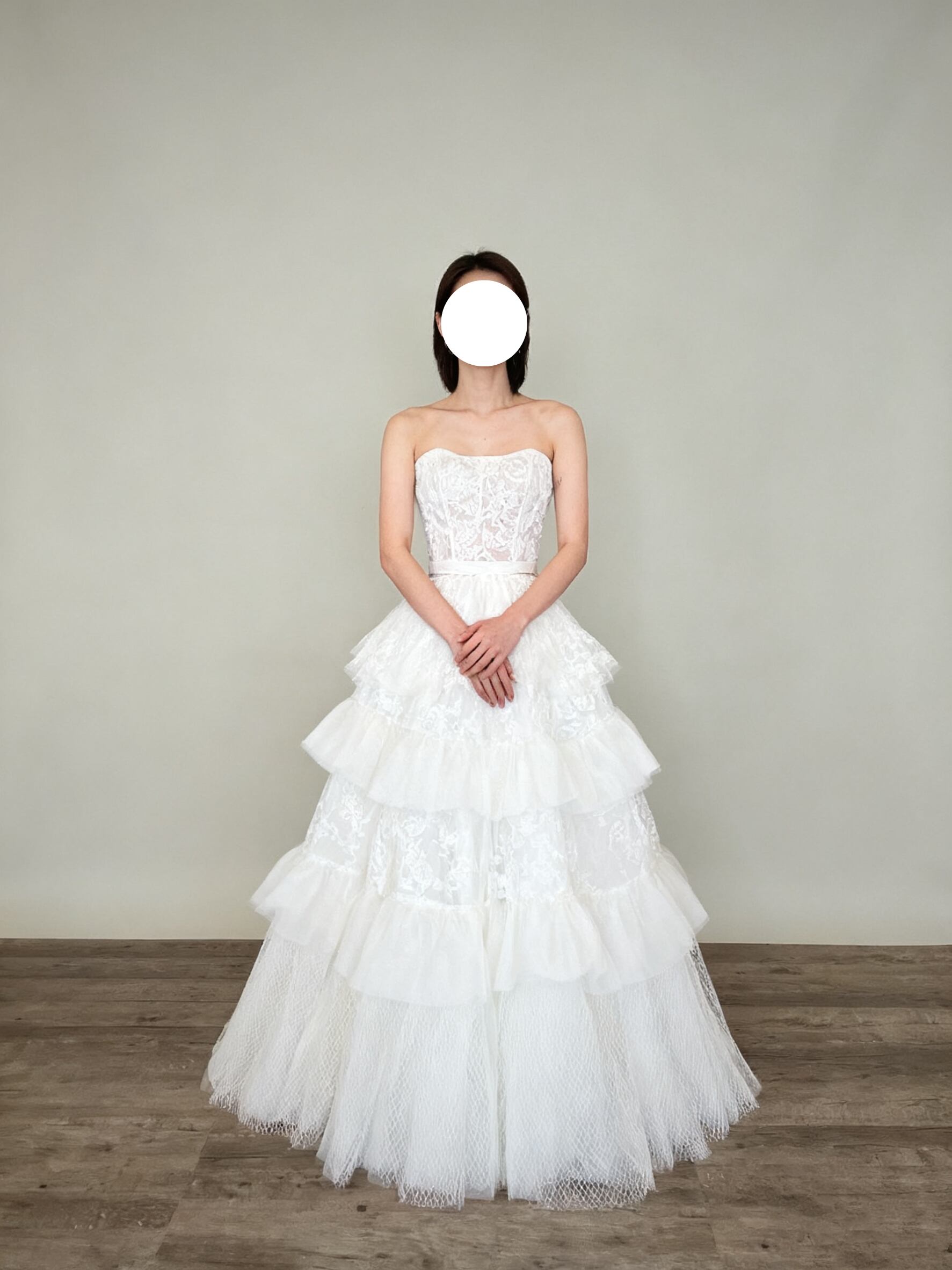ウエディングドレス 床付く ティアードのドレス 流れる透け花レース ベアトップ 花嫁 Aライン 細見えシルエッ