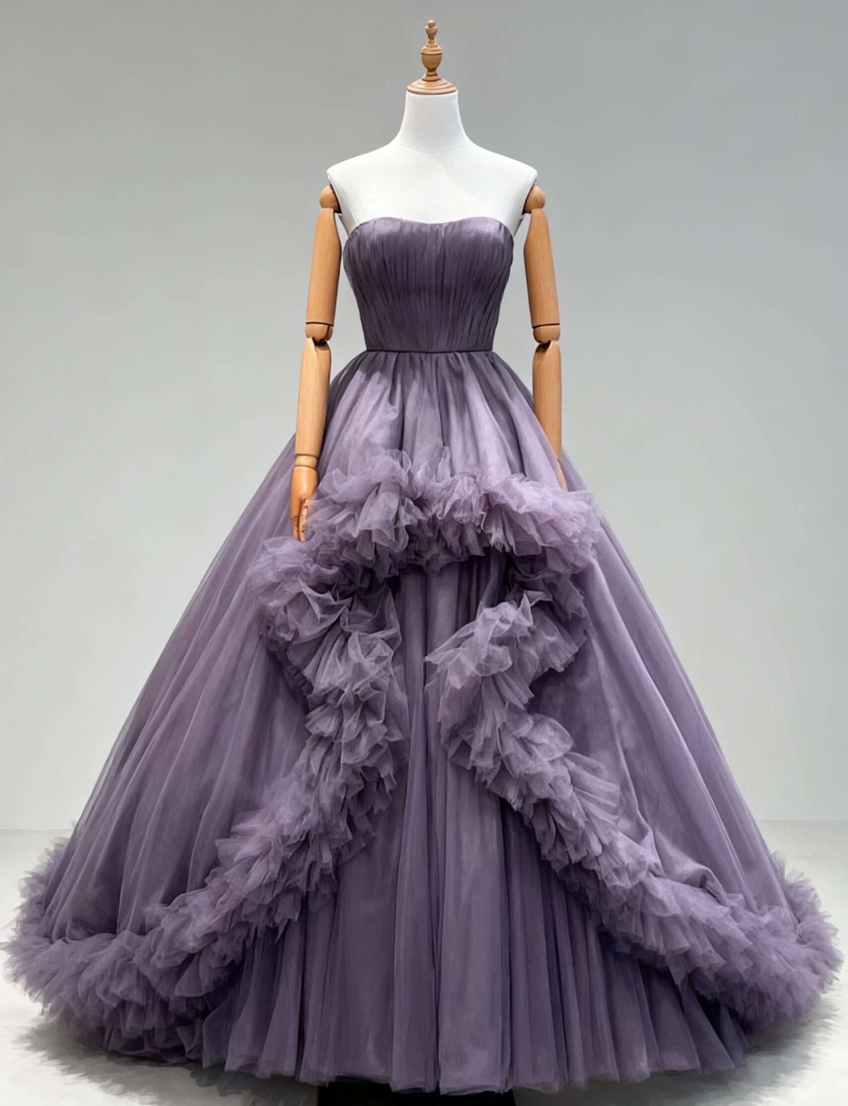 カラードレス パープル ベアトップ ラッフルフリル スリット 柔らかく重ねたチュールスカート フレアスカート