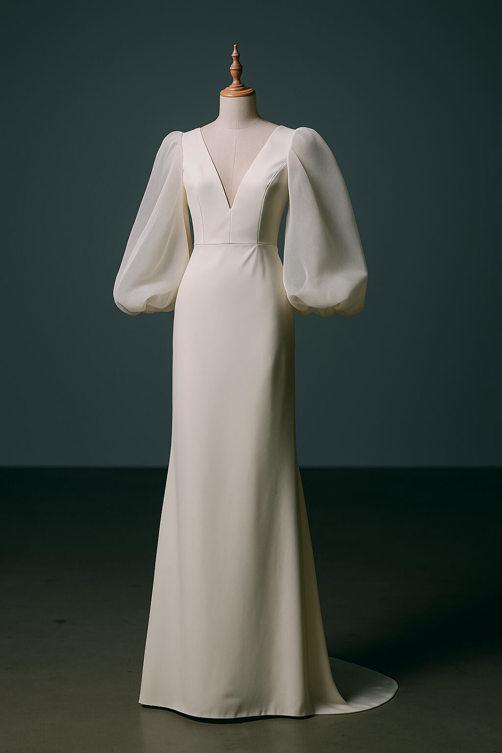 ウェディングドレス パフスリーブドレス ソフトマーメイドライン Vネックドレス クレープ生地 細見えシルエット