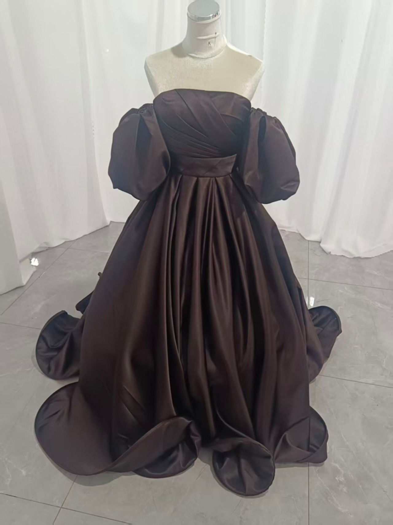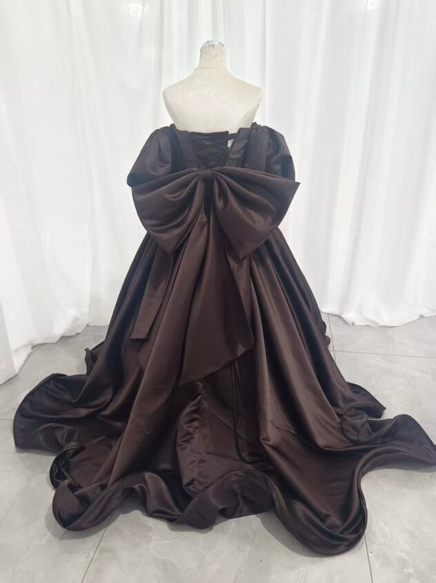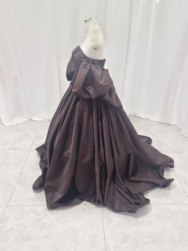 パーティードレス ふっくら柔らかなバックリボン 取り外し袖 光沢サテン ブラウン 前撮り 2次会
