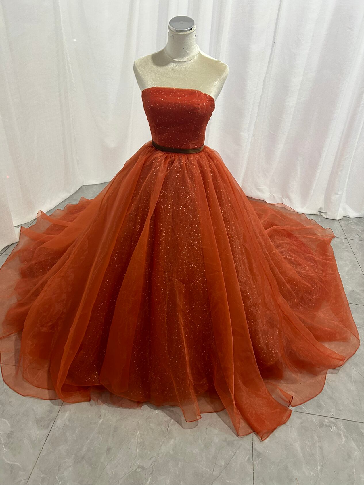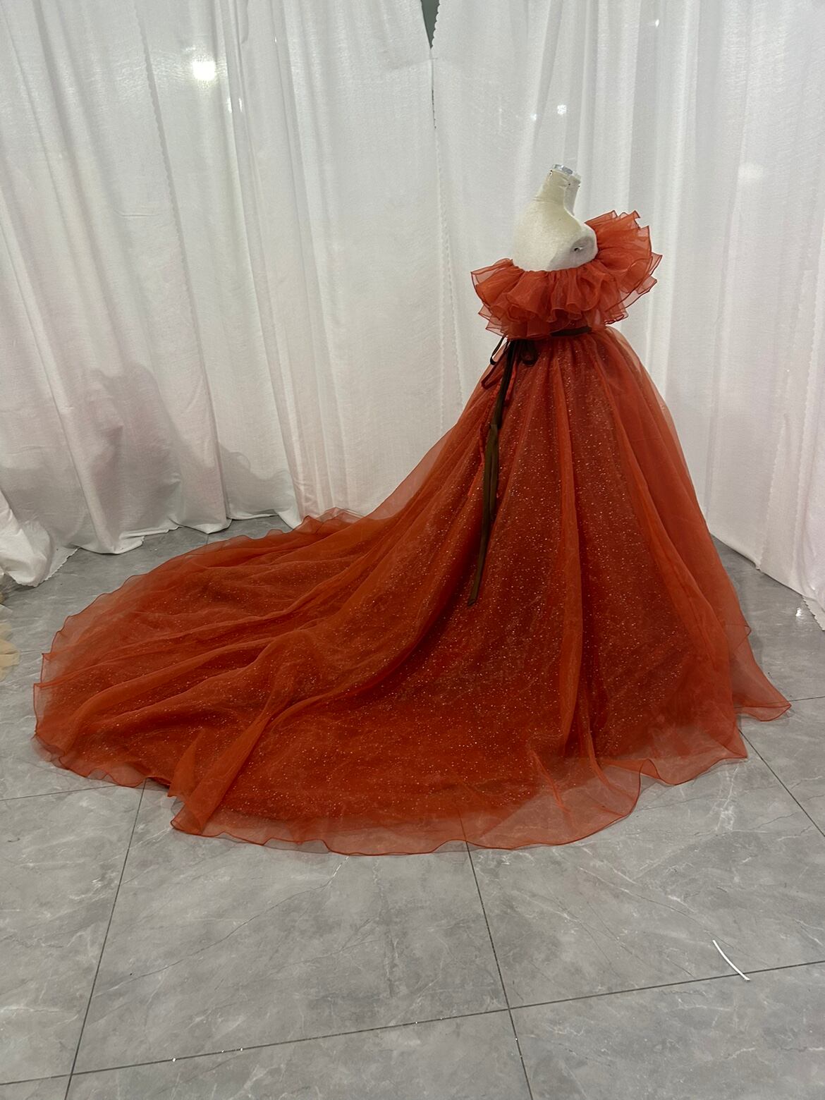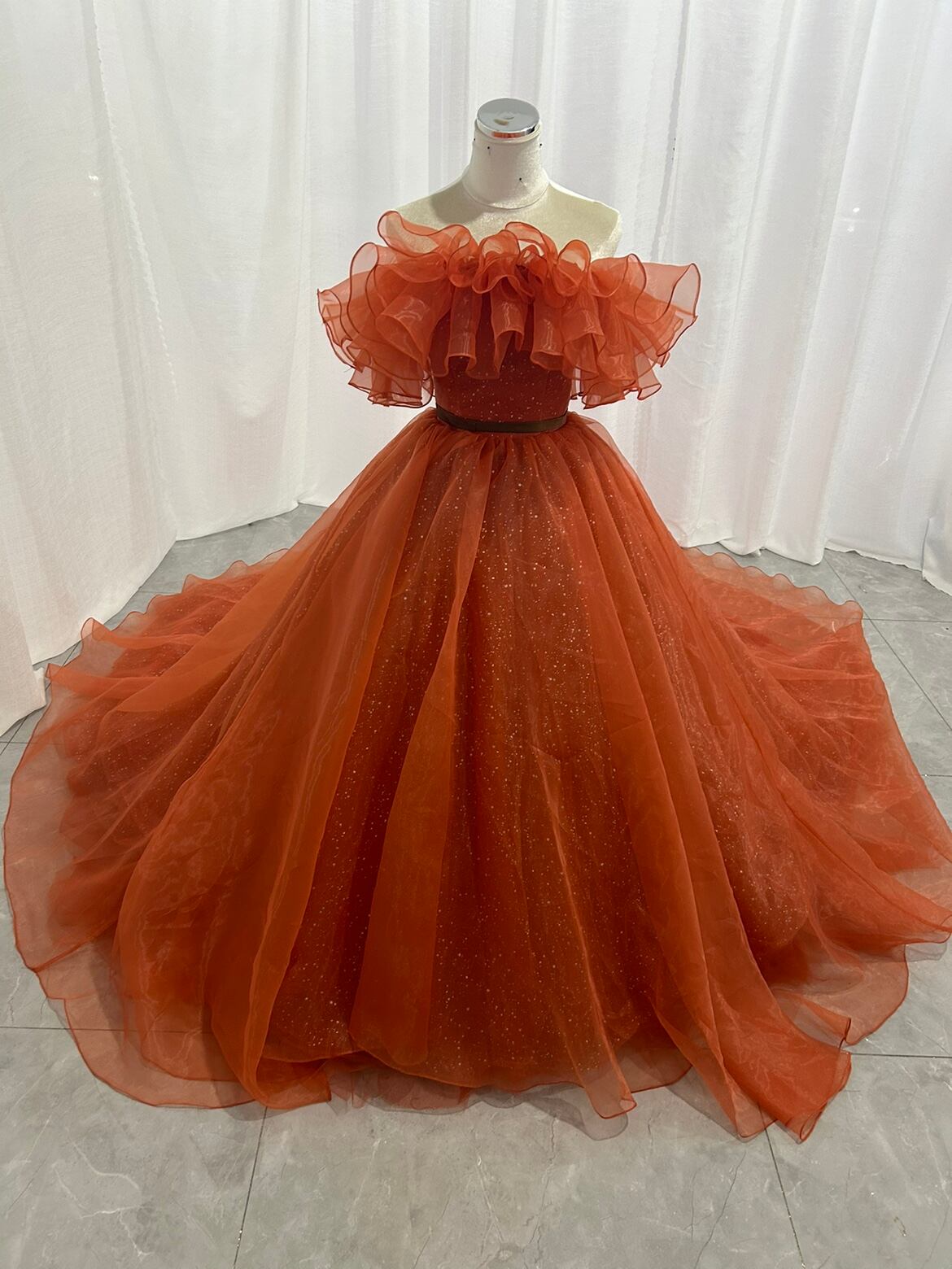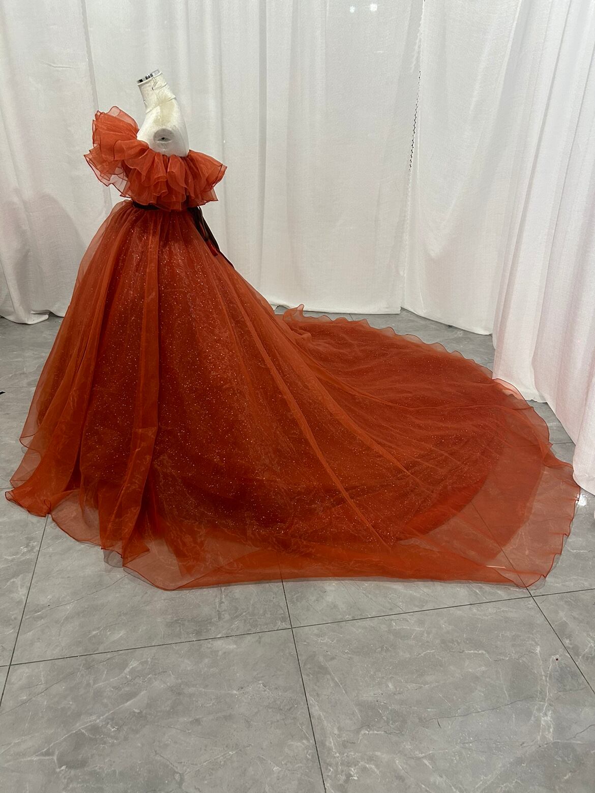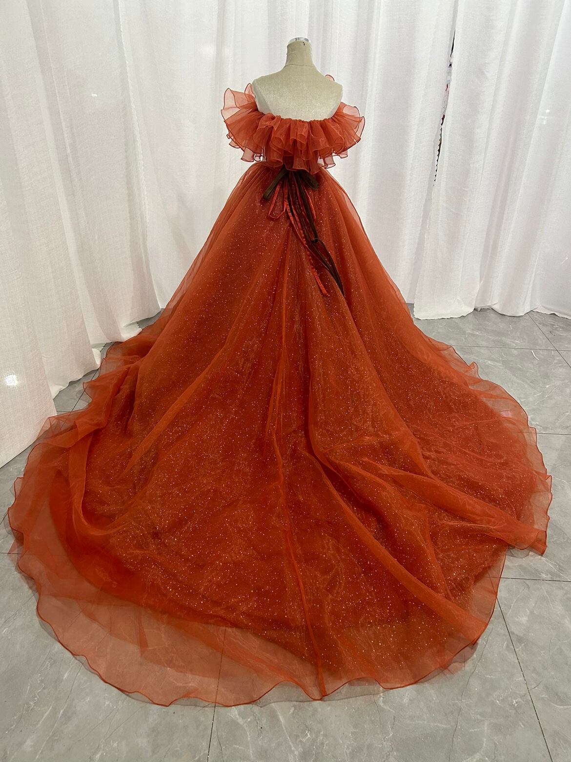 カラードレス テラコッタ色 取り外しオフショルダー 結婚式 ブライダル エレガント オーガンジー 前撮り