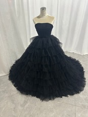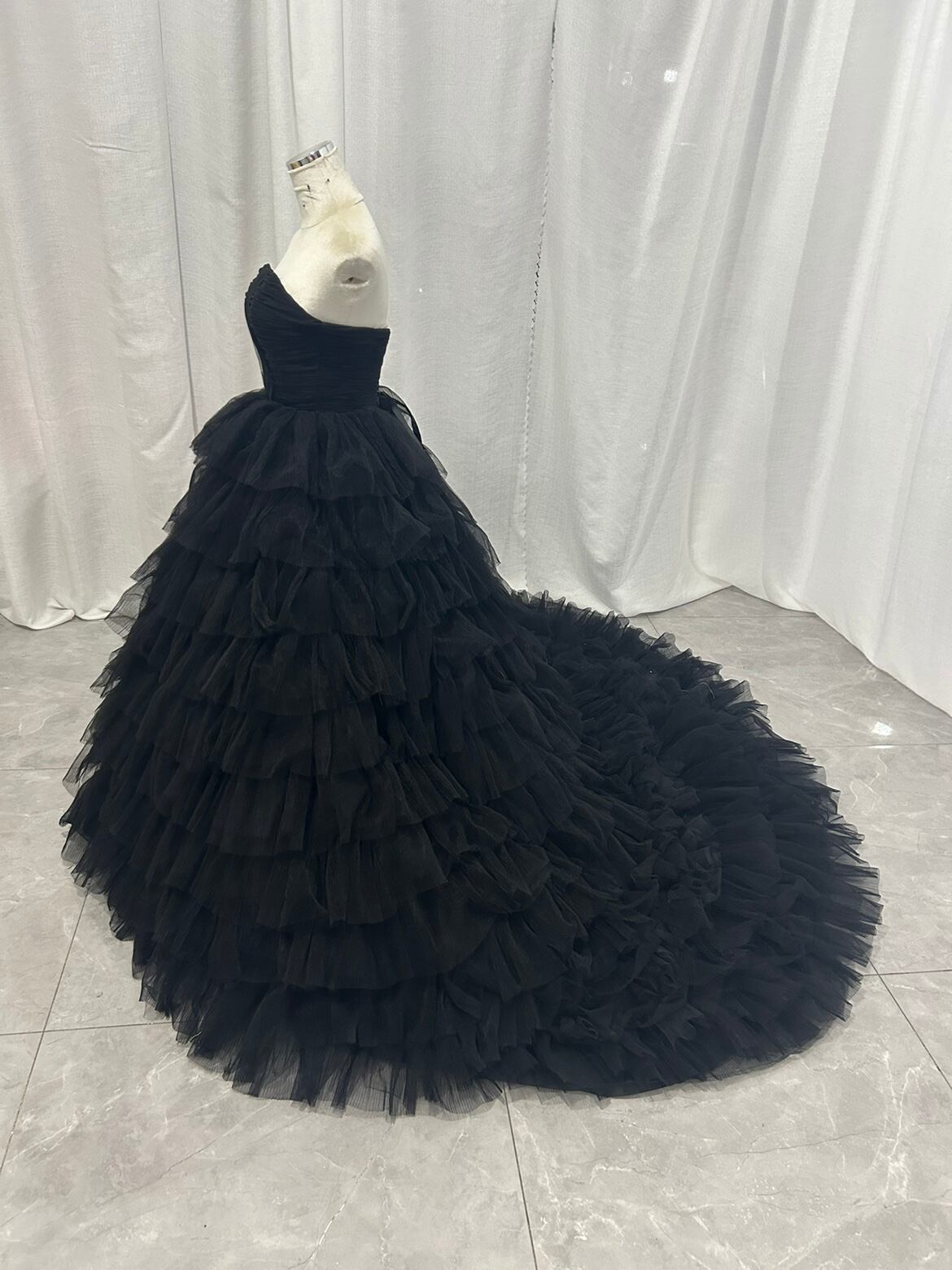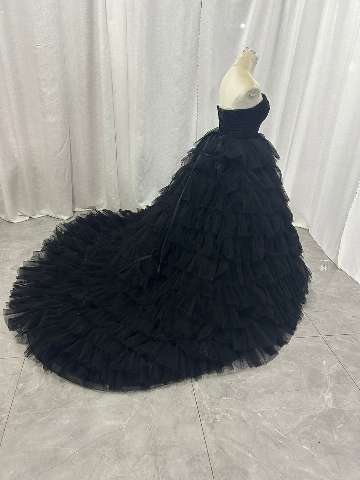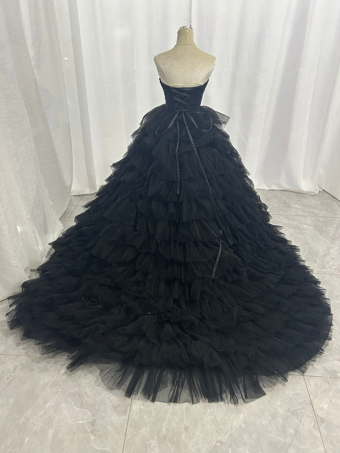 オフショルダーカラードレス ブラックボリュームチュールドレス トレーン 編み上げ ビスチェタイプ