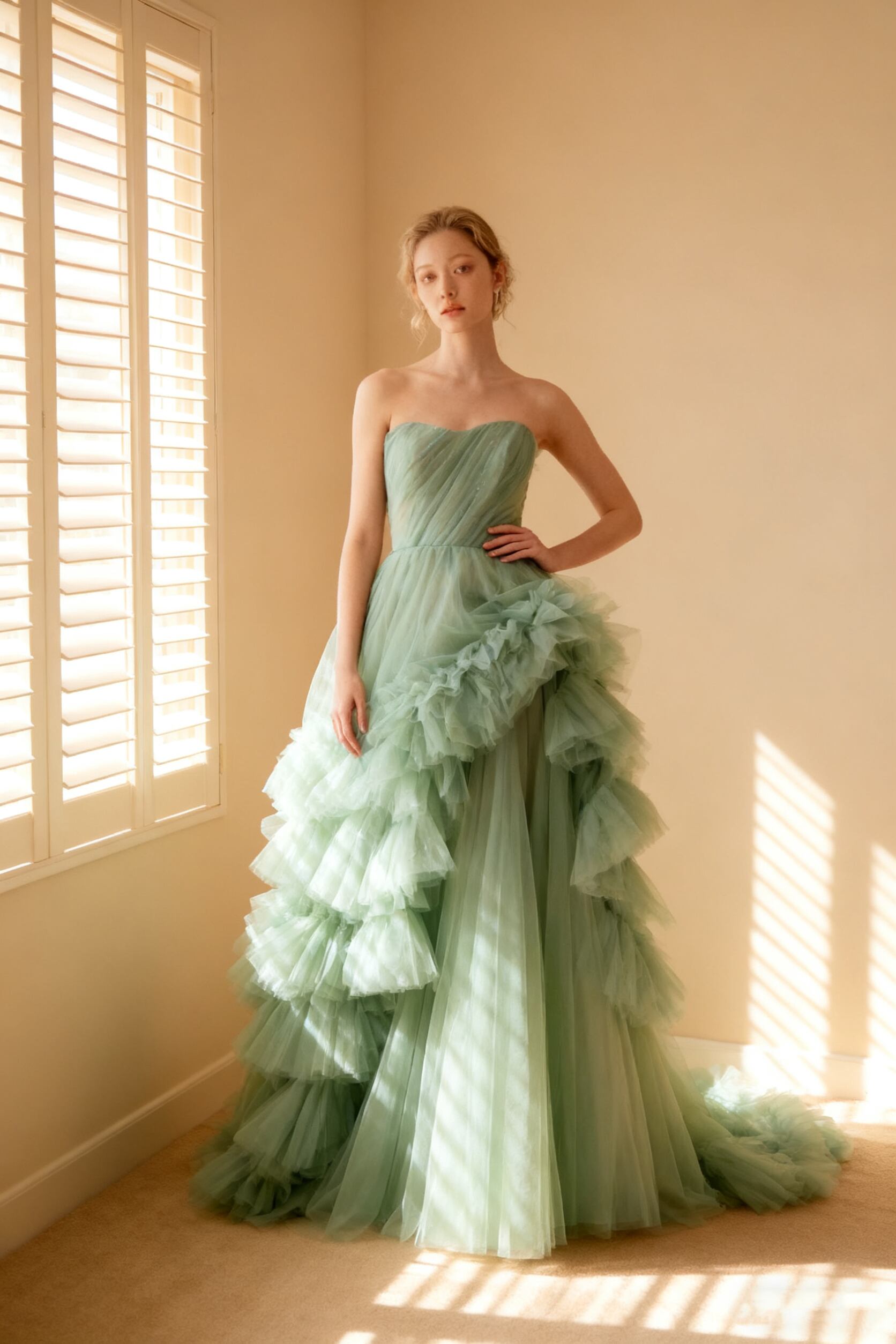 カラードレス グリーン ベアトップ チュールスカート アシンメトリードレス プリンセスライン 結婚式/披露宴