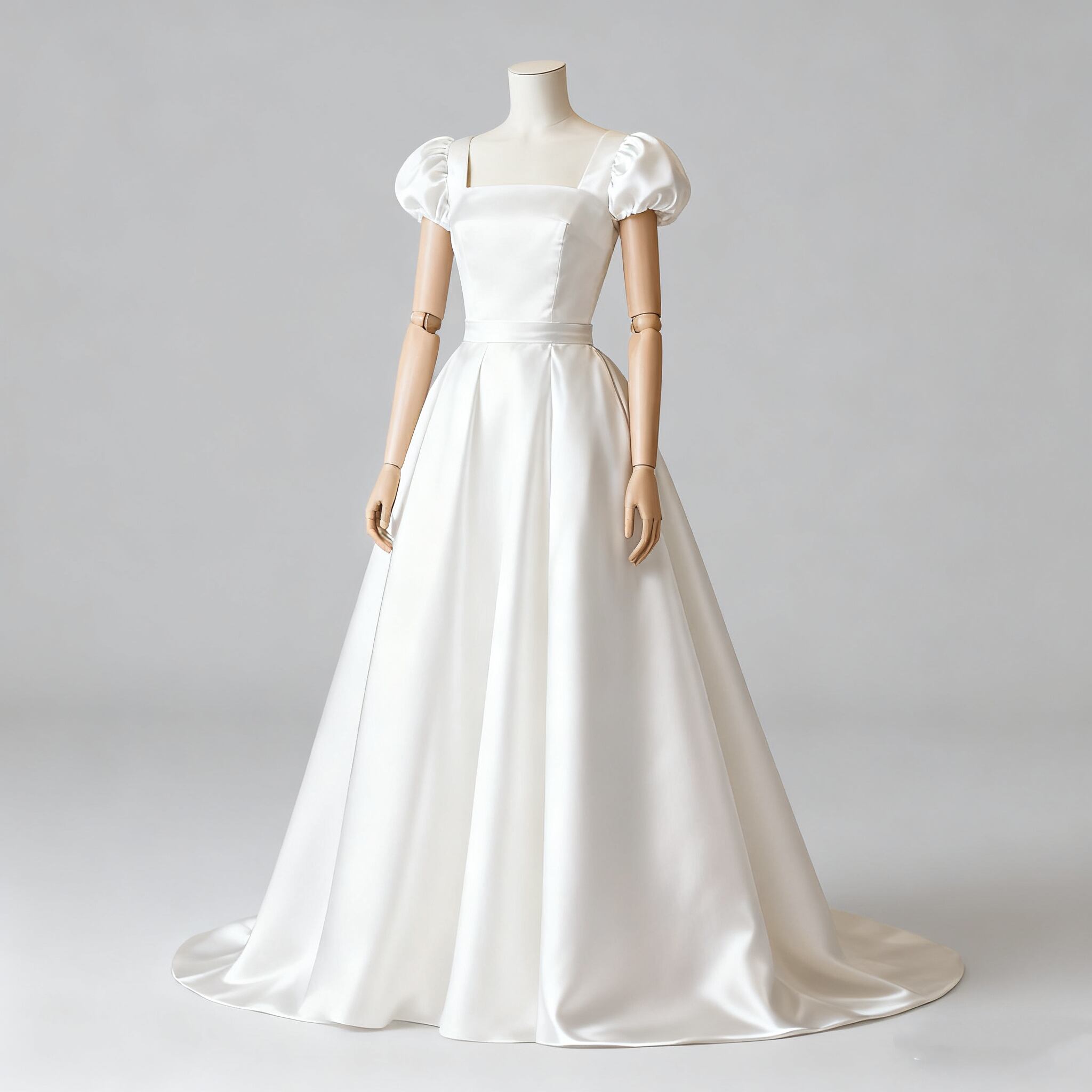 パーティードレス パフスリーブ オフホワイト スクエアネック オフホワイト 光沢サテン ブライダル 前撮り
