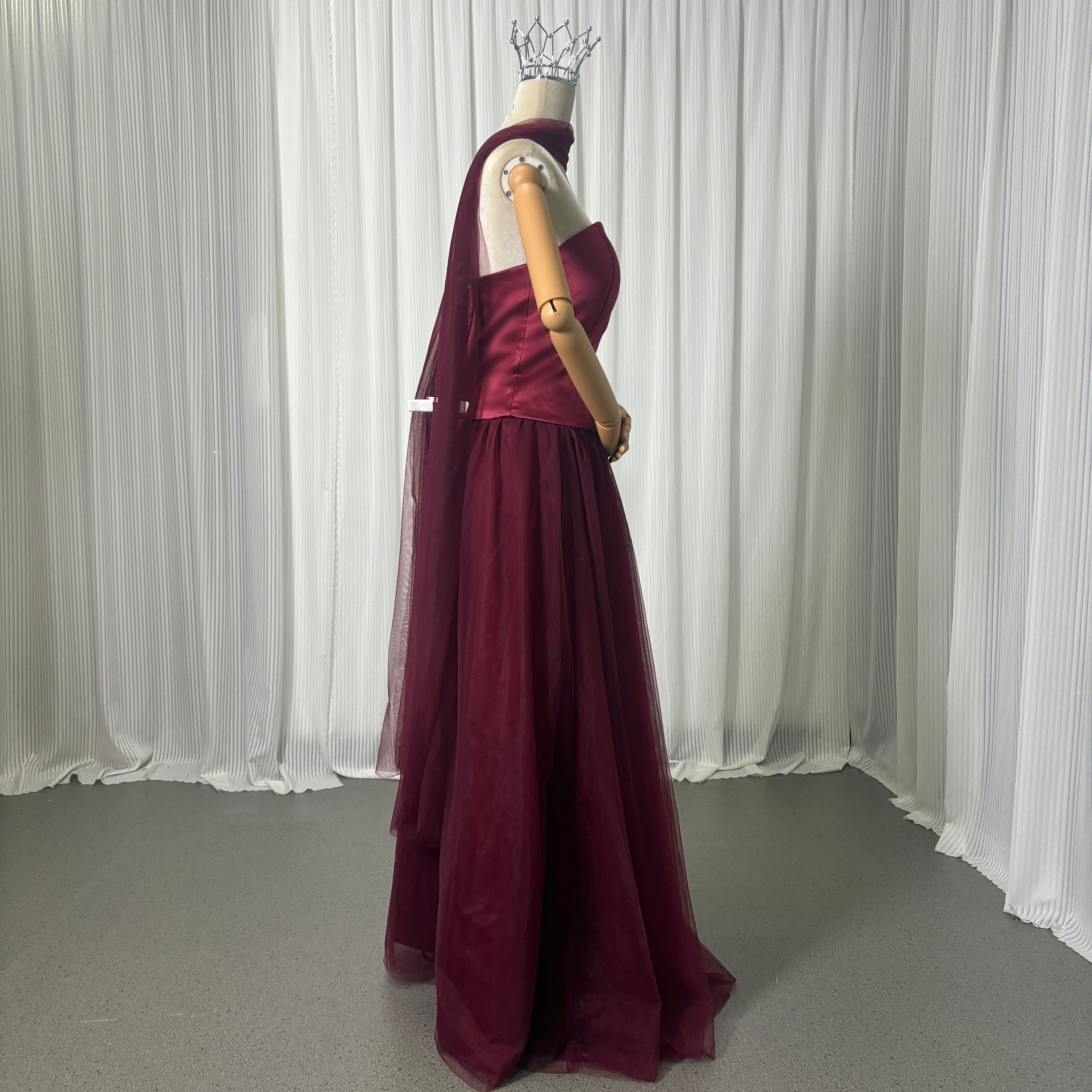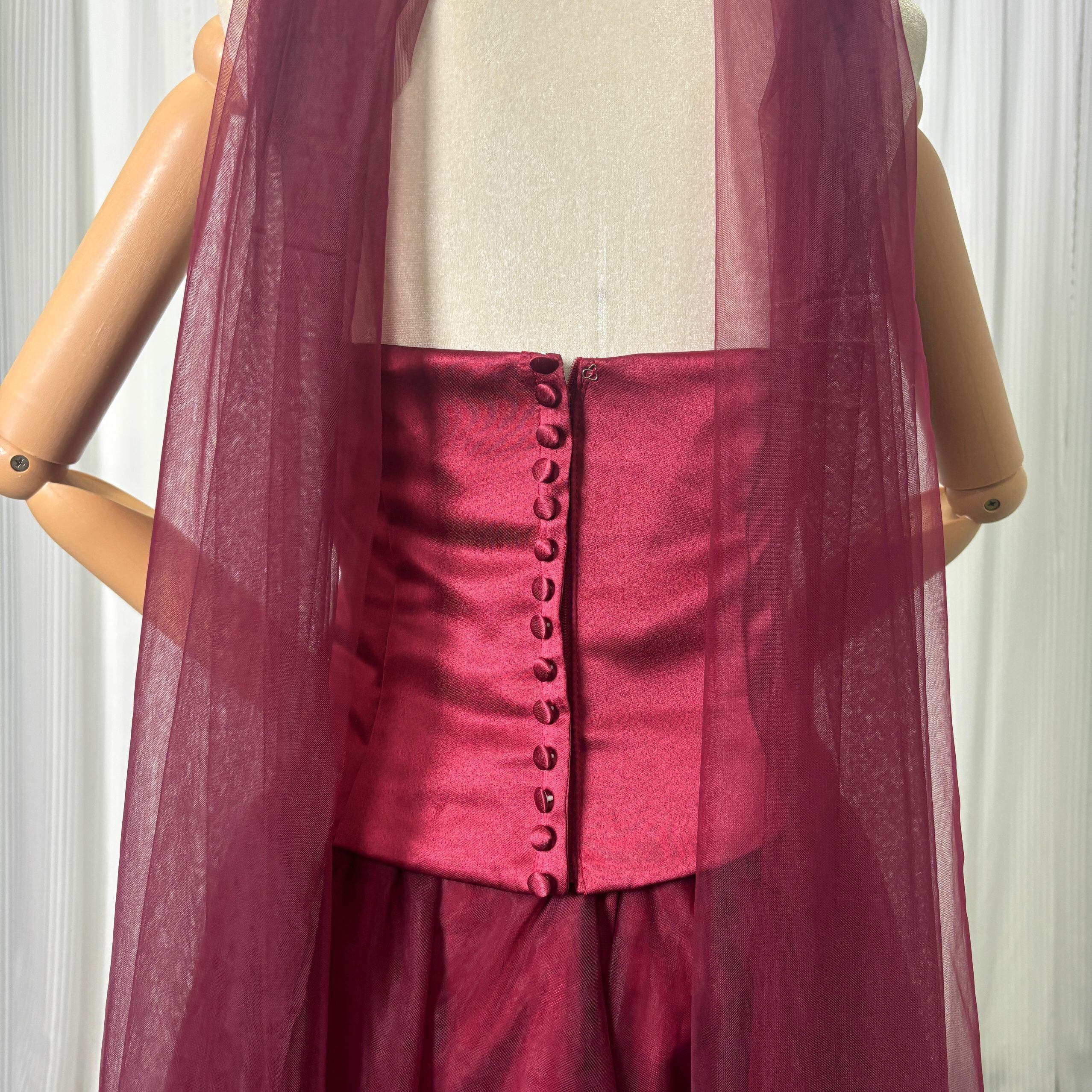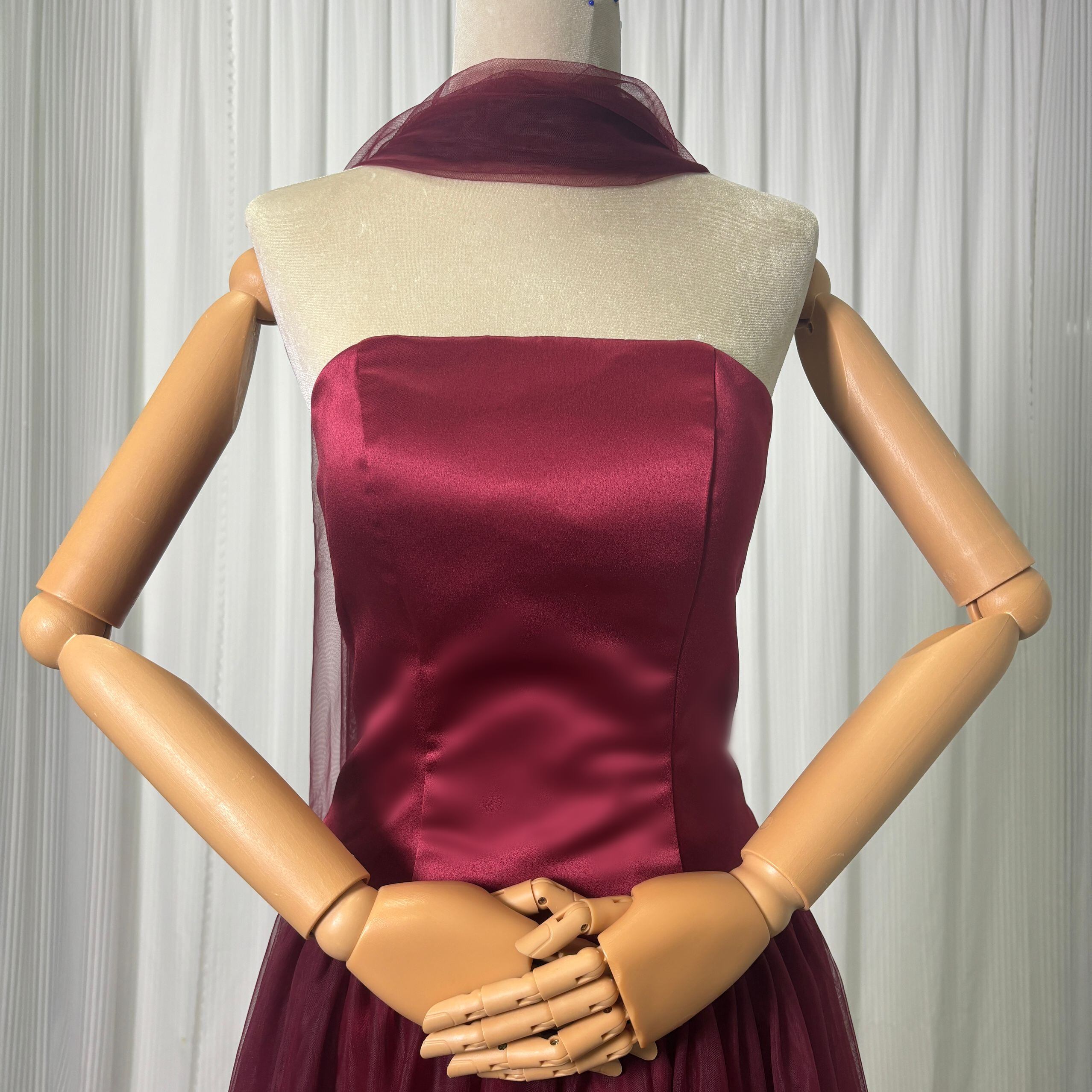 カラードレス ボルドー色 くるみボタン 柔らかく重ねたチュールスカート ツーピース 床付く 前撮り 二次会