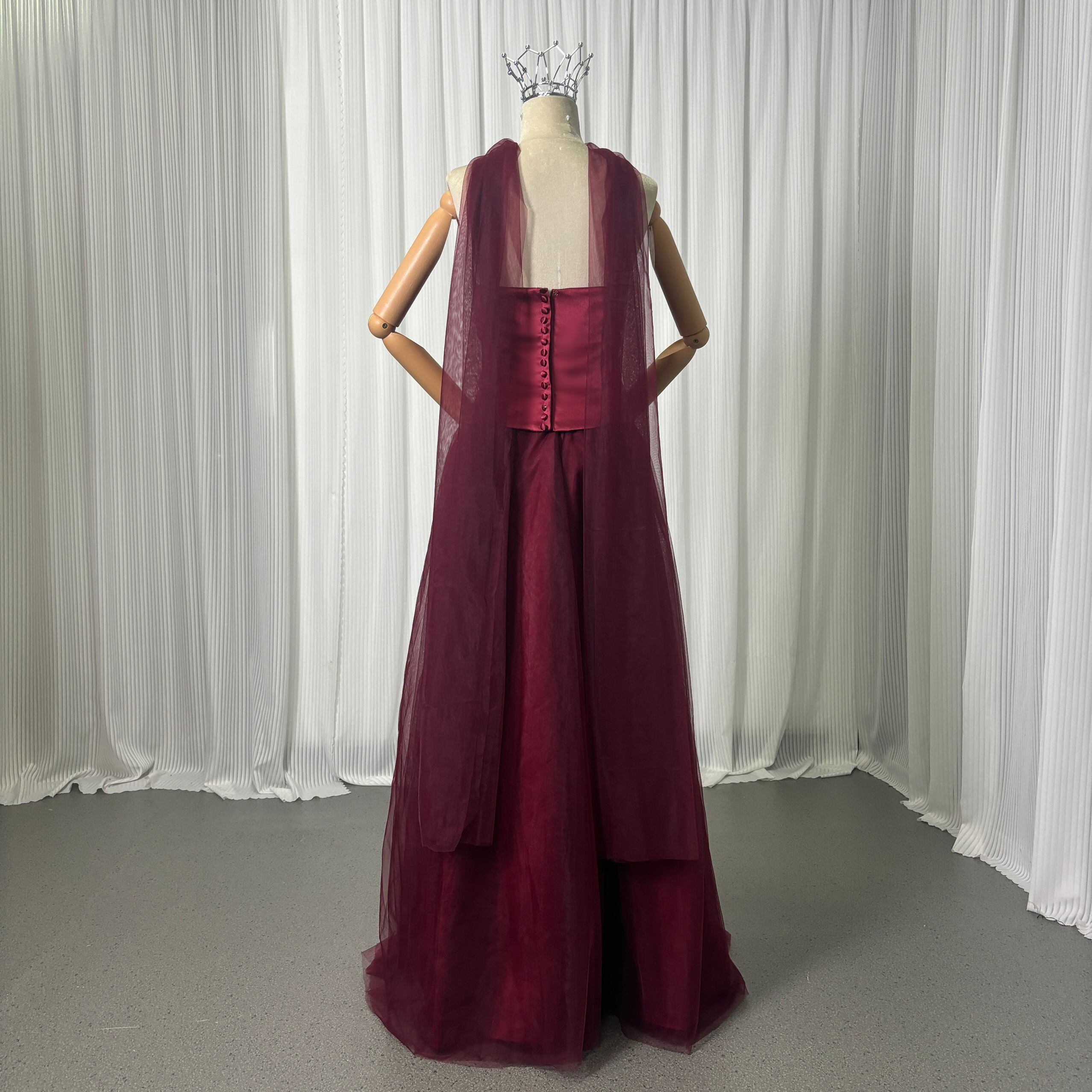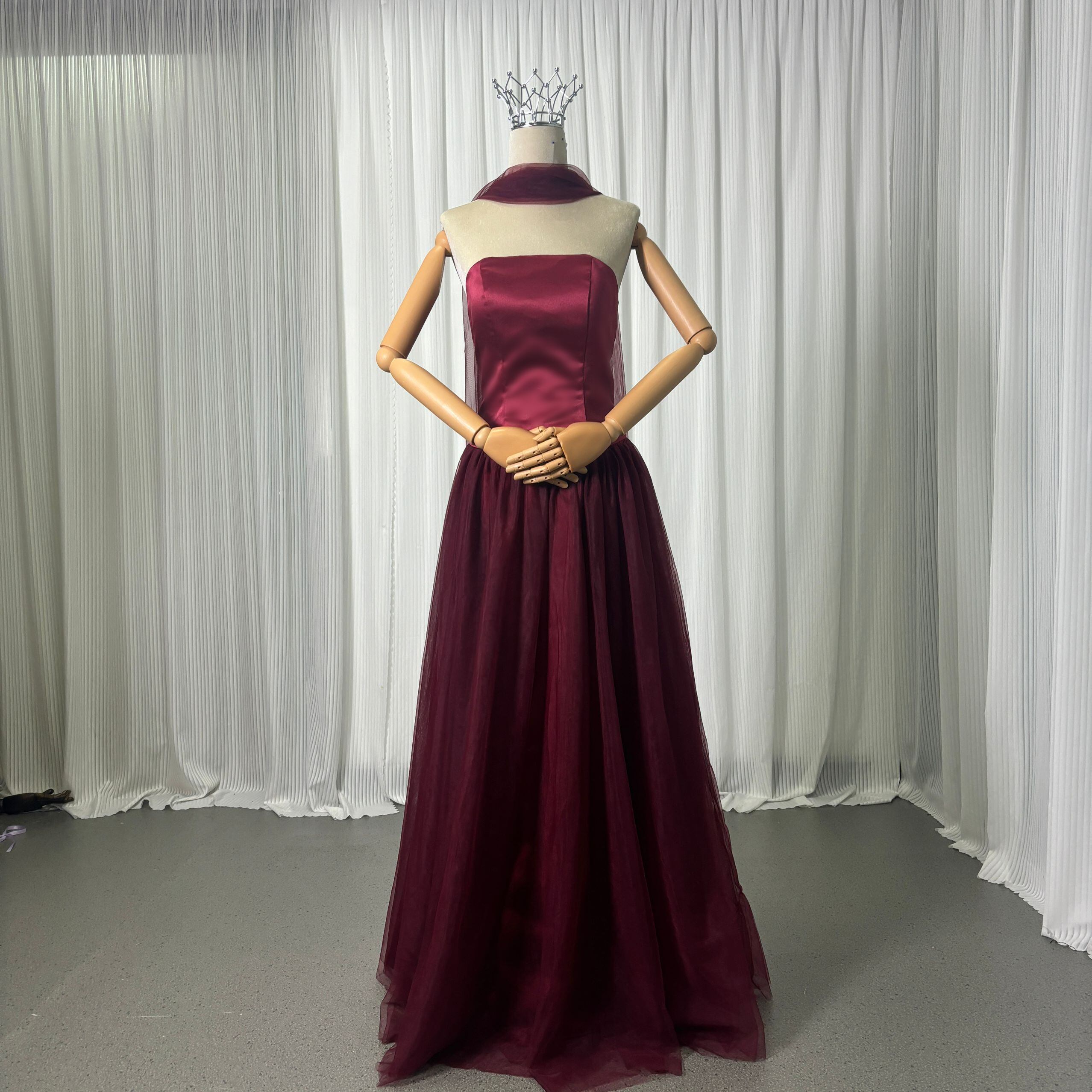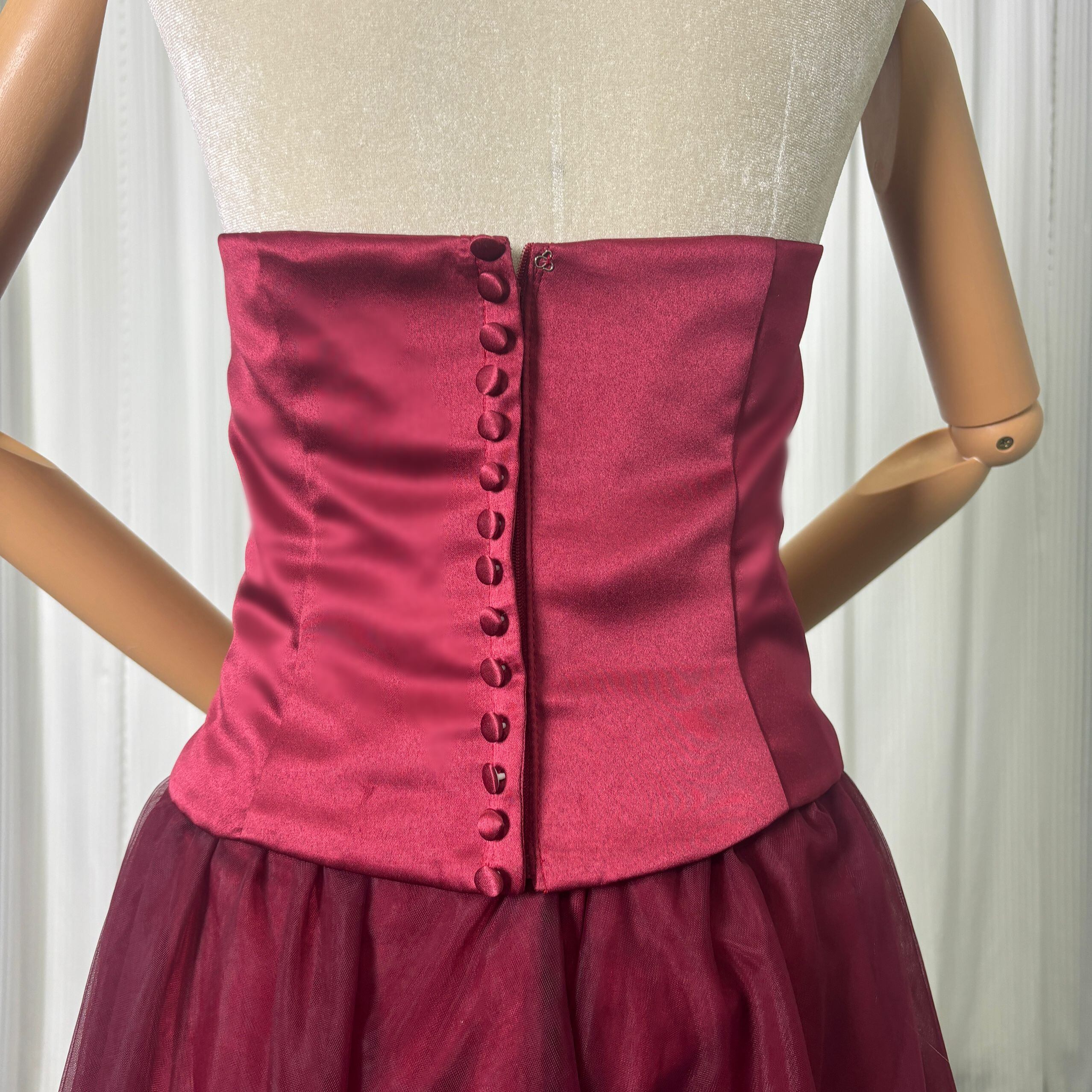 カラードレス ボルドー色 くるみボタン 柔らかく重ねたチュールスカート ツーピース 床付く 前撮り 二次会