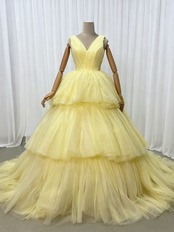 ウェディングドレス キラキラグリッターチュール イエロー プリーツドレス Vネックドレス 绮丽な フレアスカート