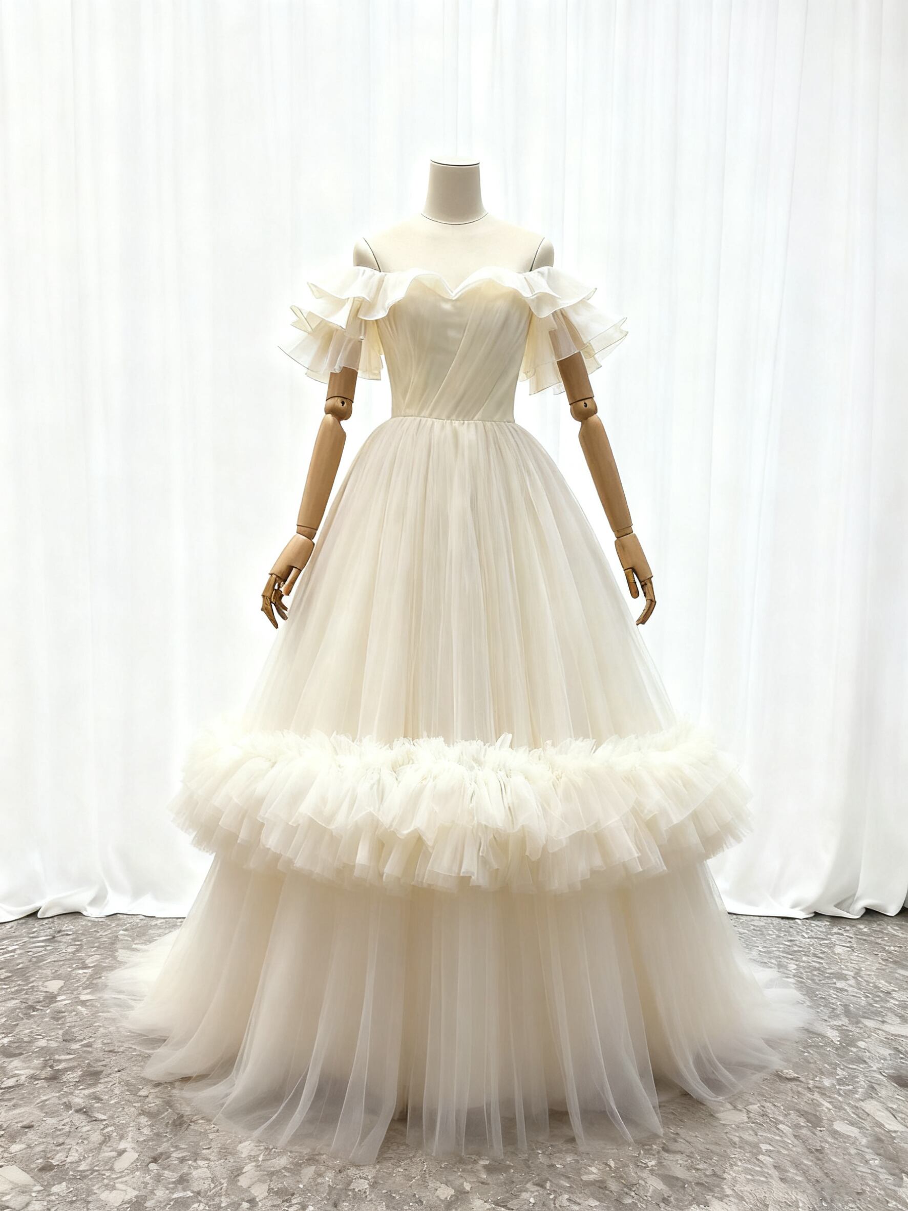 ウェディングドレス オフショルダー チュールスカート ラッフルフリル プリンセスライン Aライン 花嫁