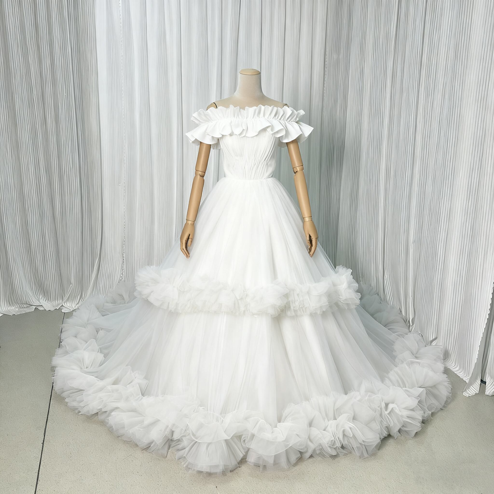 ウェディングドレス 抜群のおしゃれ見え 取り外しオフショルダー ラッフルフリル 華やかなトレーン 前撮り