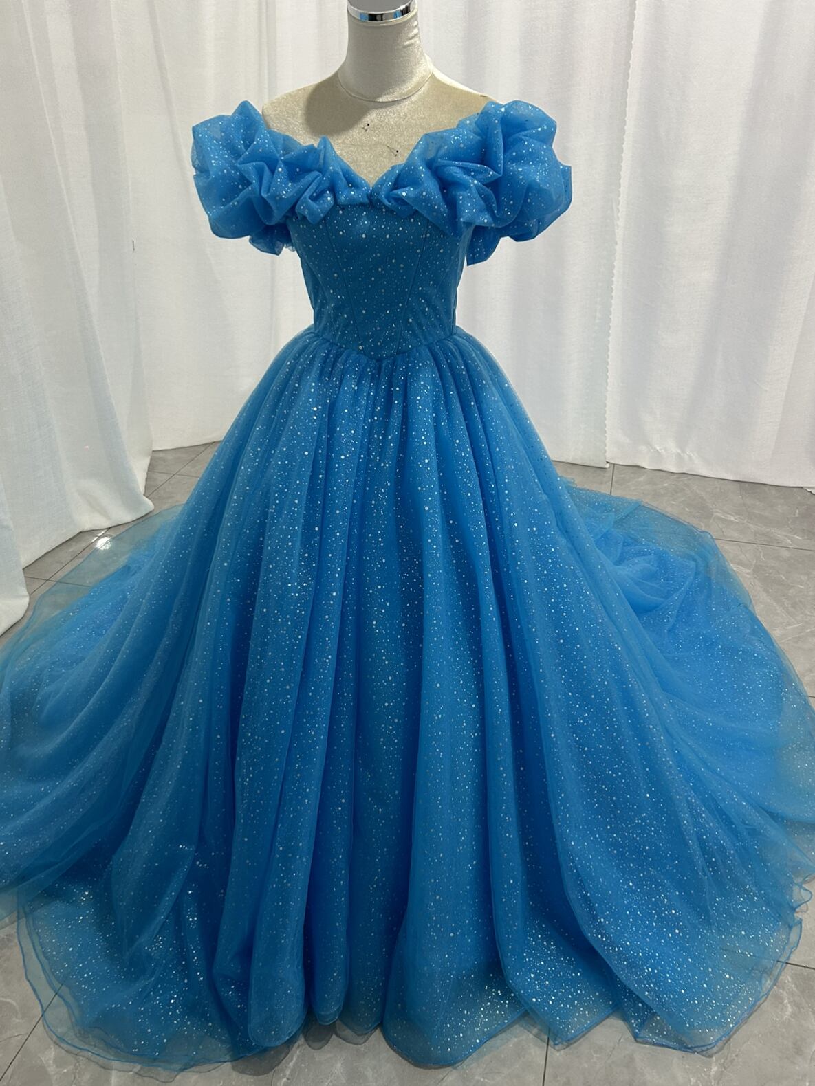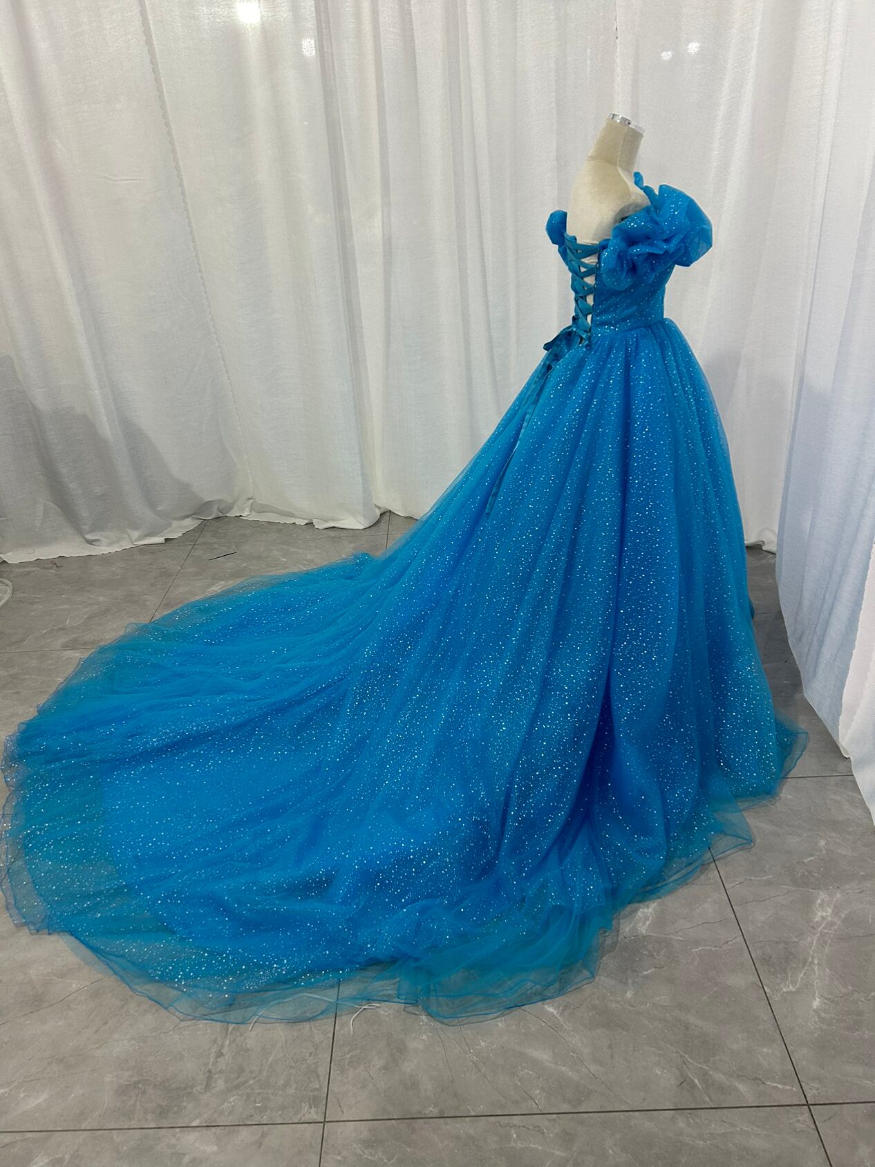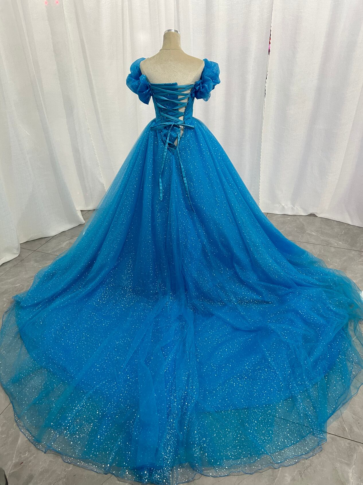 カラードレス オフショルダー 爽やかで優しいブルー キラキラグリッターチュール 編み上げ 花嫁 結婚式