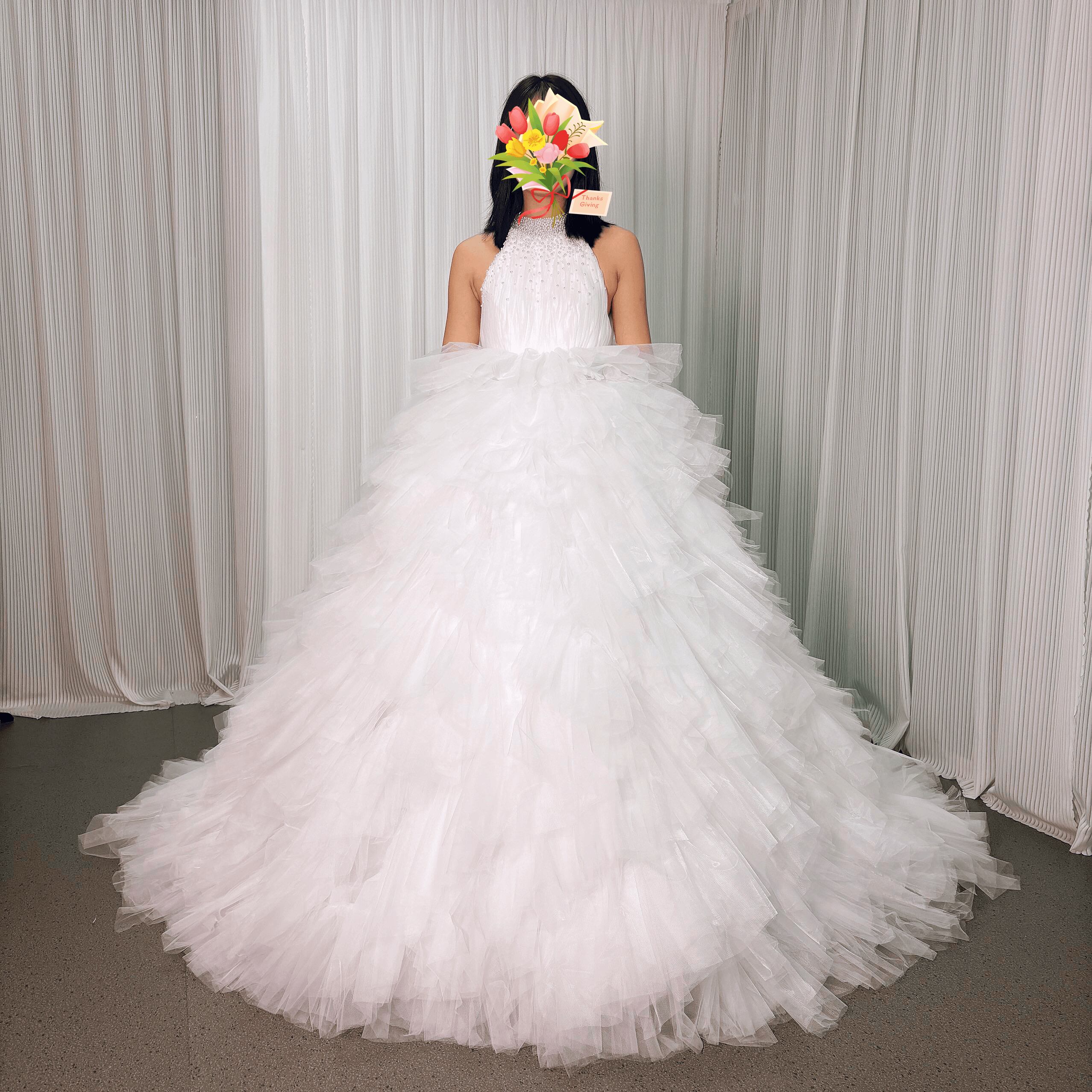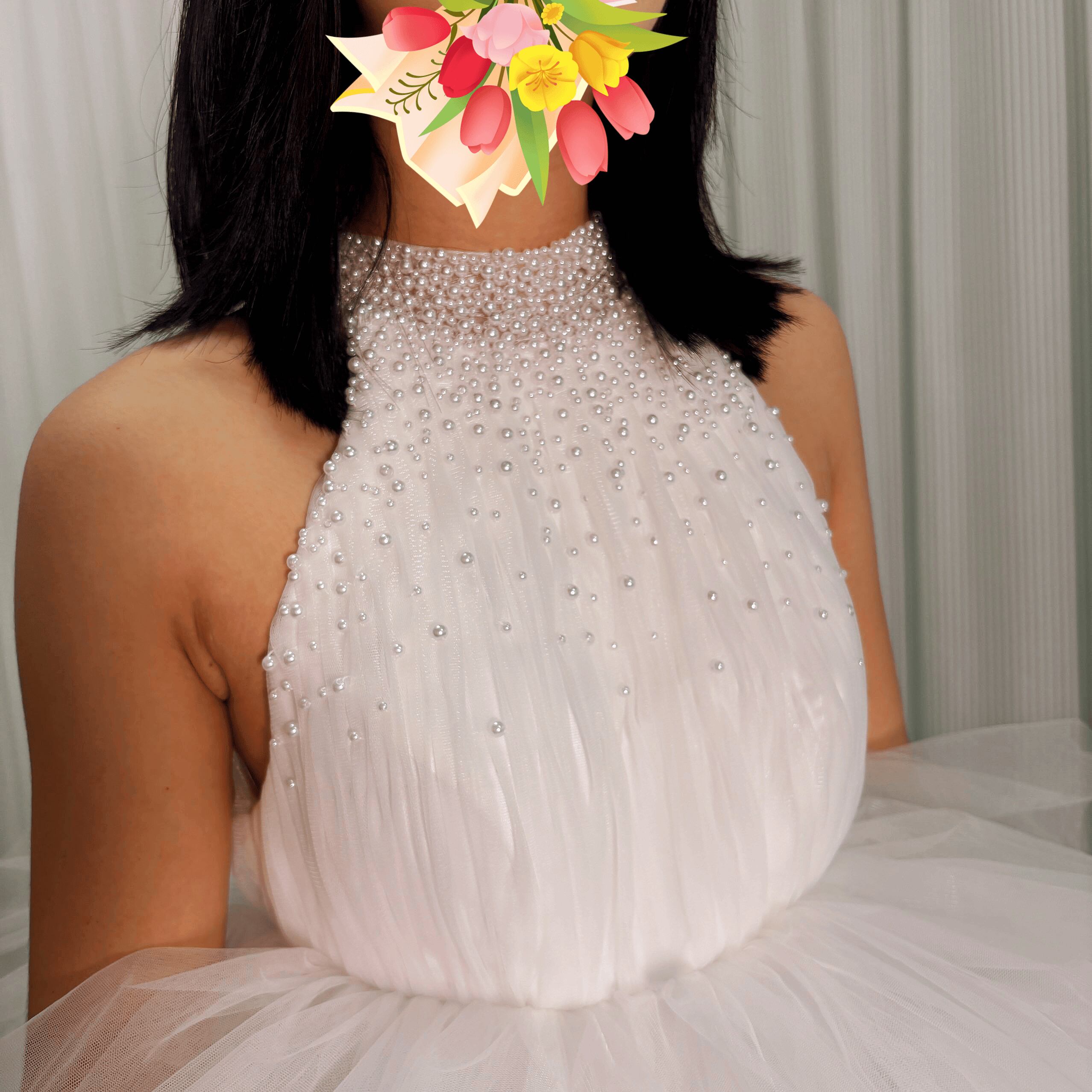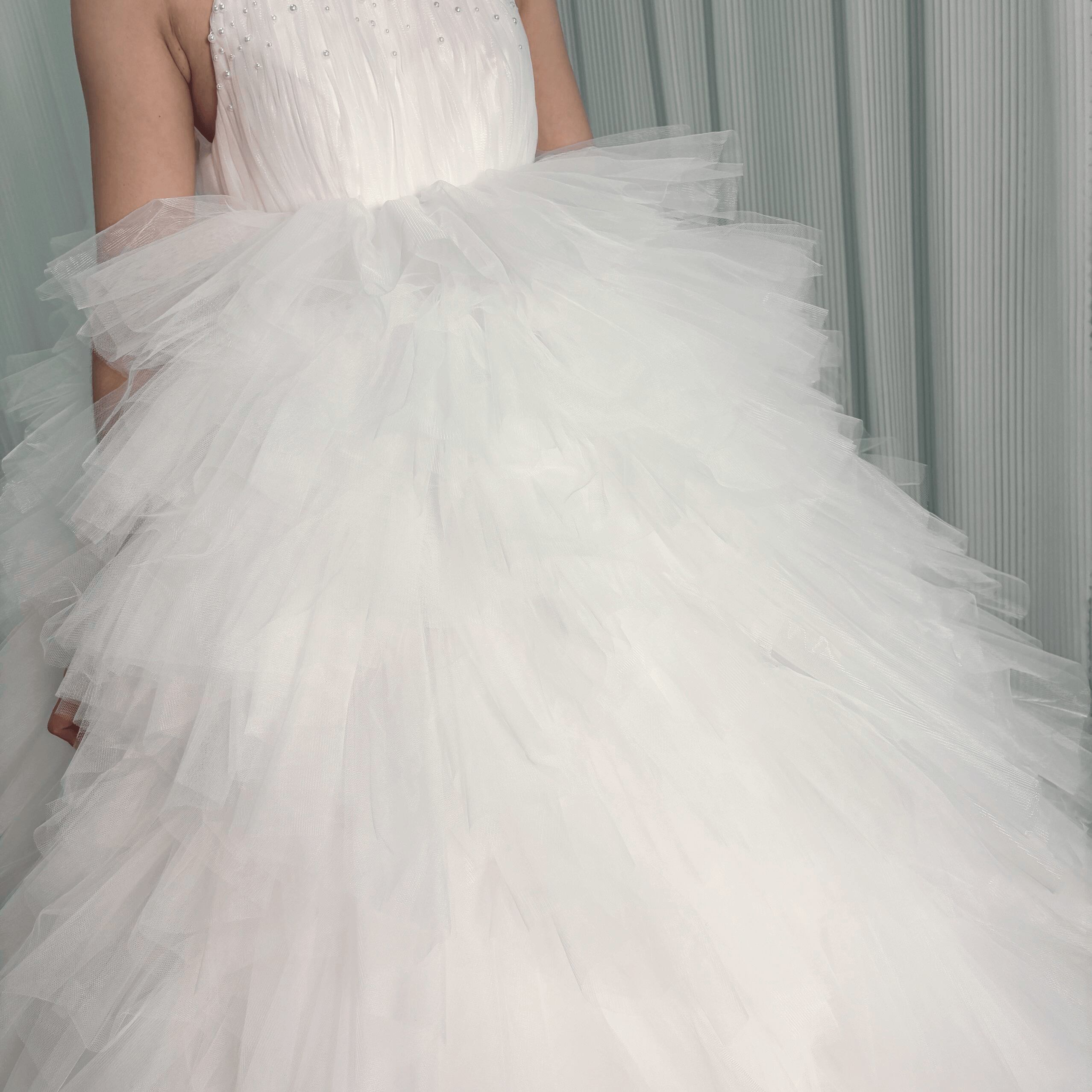 ウェディングドレス アメスリ パール もこもこドレス プリンセスライン ソフトチュール 花嫁 ノースリーブ