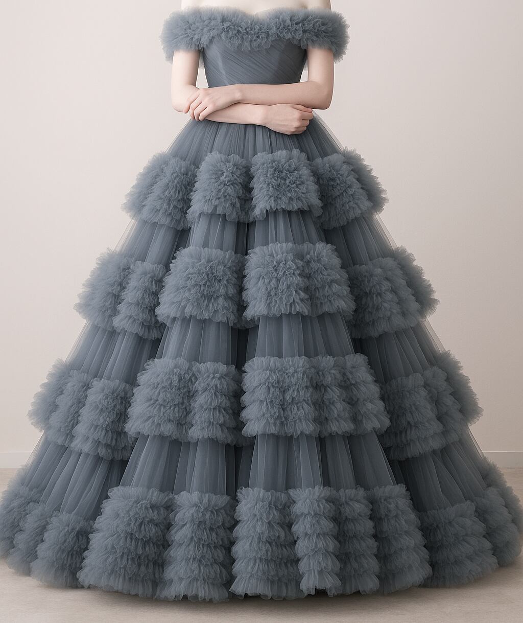 カラードレス ブルーグレー ティアードのドレス ふわふわドレス 床付く ブライダル 抜群におしゃれ度が際立つ 爽やかで優しいブルー