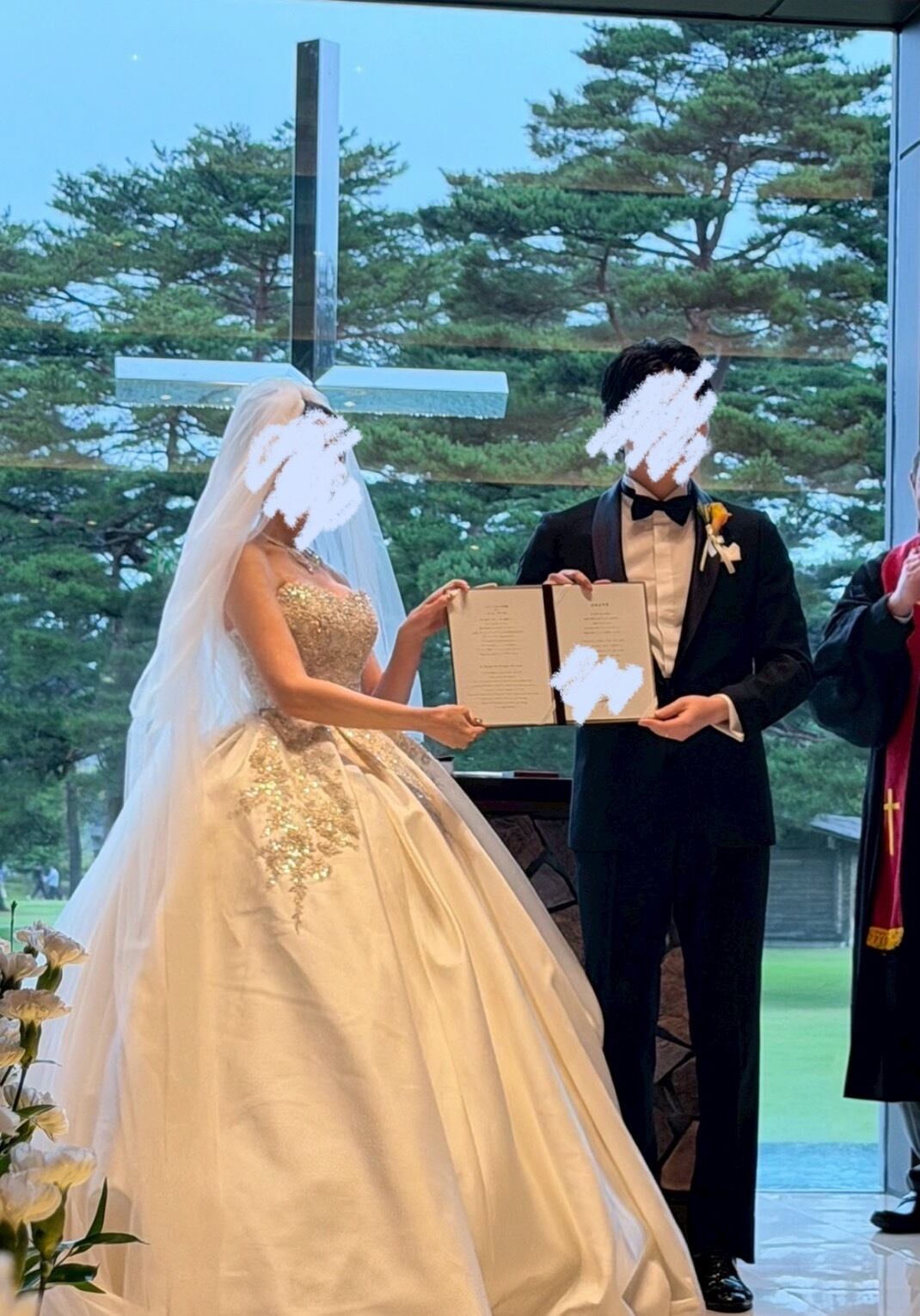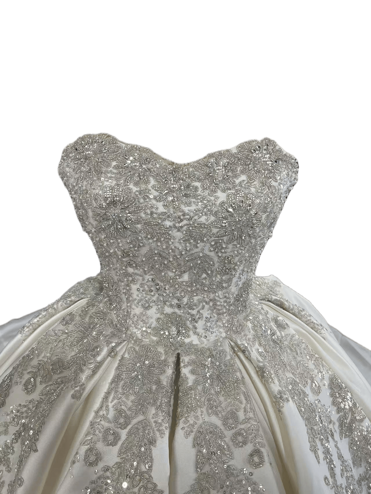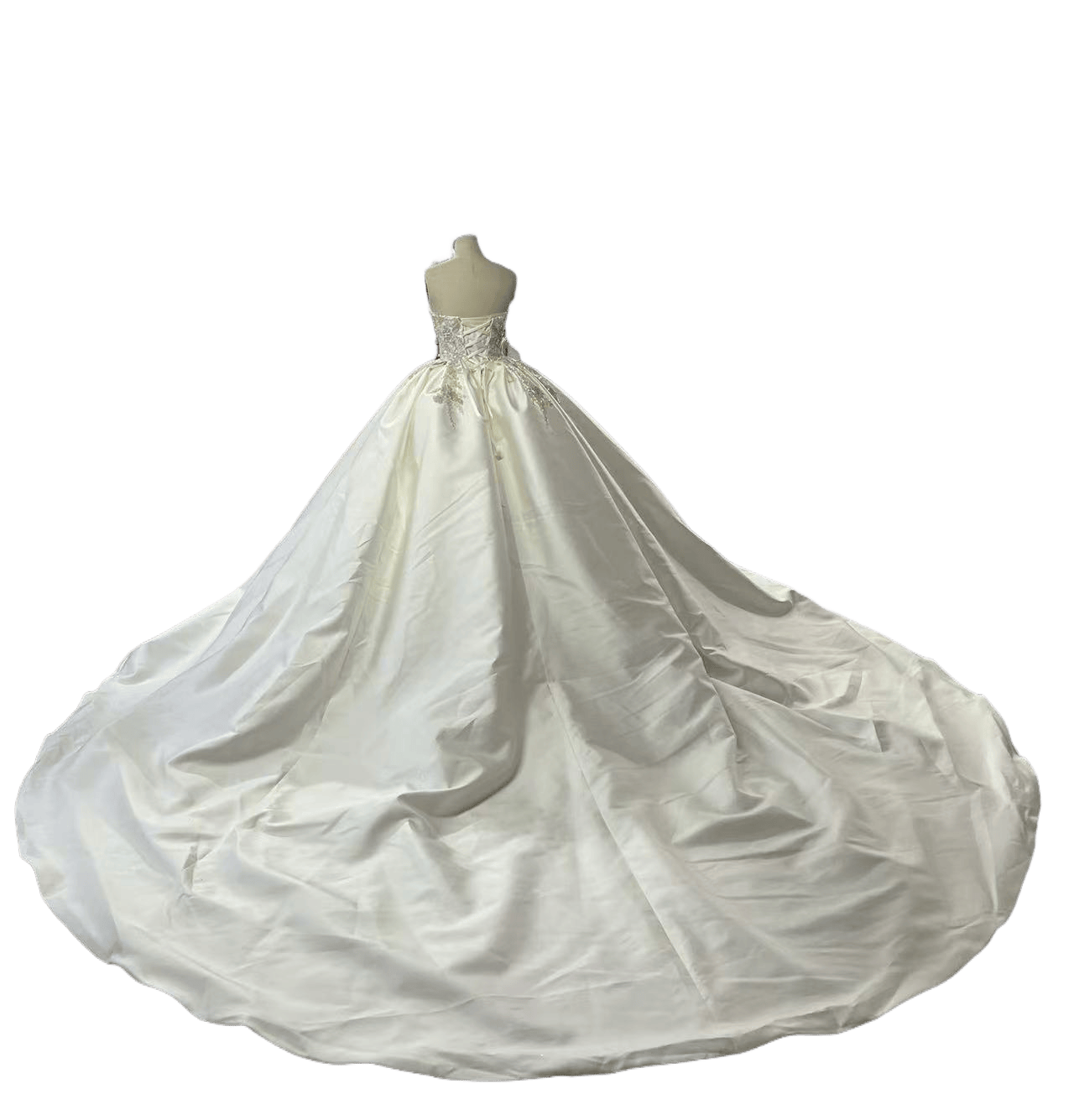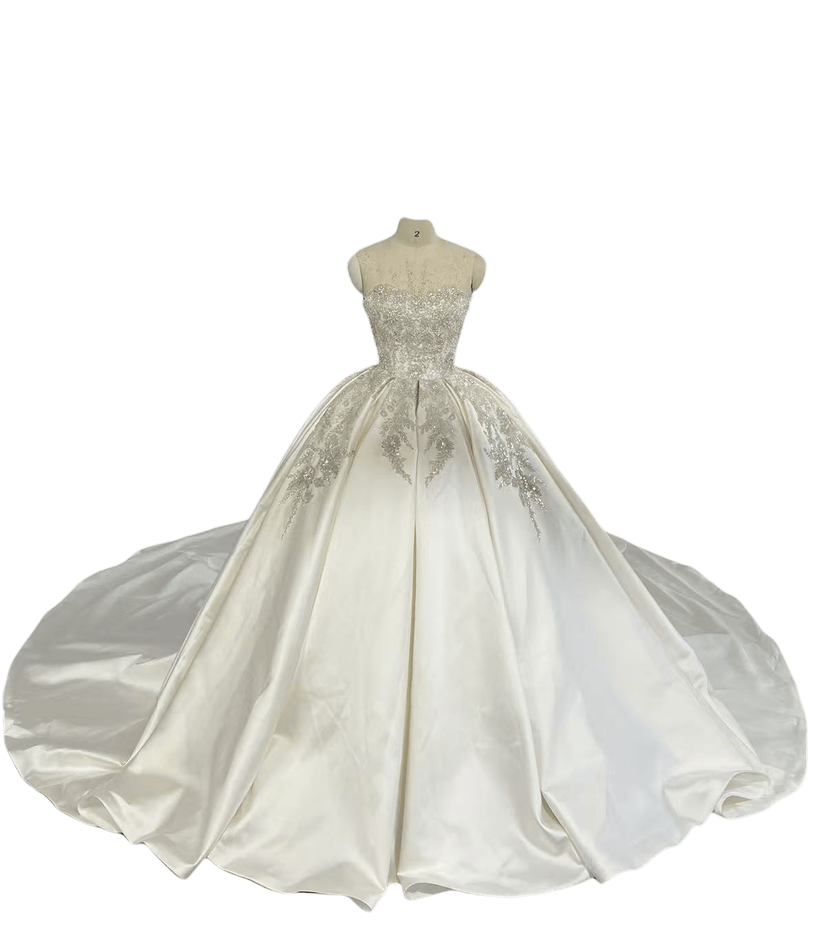 ウェディングドレス 韓国風ドレス ベアトップ ビジュー ミカドサテン 華やかなトレーン 結婚式