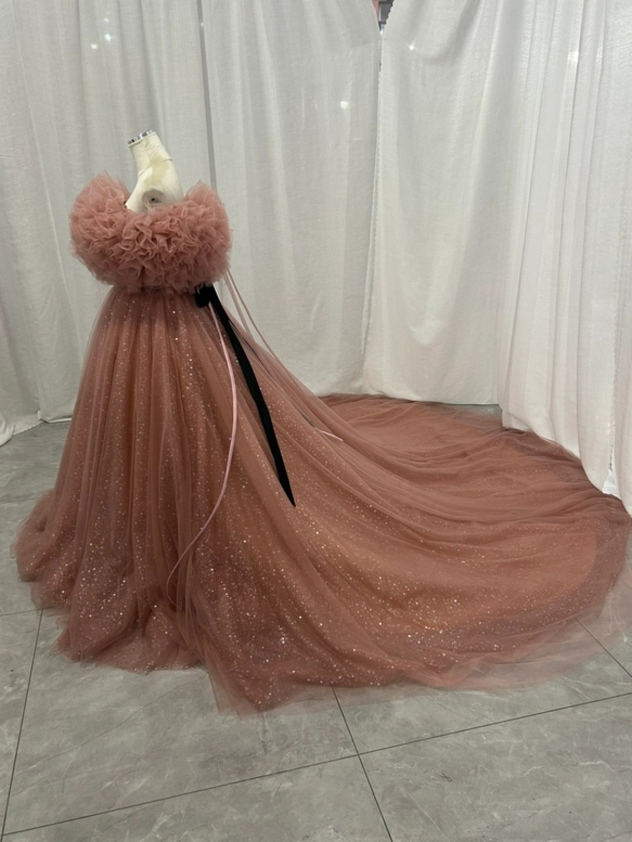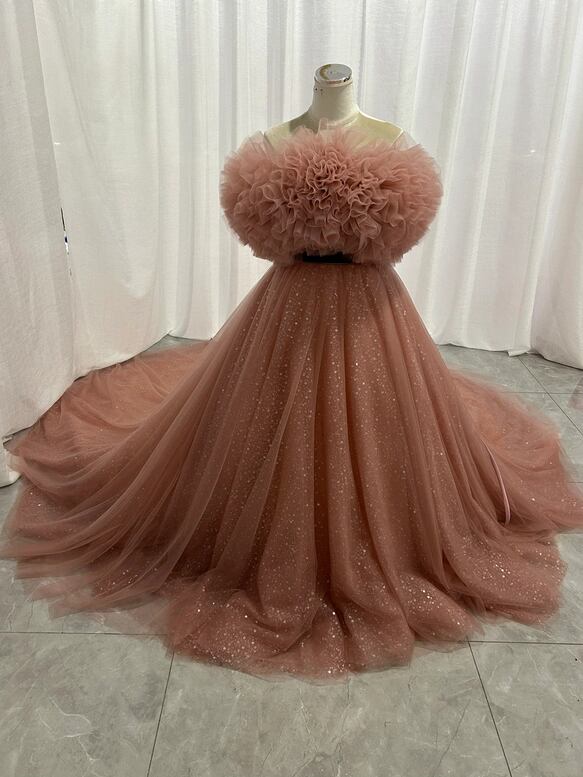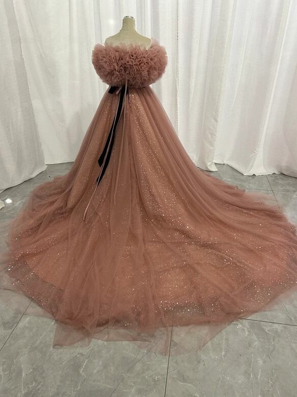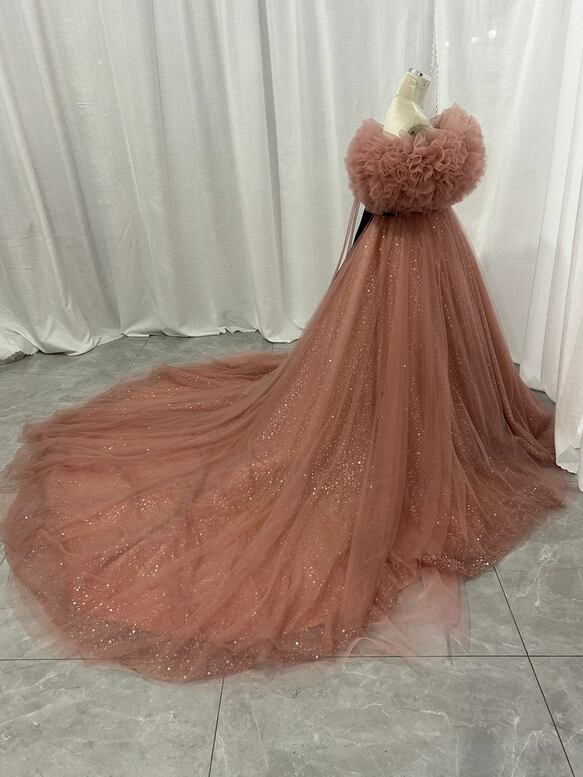 人気上昇!カラードレス ピンク オフショルダー キラキラグリッターチュール 披露宴 可愛い