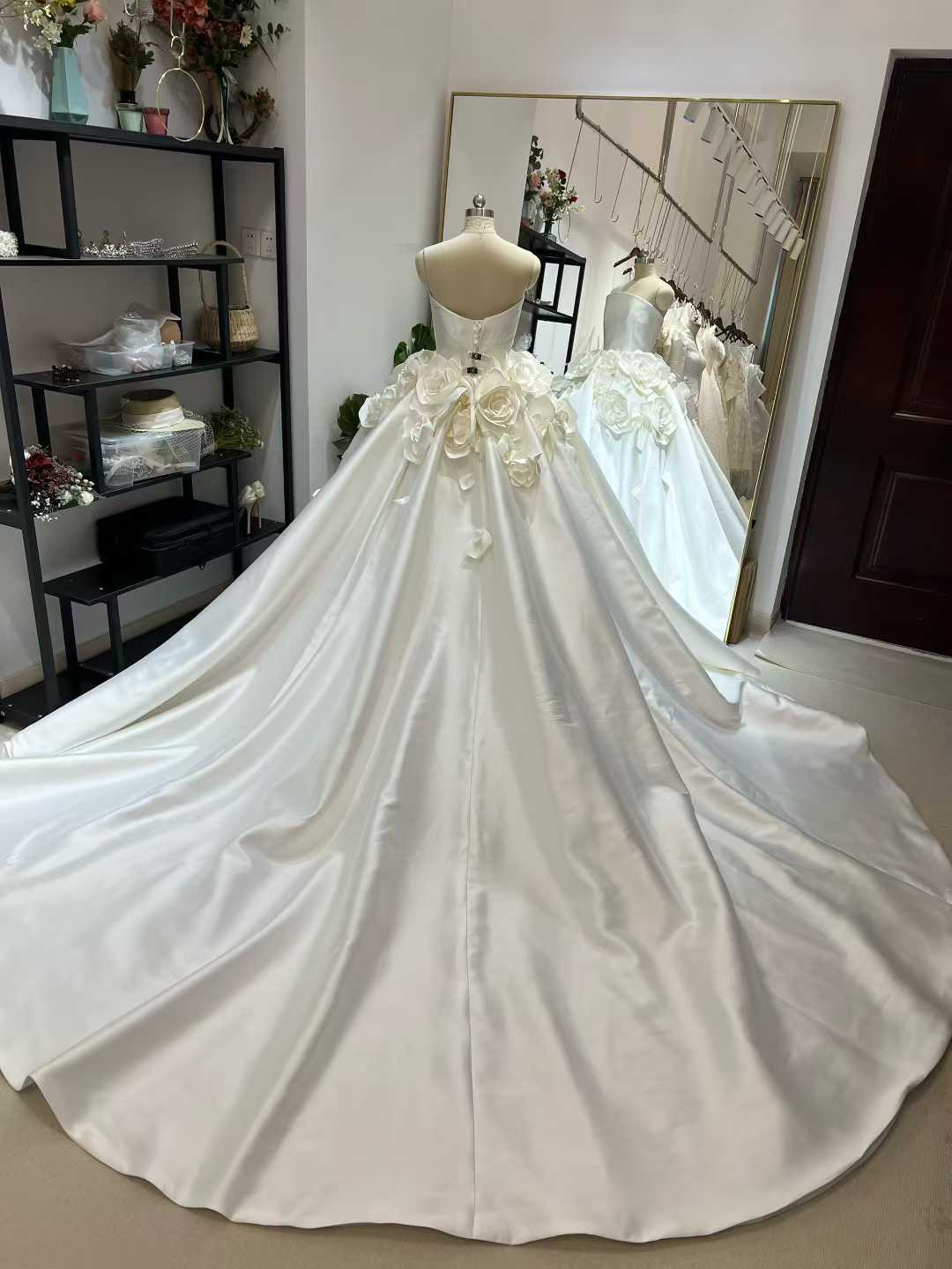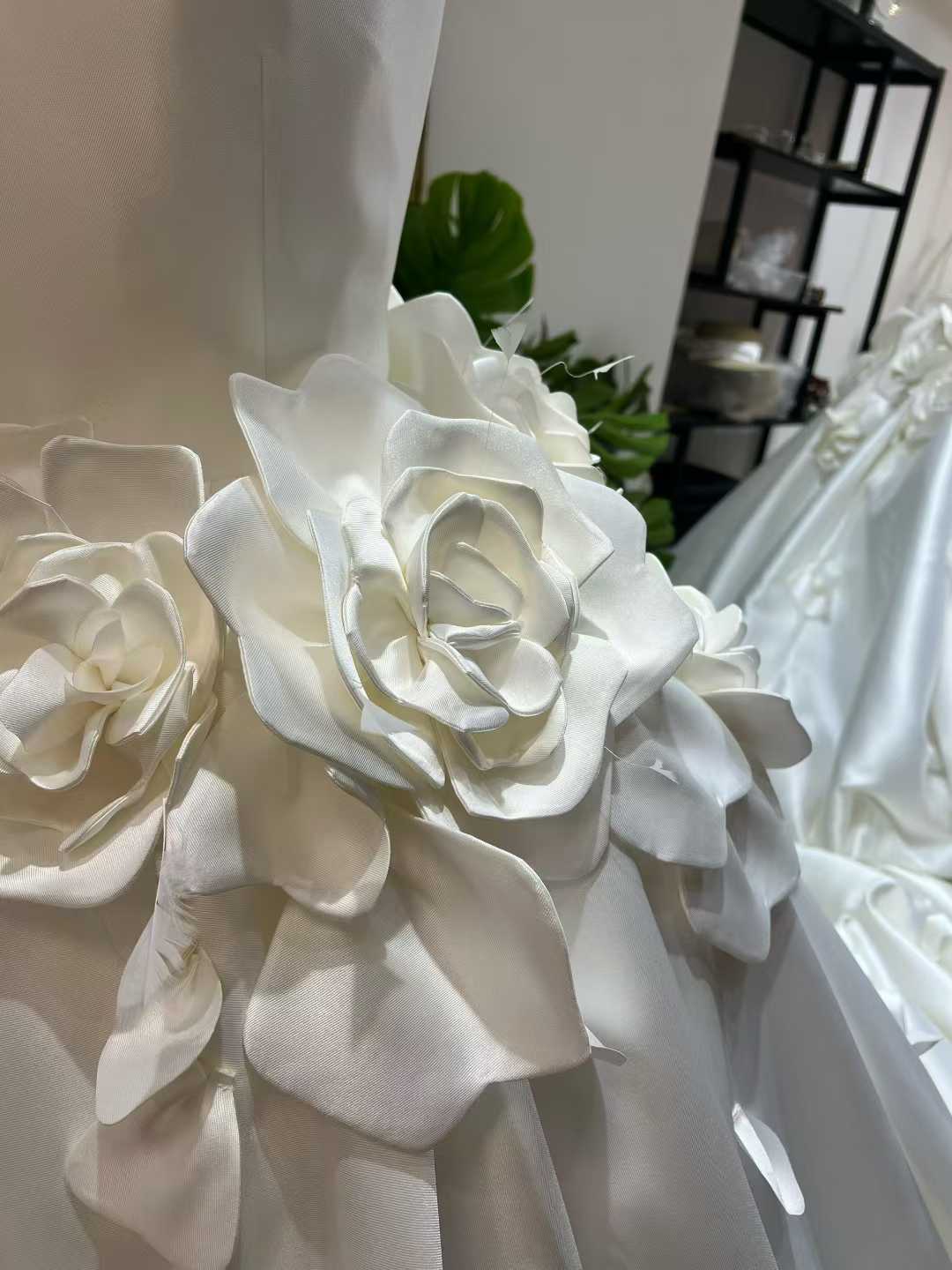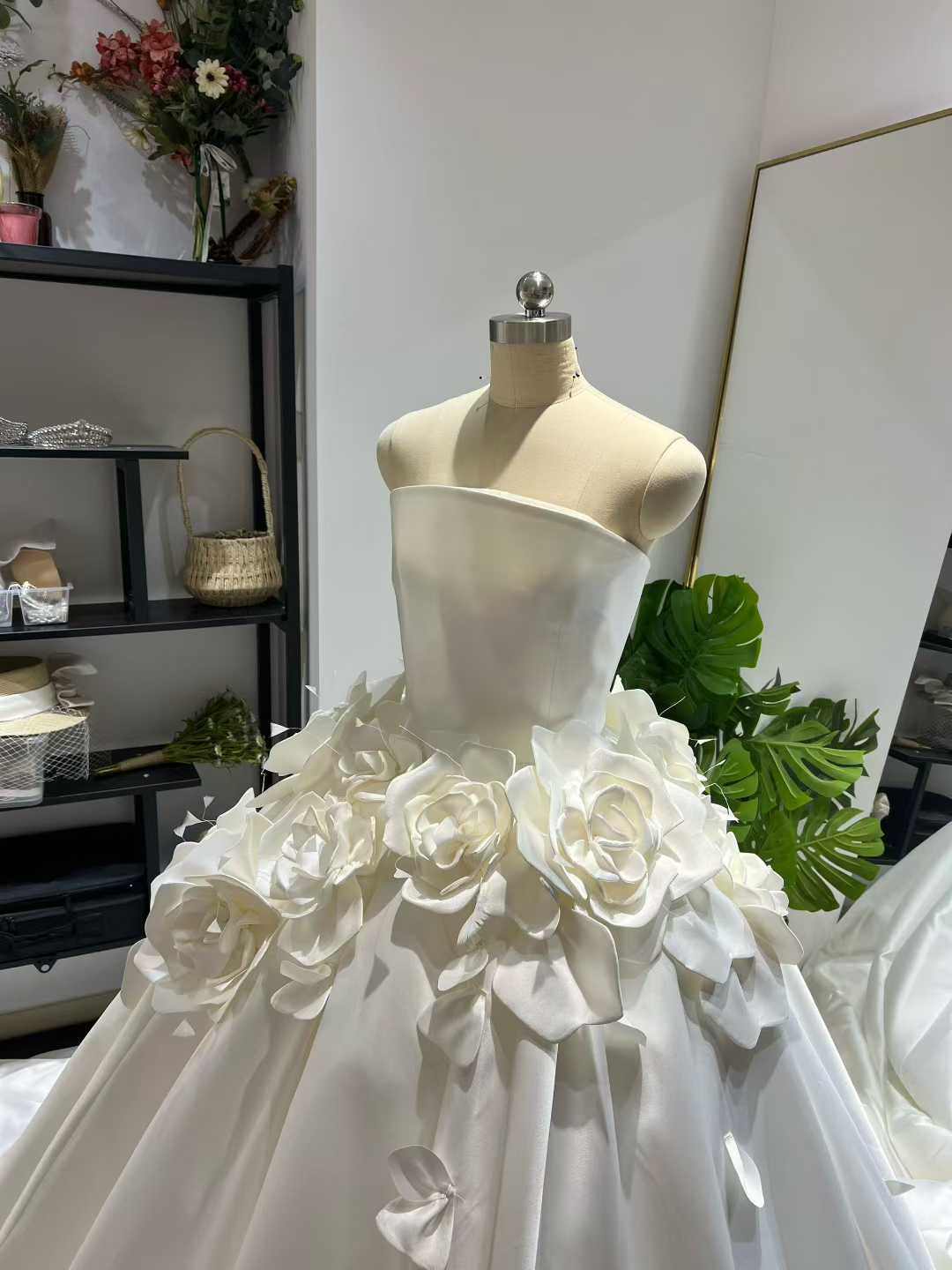 華やか!ウェディングドレス バラトレーン ベアトップ 細見えシルエット オフホワイト 韓国風ドレス 花嫁