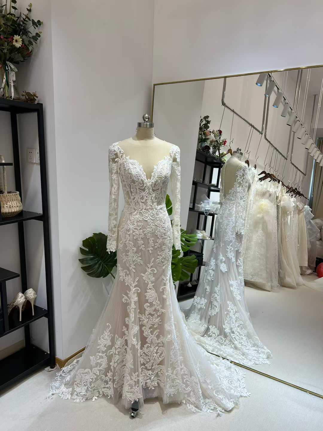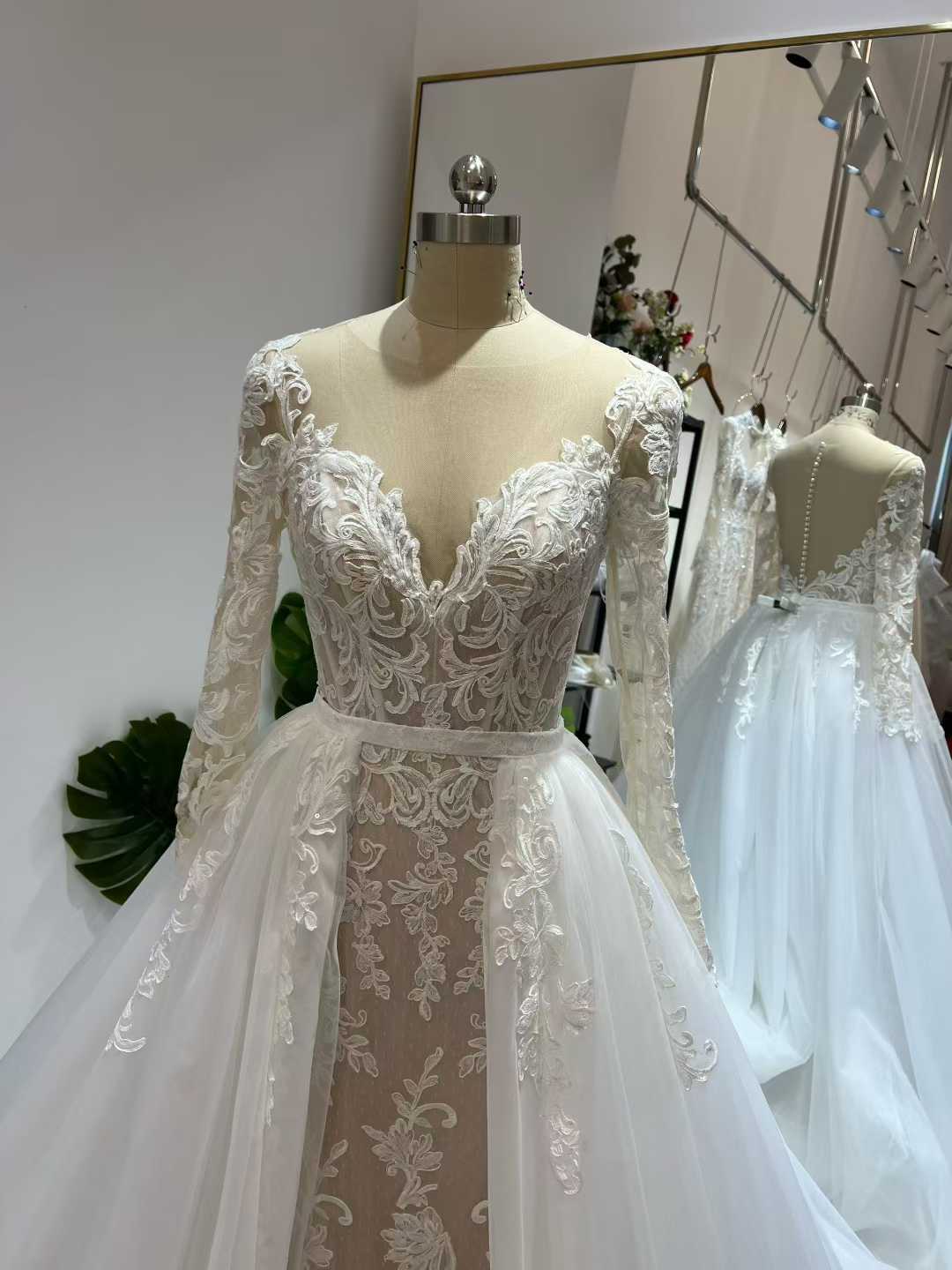 ウェディングドレス ロングスリーブ オーバースカート マーメイドライン 魅惑の花レース エレガント 結婚式