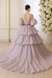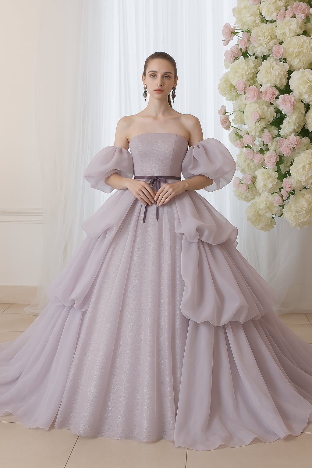 カラードレス オーキッド パフスリーブ ティアードのドレス ベルト ラッフルフリル 花嫁/ウェディングドレス