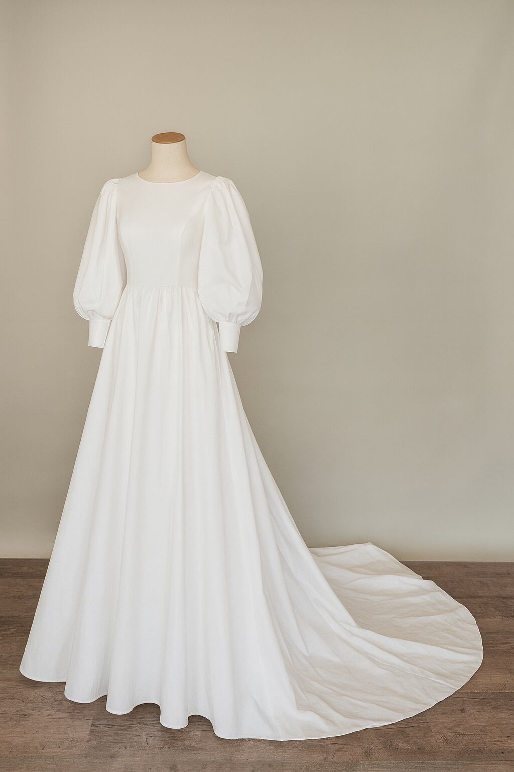 ウエディングドレス 七分袖丈 シルクタフタ オフホワイト Aライン スレンダーライン ブライダル
