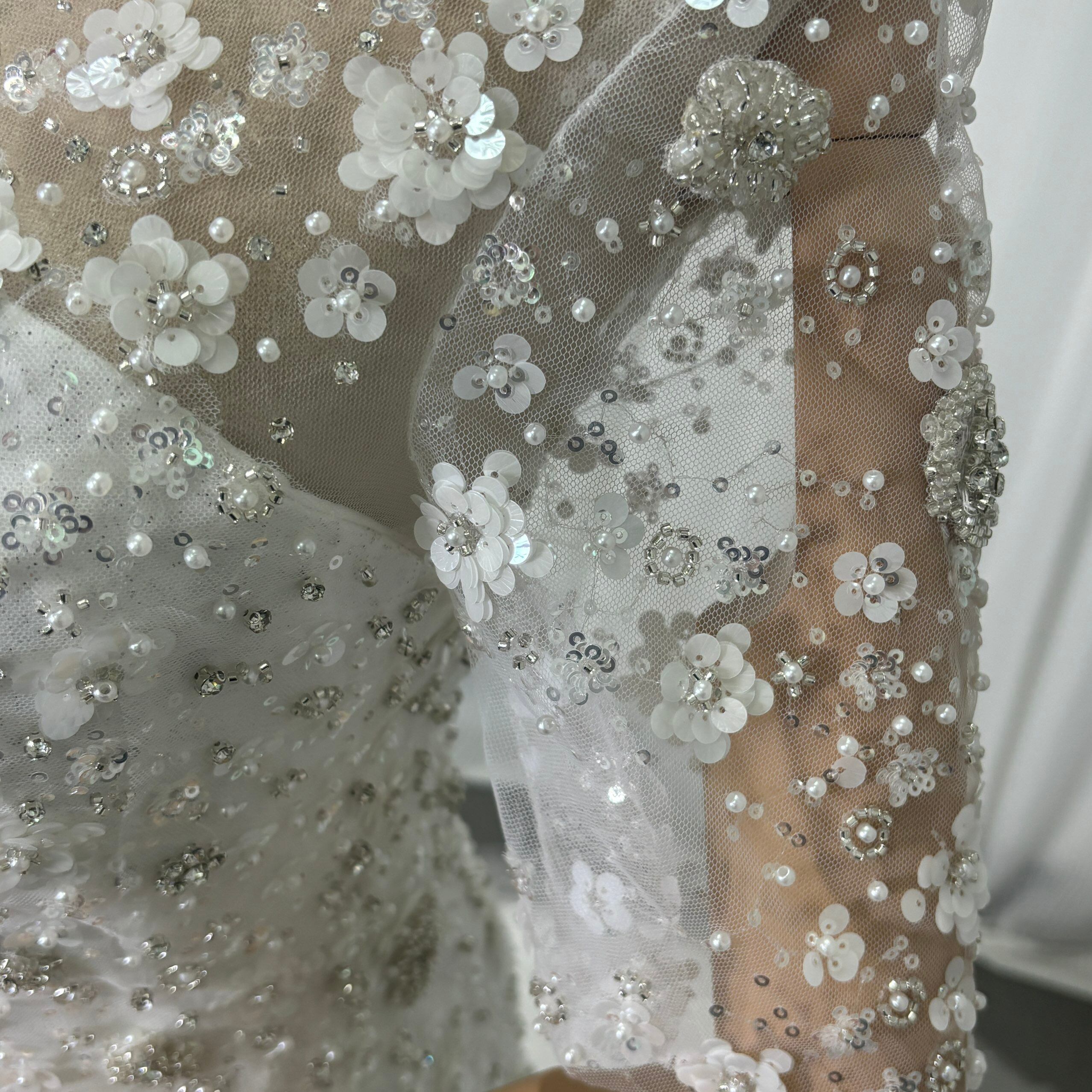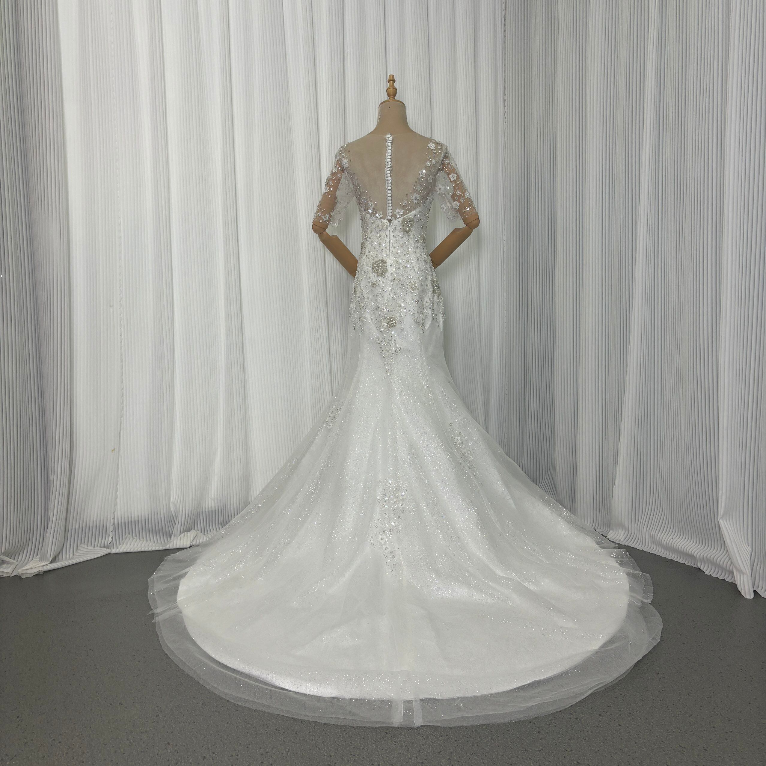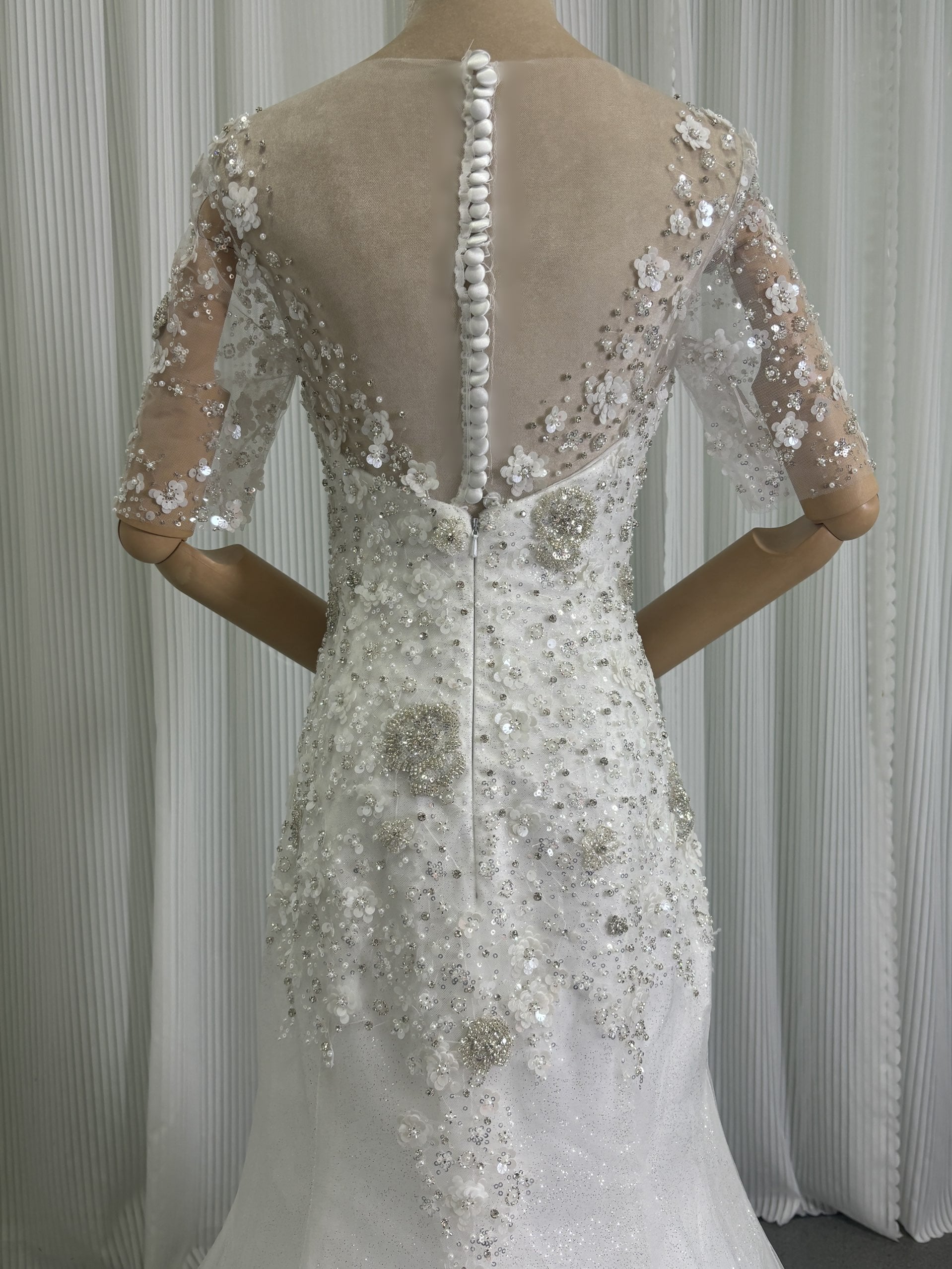 ウエディングドレス 3D立体レース刺繍 半袖 キラキラグリッターチュール くるみボタン マーメイド /結婚式
