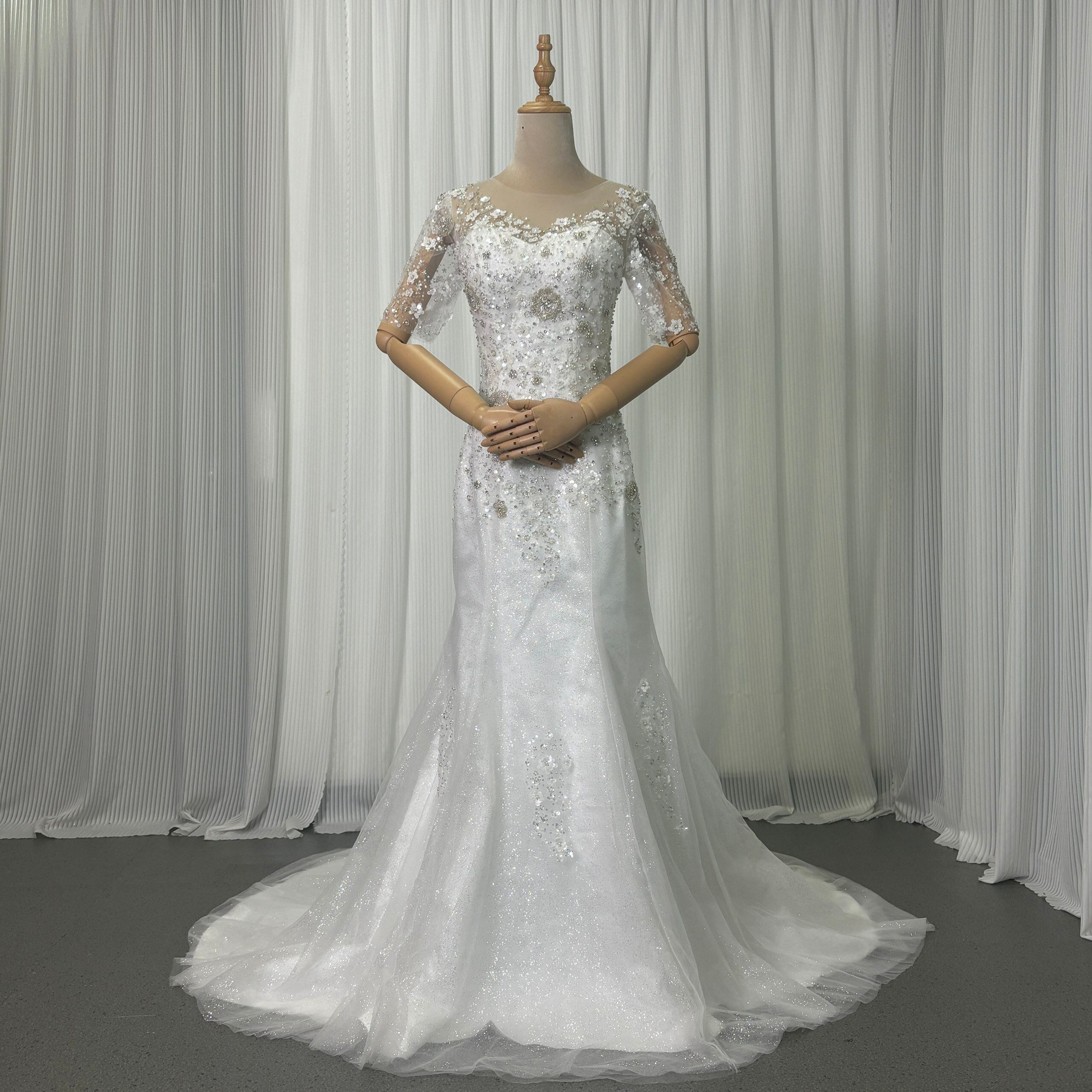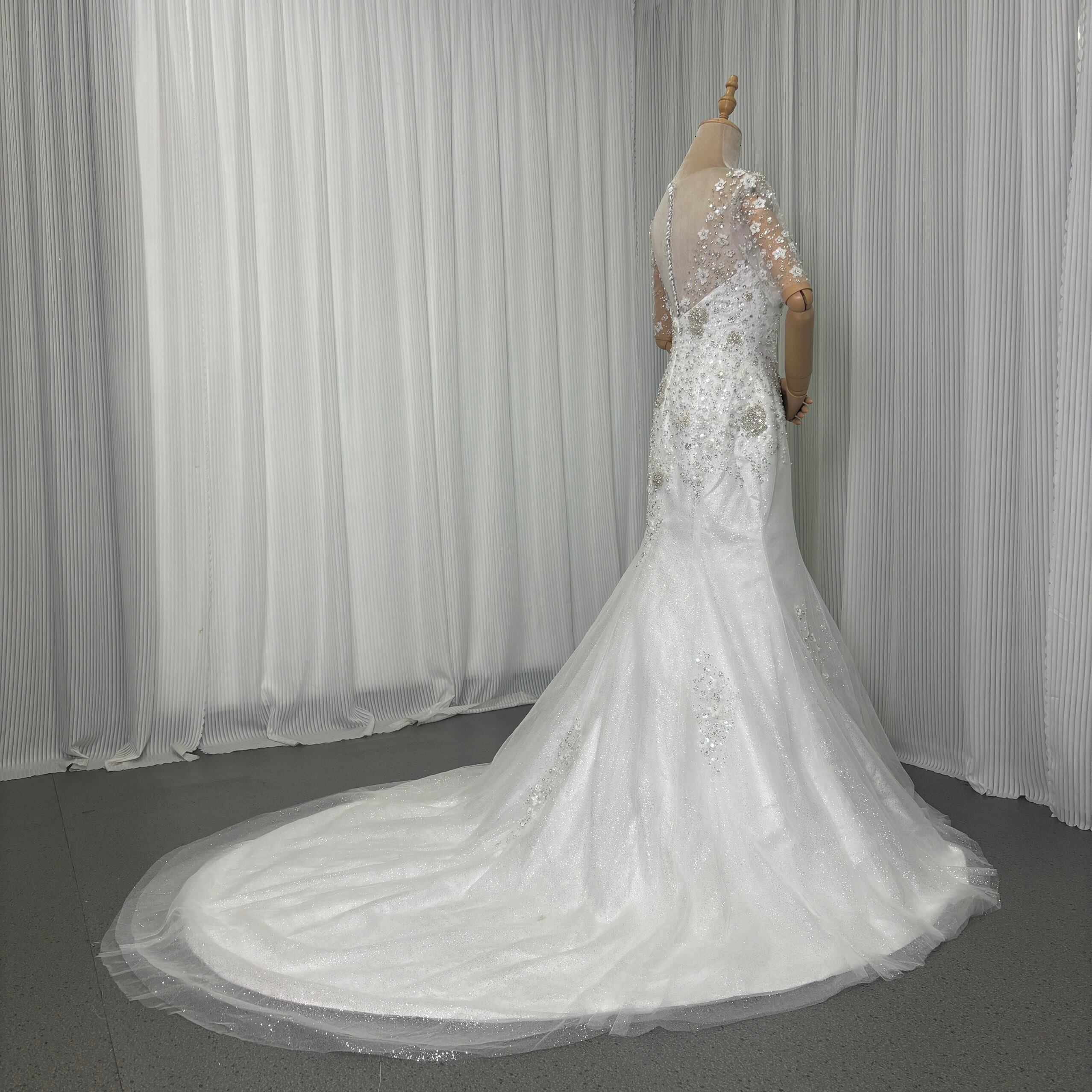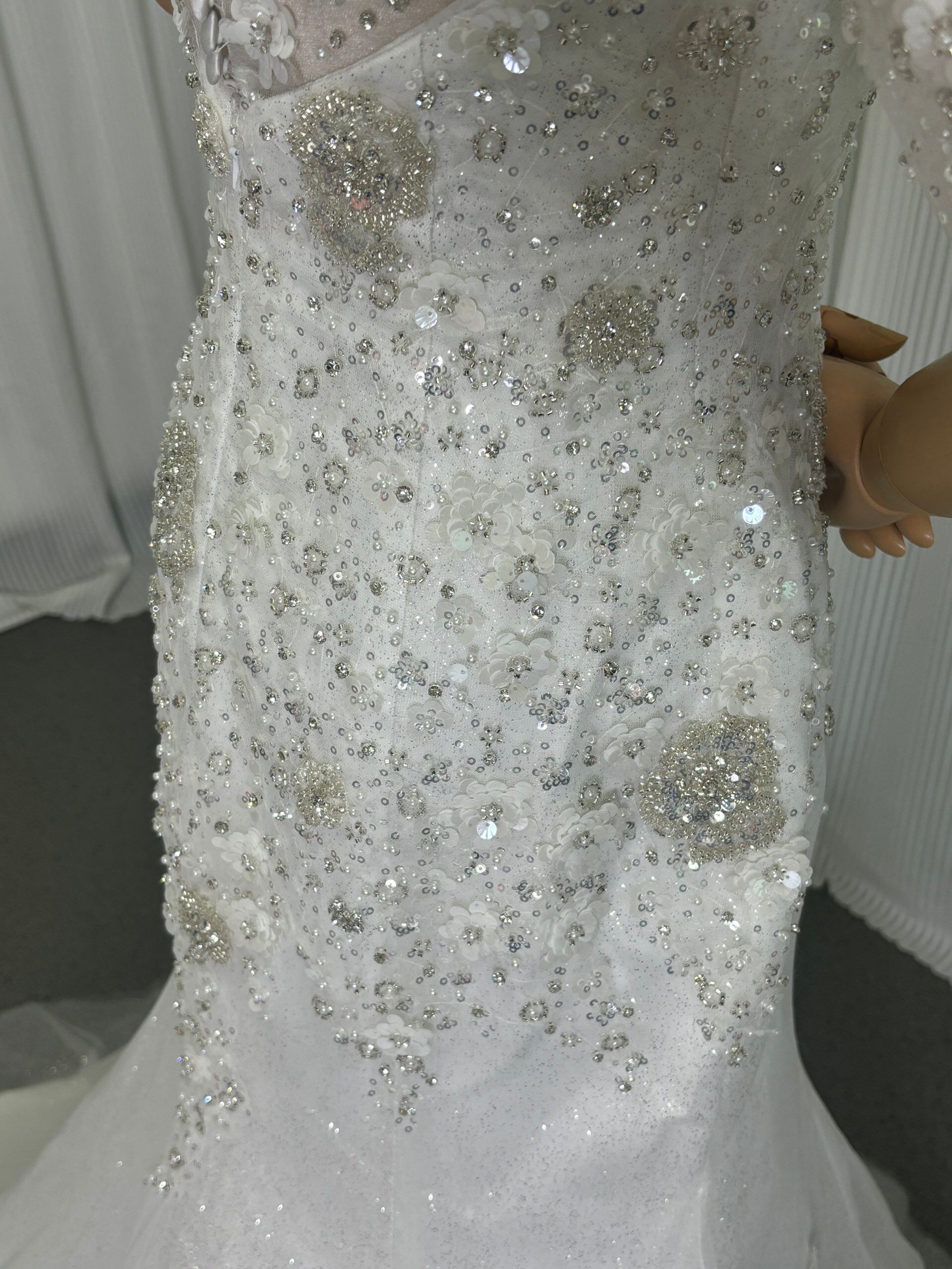 ウエディングドレス 3D立体レース刺繍 半袖 キラキラグリッターチュール くるみボタン マーメイド /結婚式