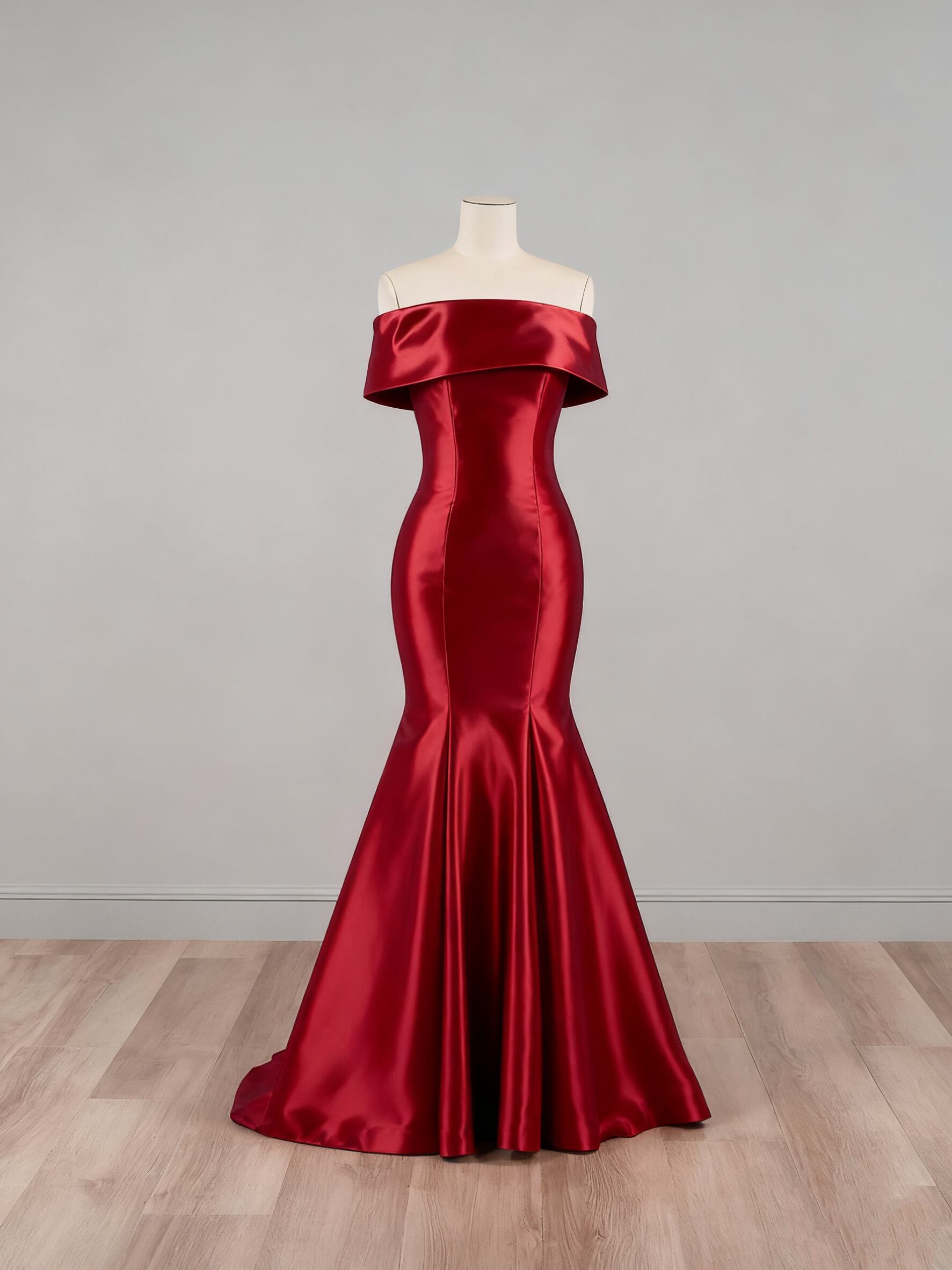 カラードレス オフショルダー ワインレッド マーメイドライン 光沢サテン 優雅なシルエット 前撮り