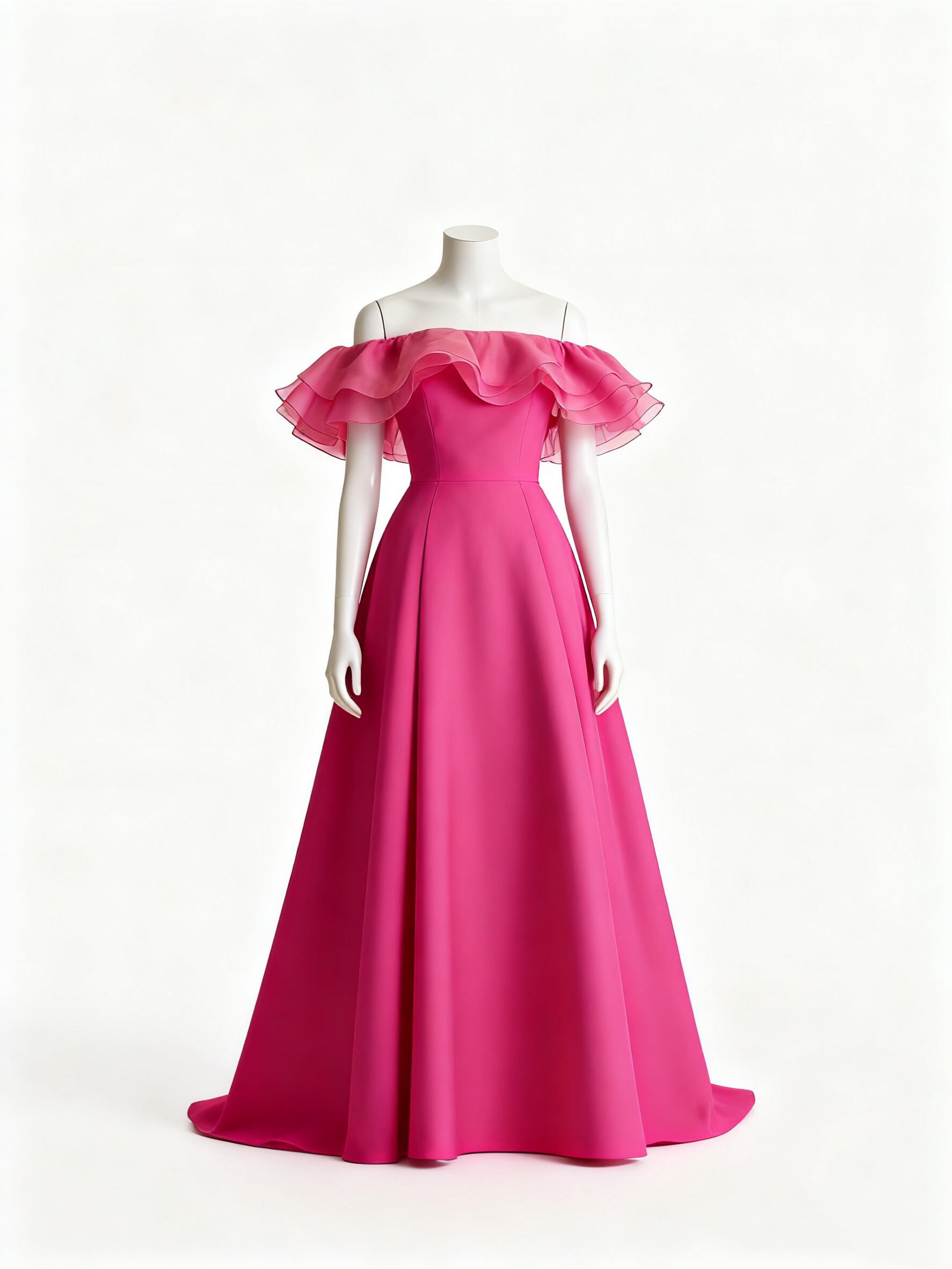 カラードレス ビビッドピンク オフショルダー Aライン 披露宴 抜群におしゃれ度が際立つ ふわふわ袖