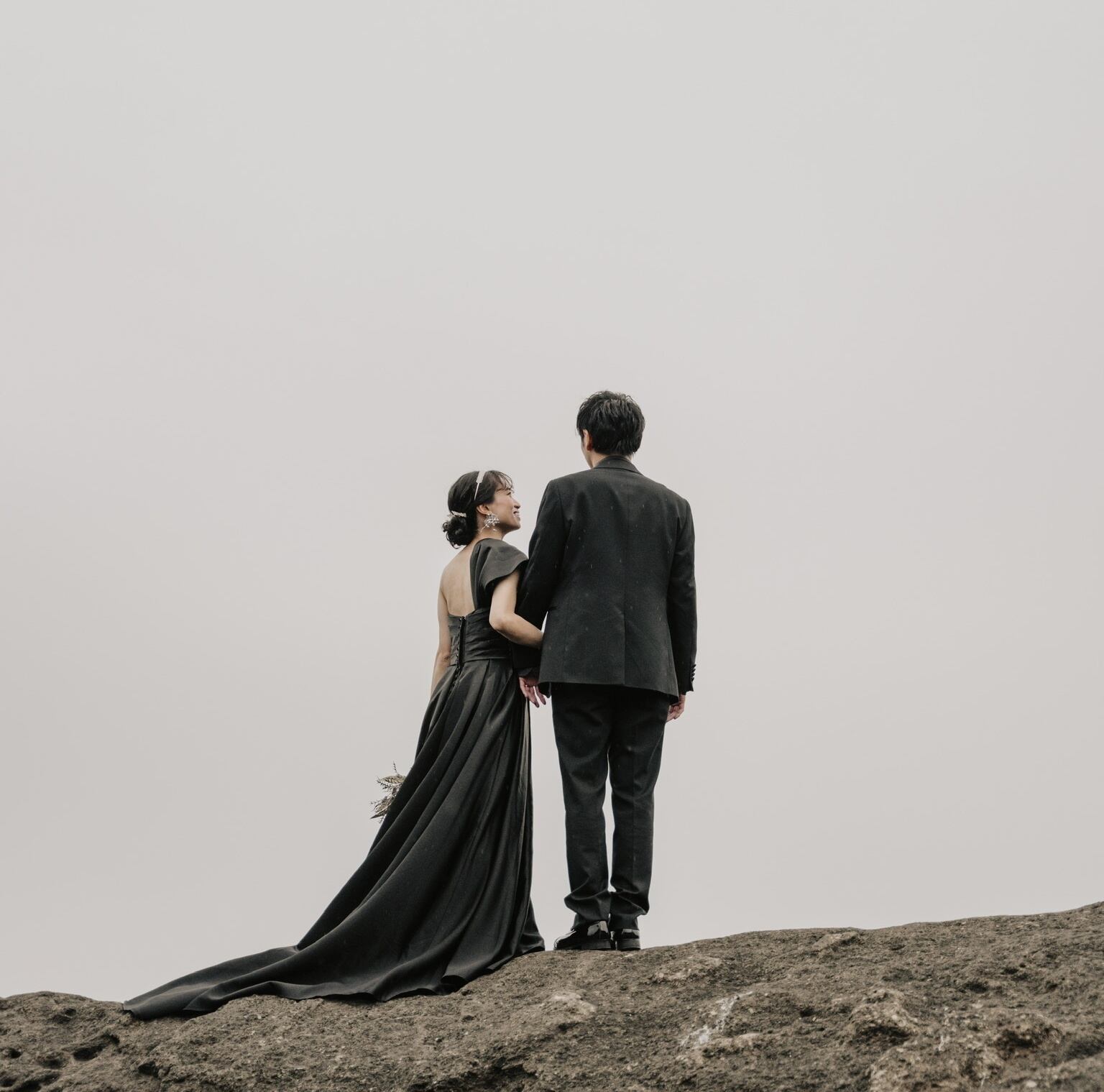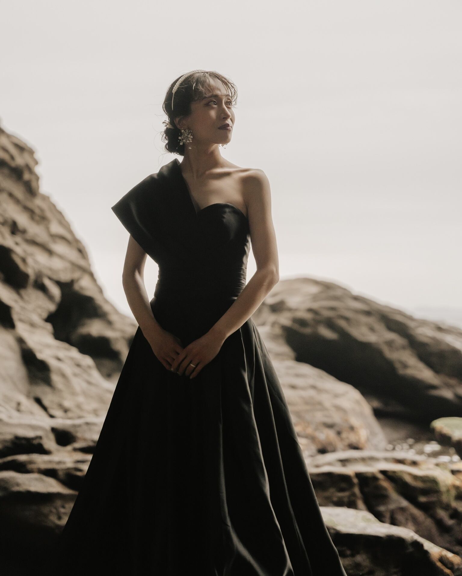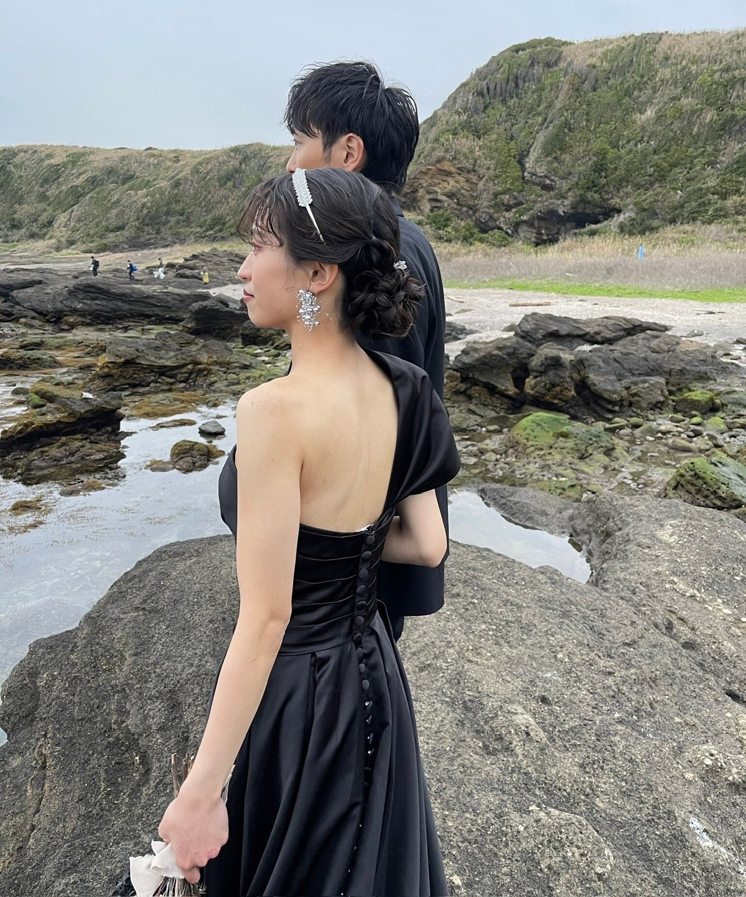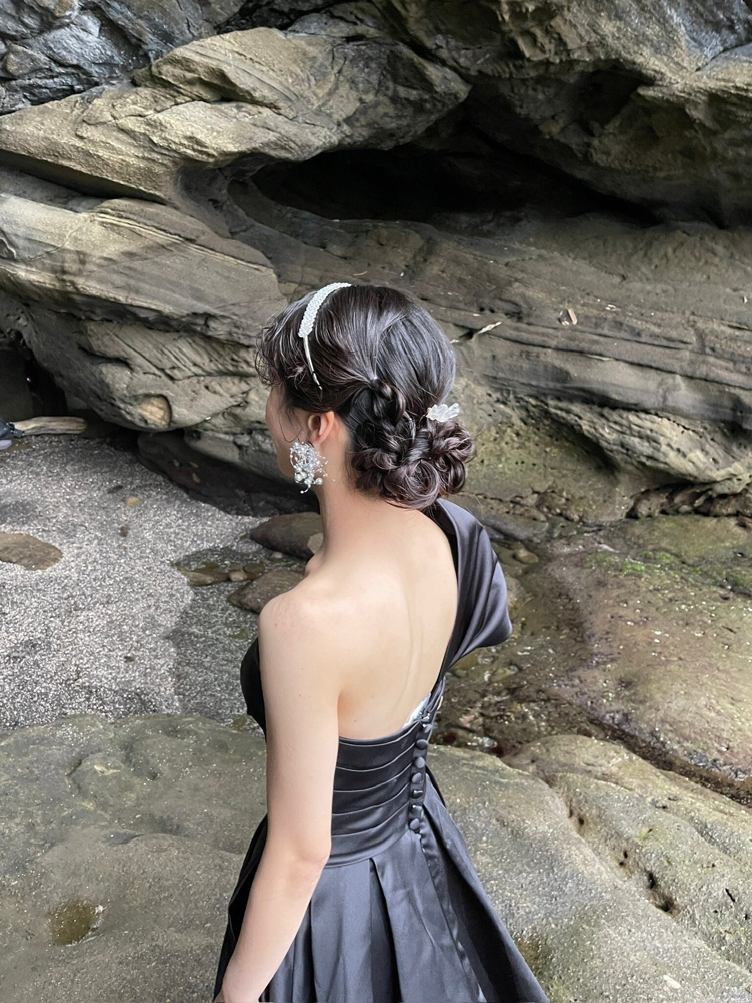 実例写真!パーティードレス 光沢サテン 前撮り ワンショルダー くるみボタン ブラック 演奏会/音楽会
