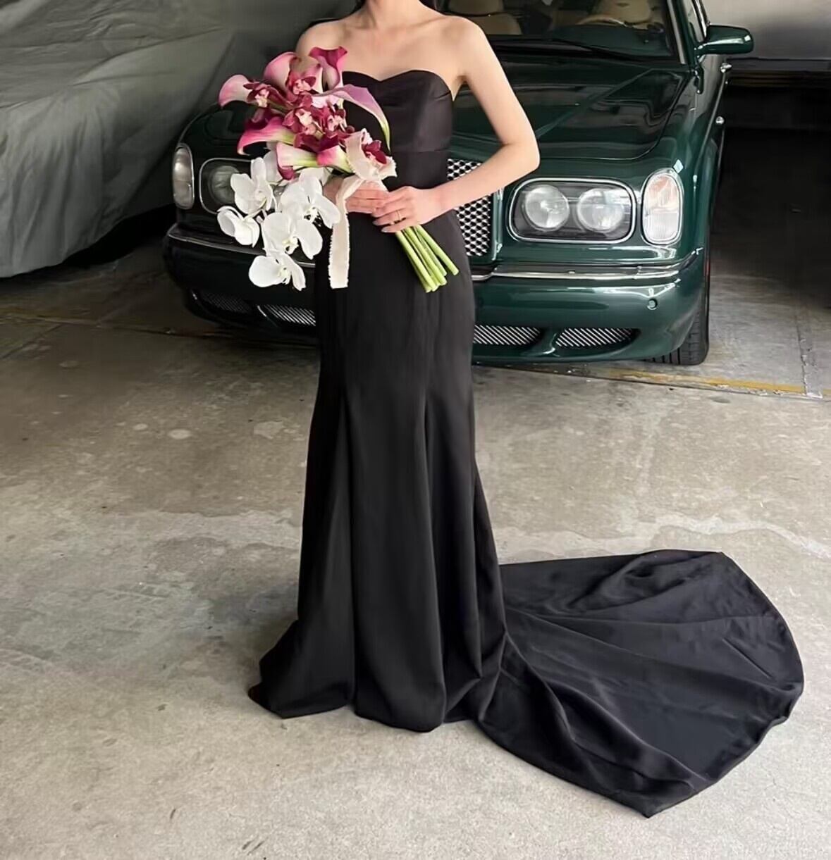 コピー:実例写真!パーティードレス 光沢サテン 前撮り ワンショルダー くるみボタン ブラック 演奏会/音楽会