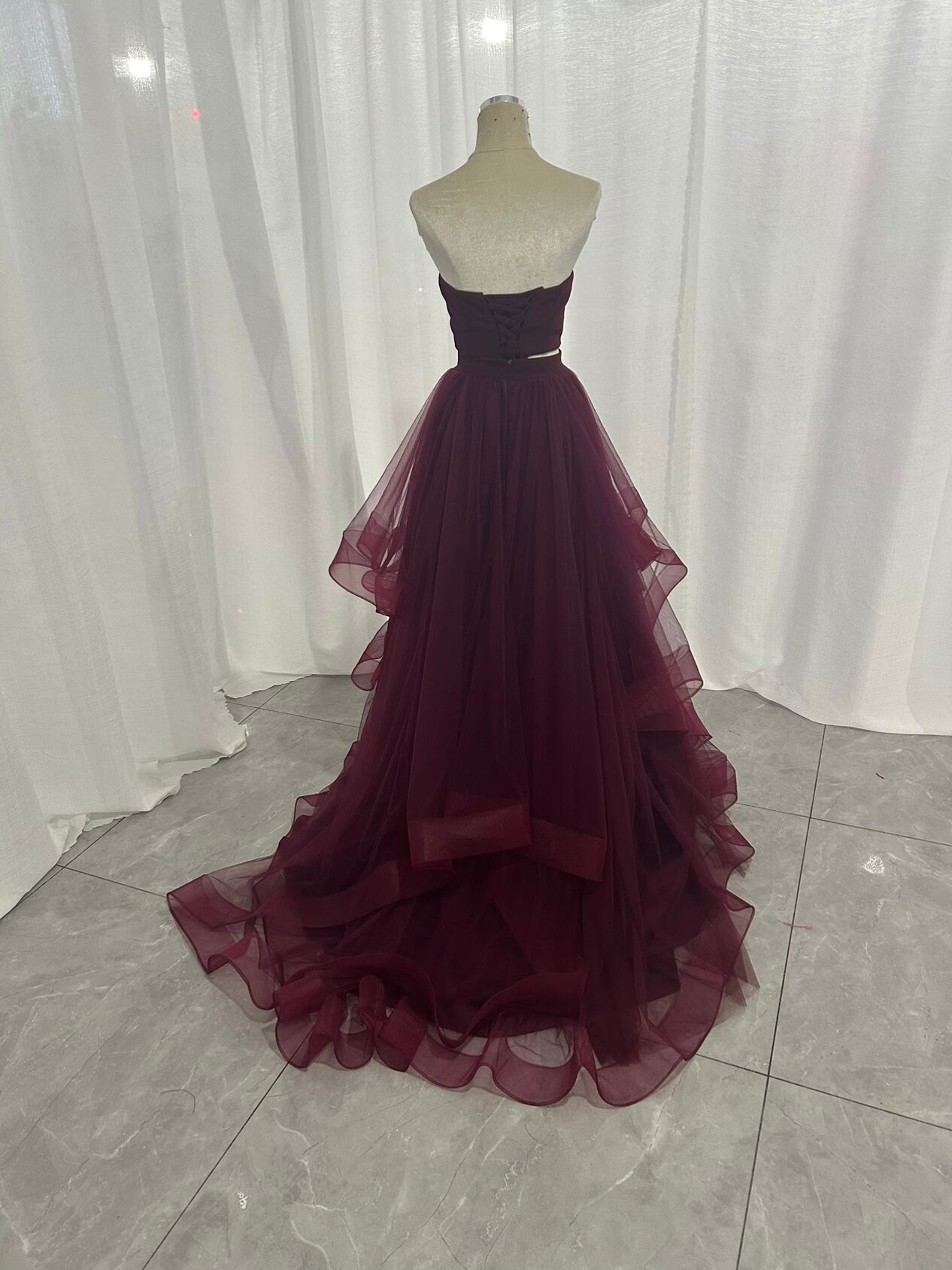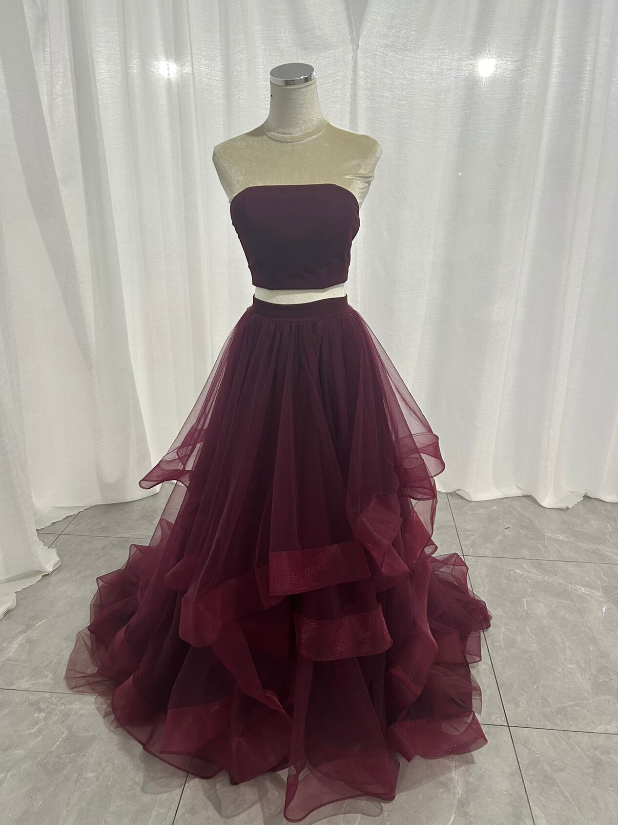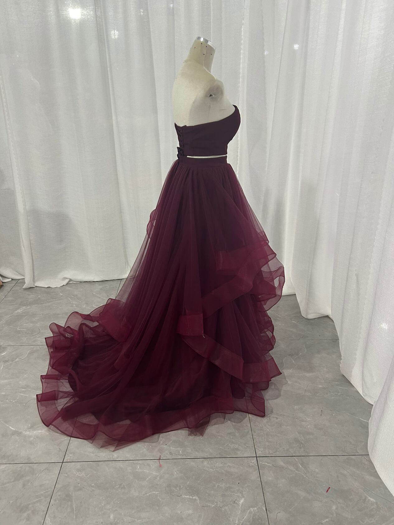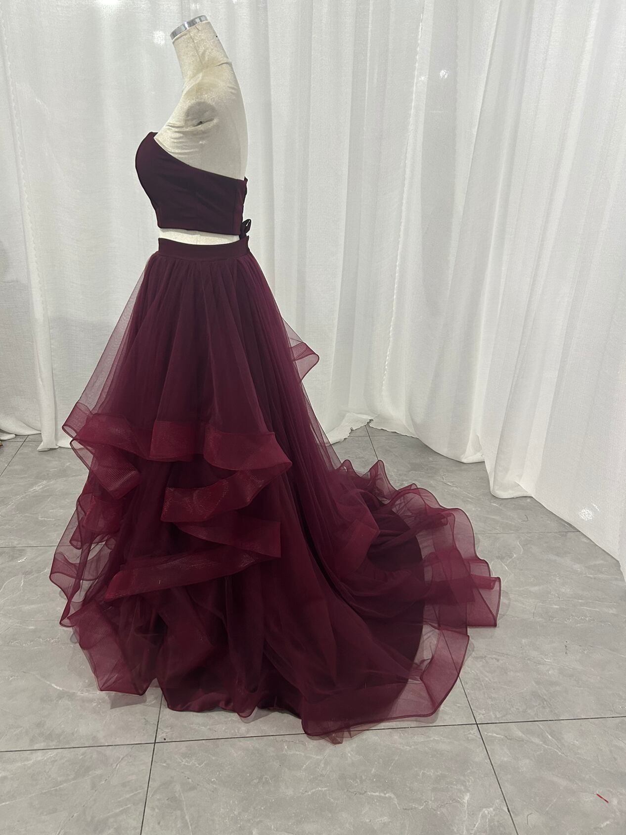 カラードレス ツーピース えんじ色 ベアトップ ラッフルフリル  アシンメトリースカート 前撮り