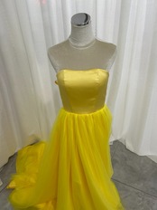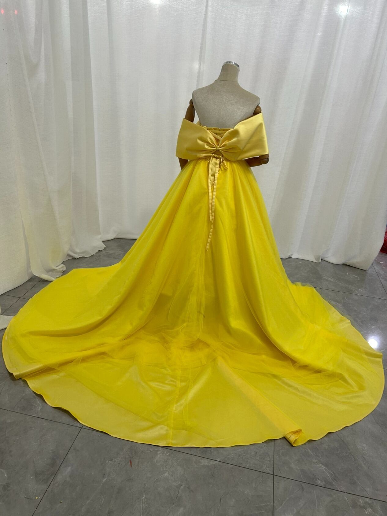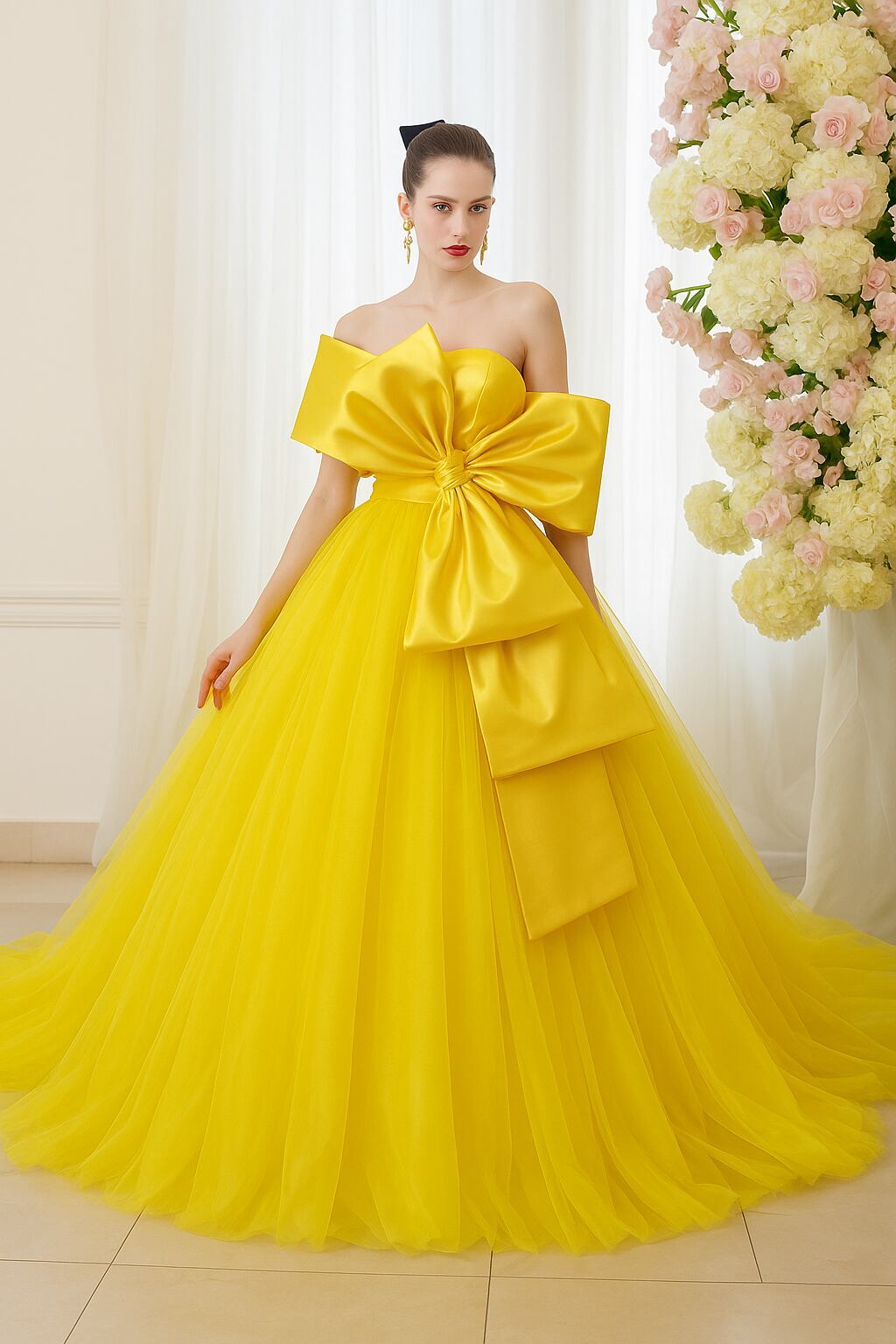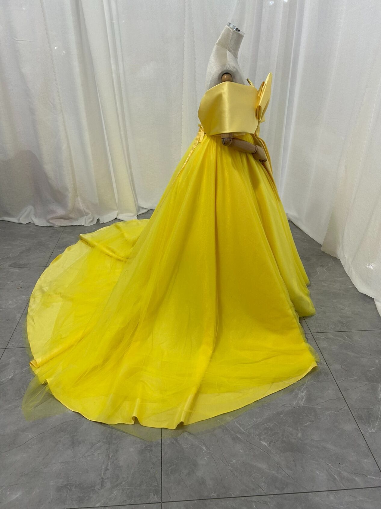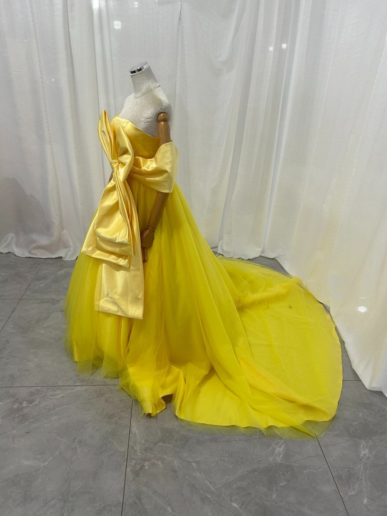 カラードレス イエロー リボン 取り外し可能な付け袖 ビスチェタイプ 花嫁 プリンセスライン
