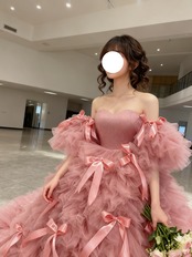 カラードレス ピンク プリンセスライン もこもこドレス リボン ブライダル 可愛い 抜群のおしゃれ見え