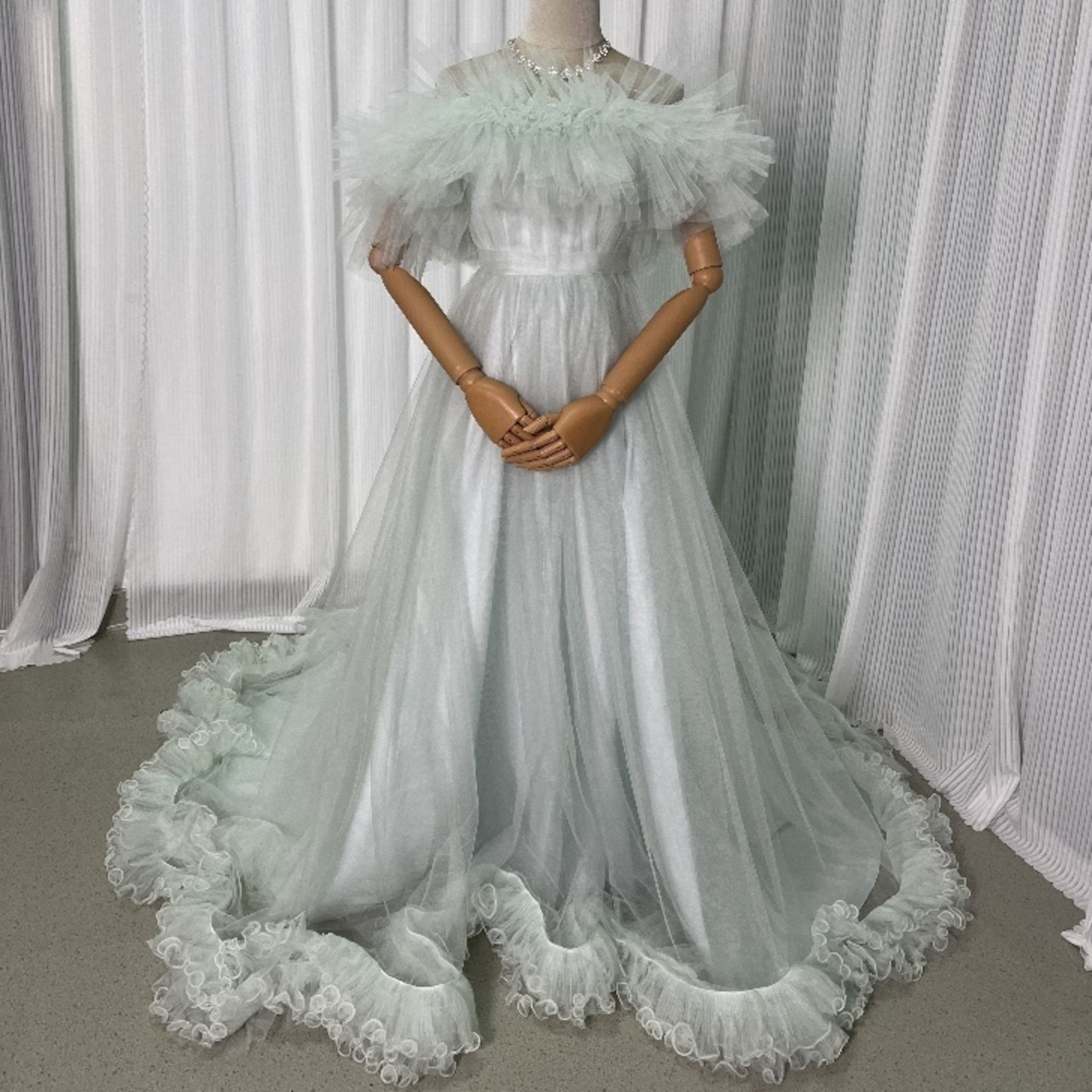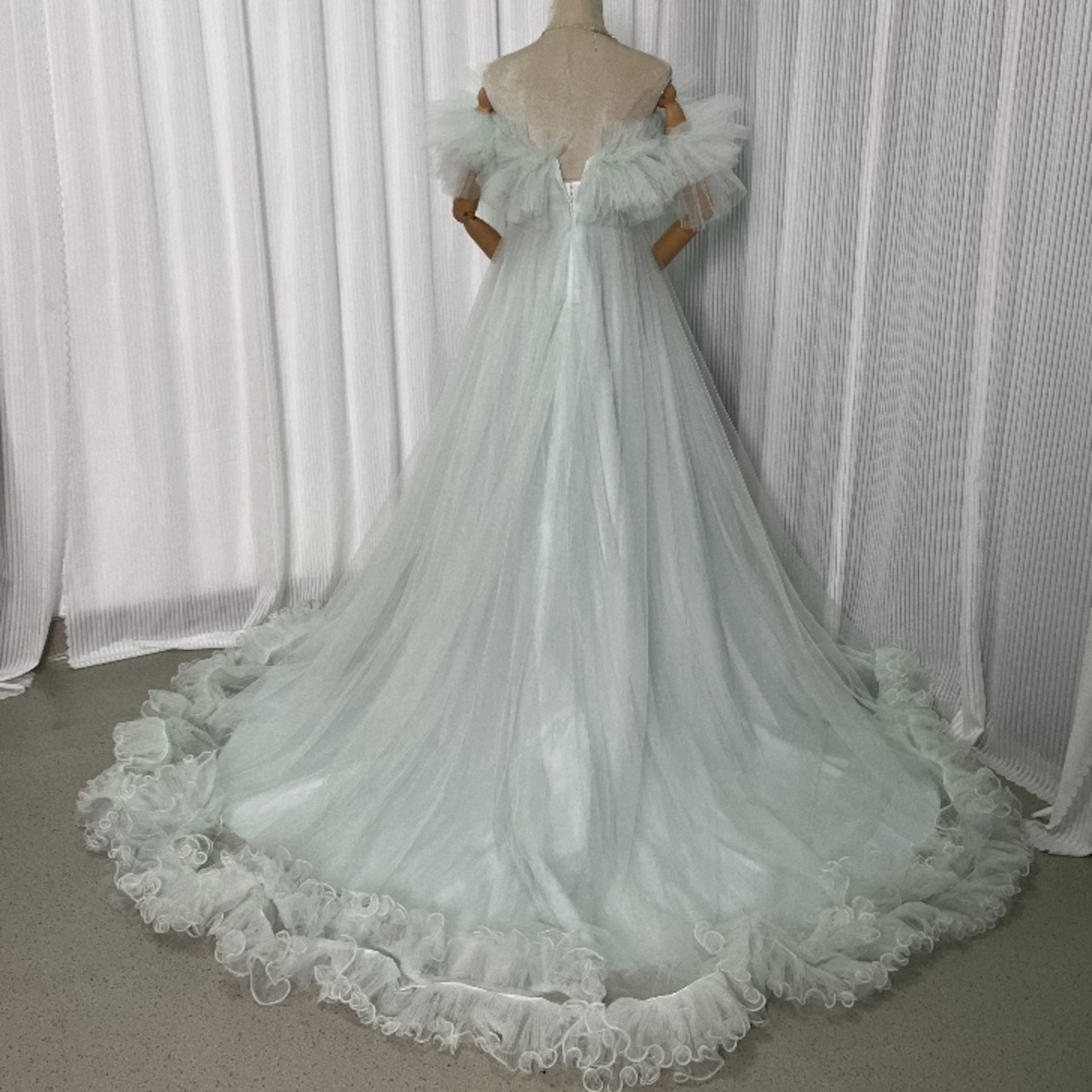 カラードレス 可愛い プリンセスライン グリーン オフショルダー チュールスカート ラッフルフリル 前撮