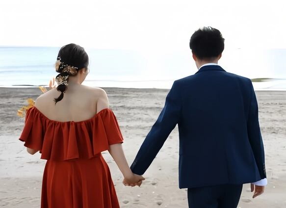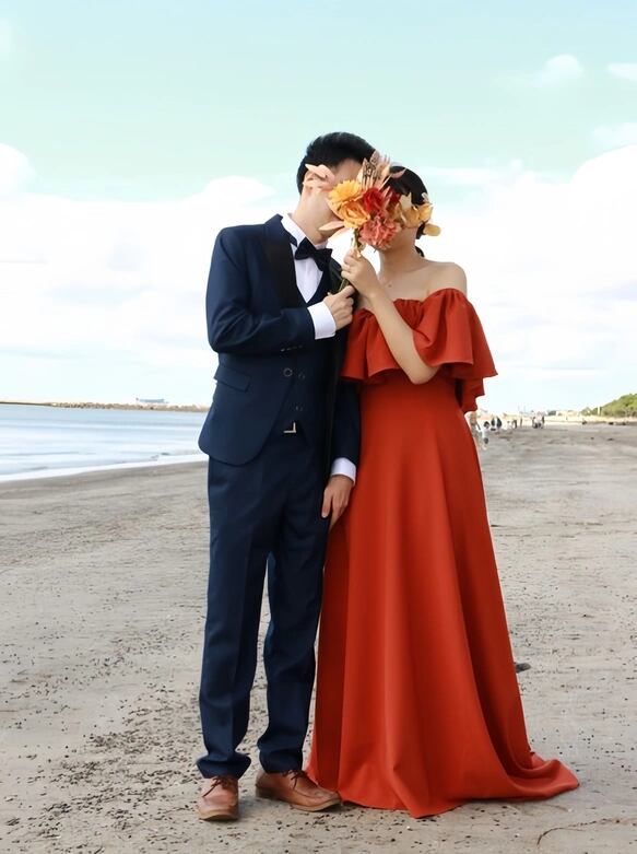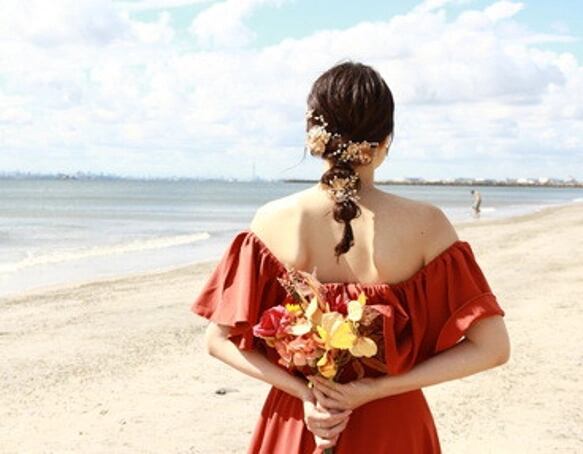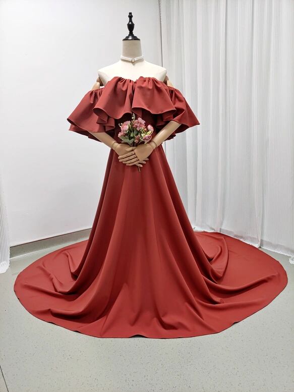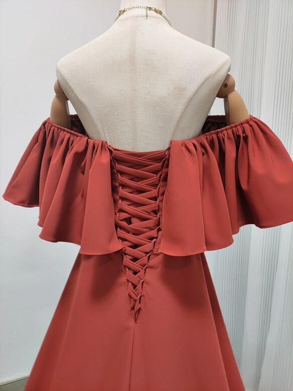 実例写真!パーティードレス テラコッタ色 オフショルダー 編み上げ 前撮り